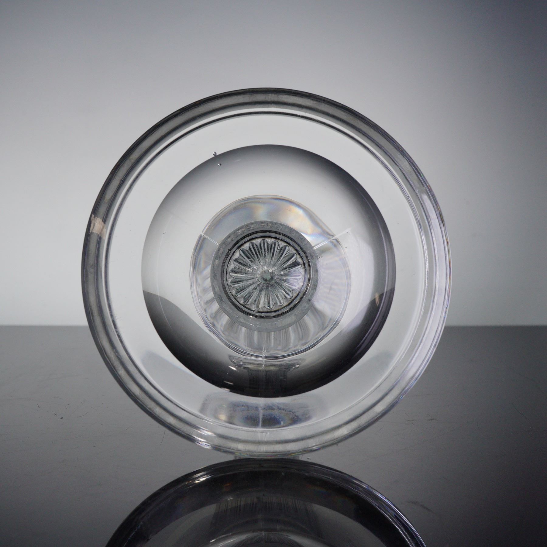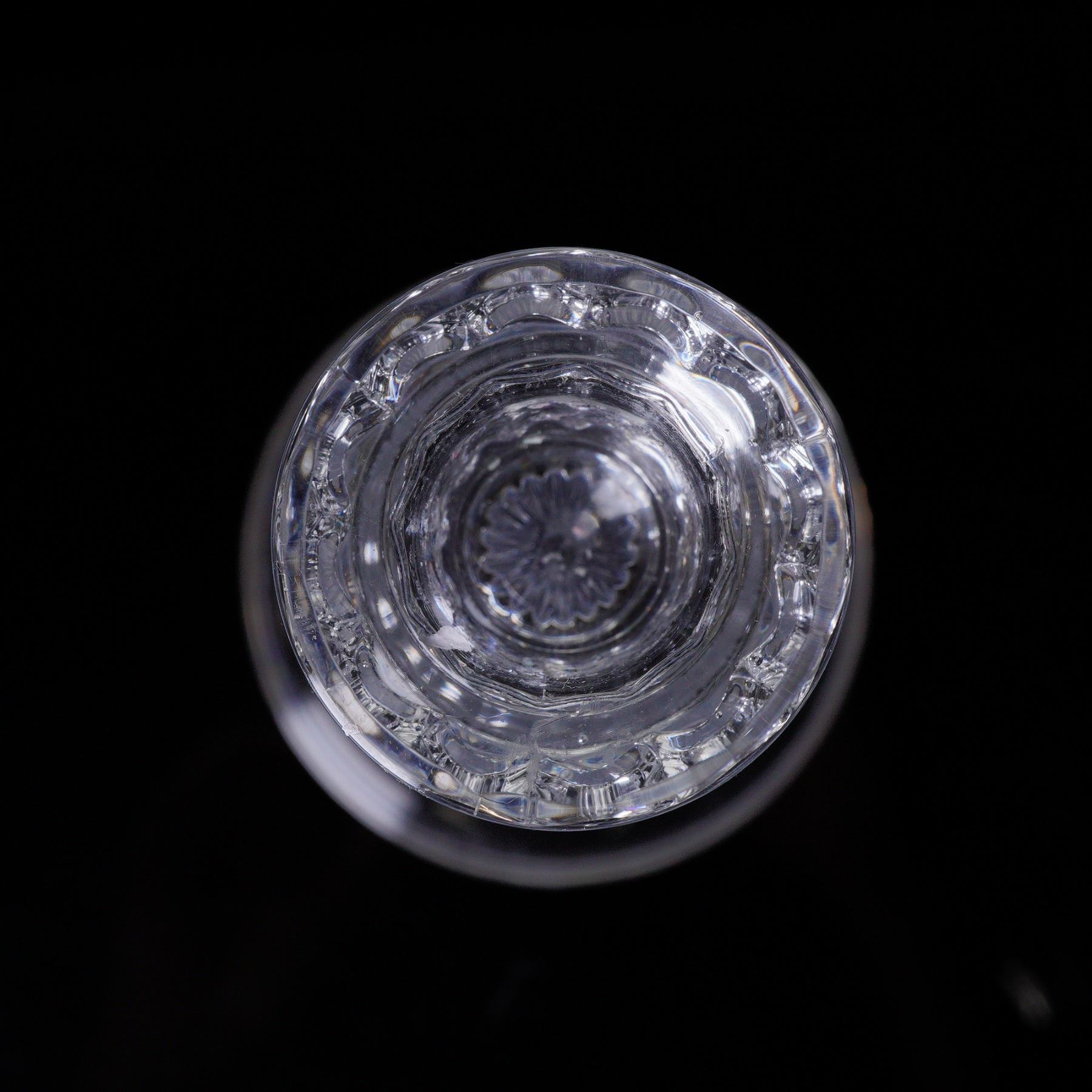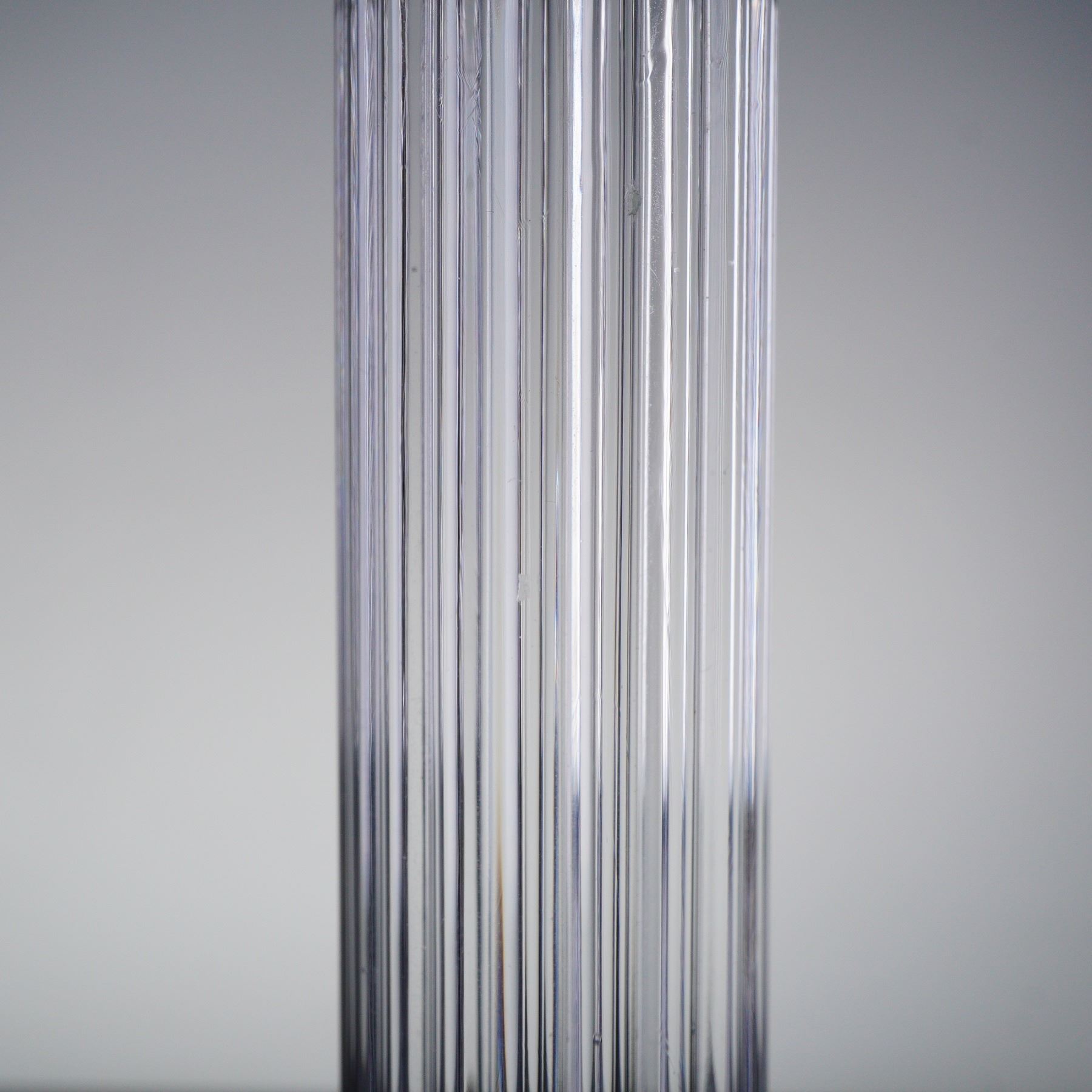This elegant pair of crystal candle holders features a refined columnar form inspired by classical architecture. Each piece is crafted from clear cut glass, the stems fluted vertically to catch and reflect the light with understated brilliance. The circular bases are weighty and domed for stability, finished with a finely cut starburst pattern at the center. The capitals are intricately molded with rounded lobes and a defined lip, designed to hold taper candles securely. Viewed from above, the symmetrical precision and radial detail of the cutting are especially striking, showcasing the skill and balance of their craftsmanship.