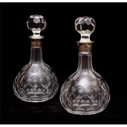 Pair of crystal decanters with unmarked silver-plate spouts. They come in original burgundy and white case as shown. In very good used condition with minor signs of wear. Please ask questions, request additional photos and shipping costs before buying.