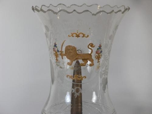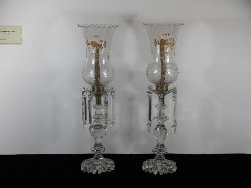(Persia 19th Century) Beveled Fluted tops with painted Persian motif - Lion bearing a Sword, 6 crystal ornaments hang from an elaborate cut base, 24" by 6 1/4", each.