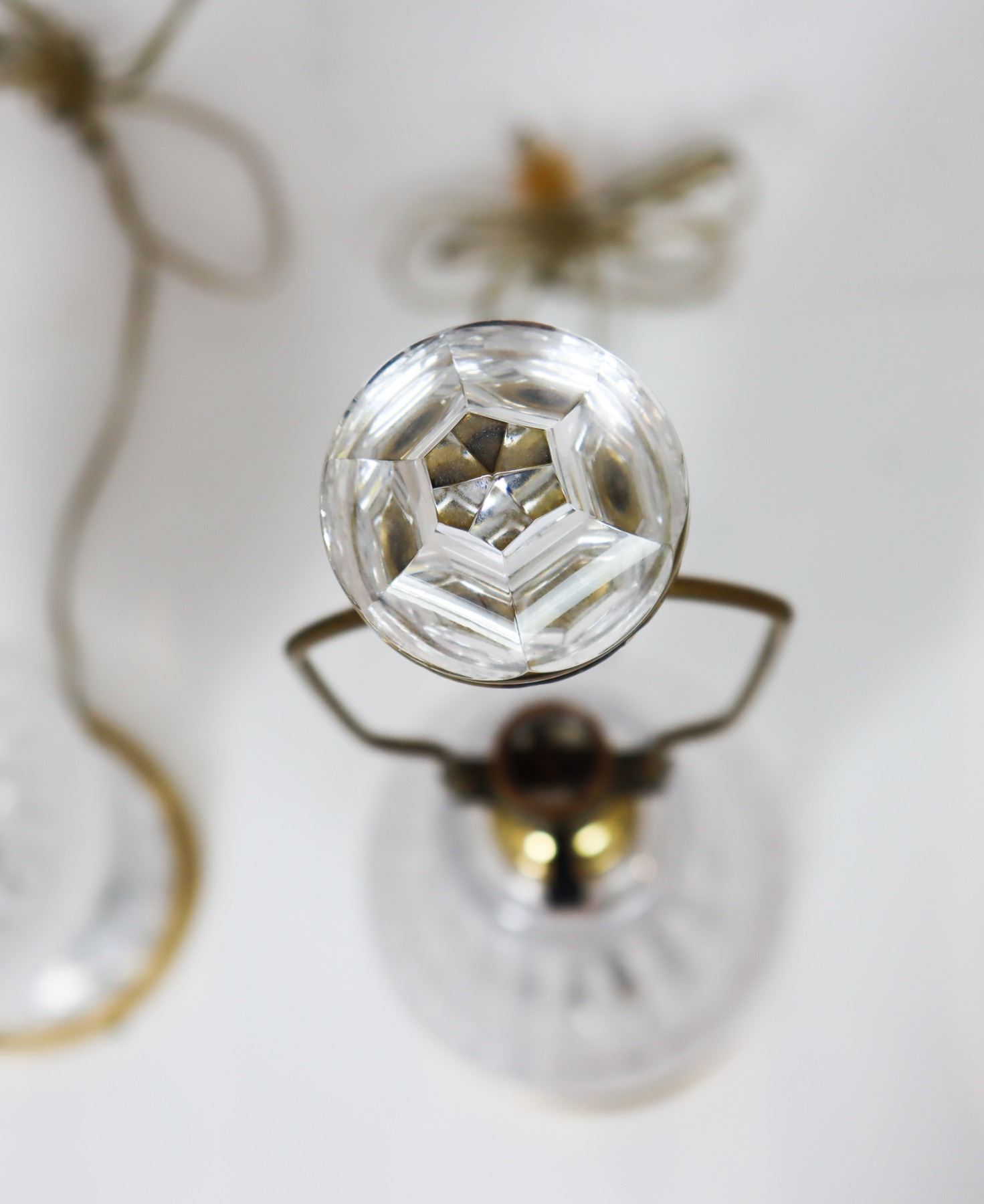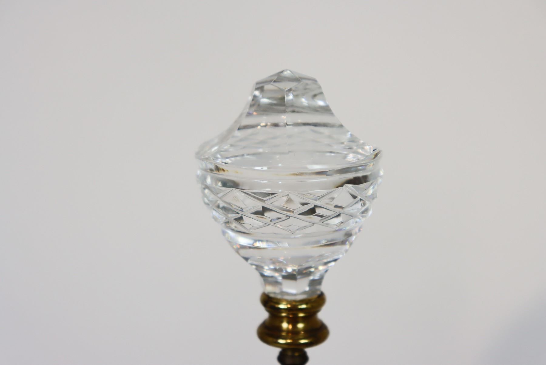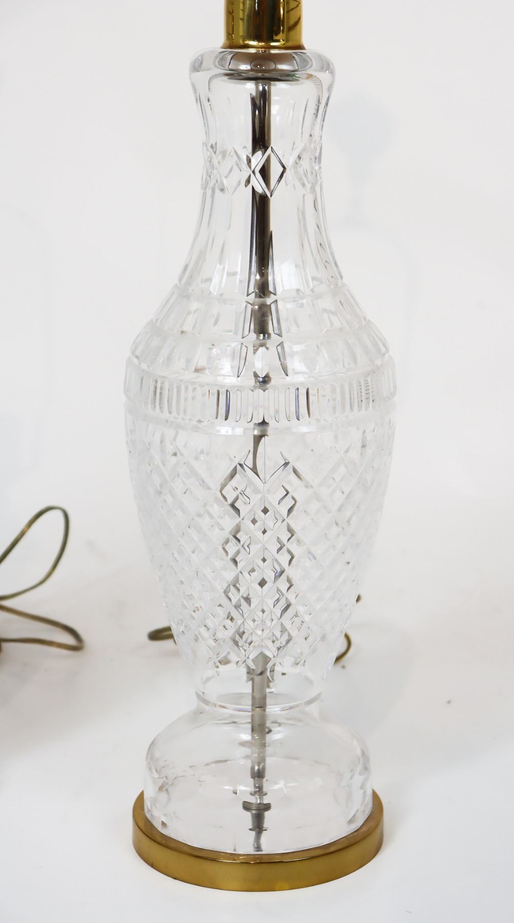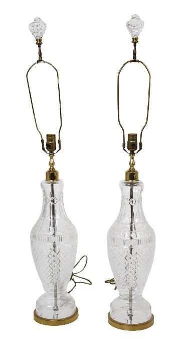 Pair of tall cut glass lamps with brass details. Size: 41 x 8 in.