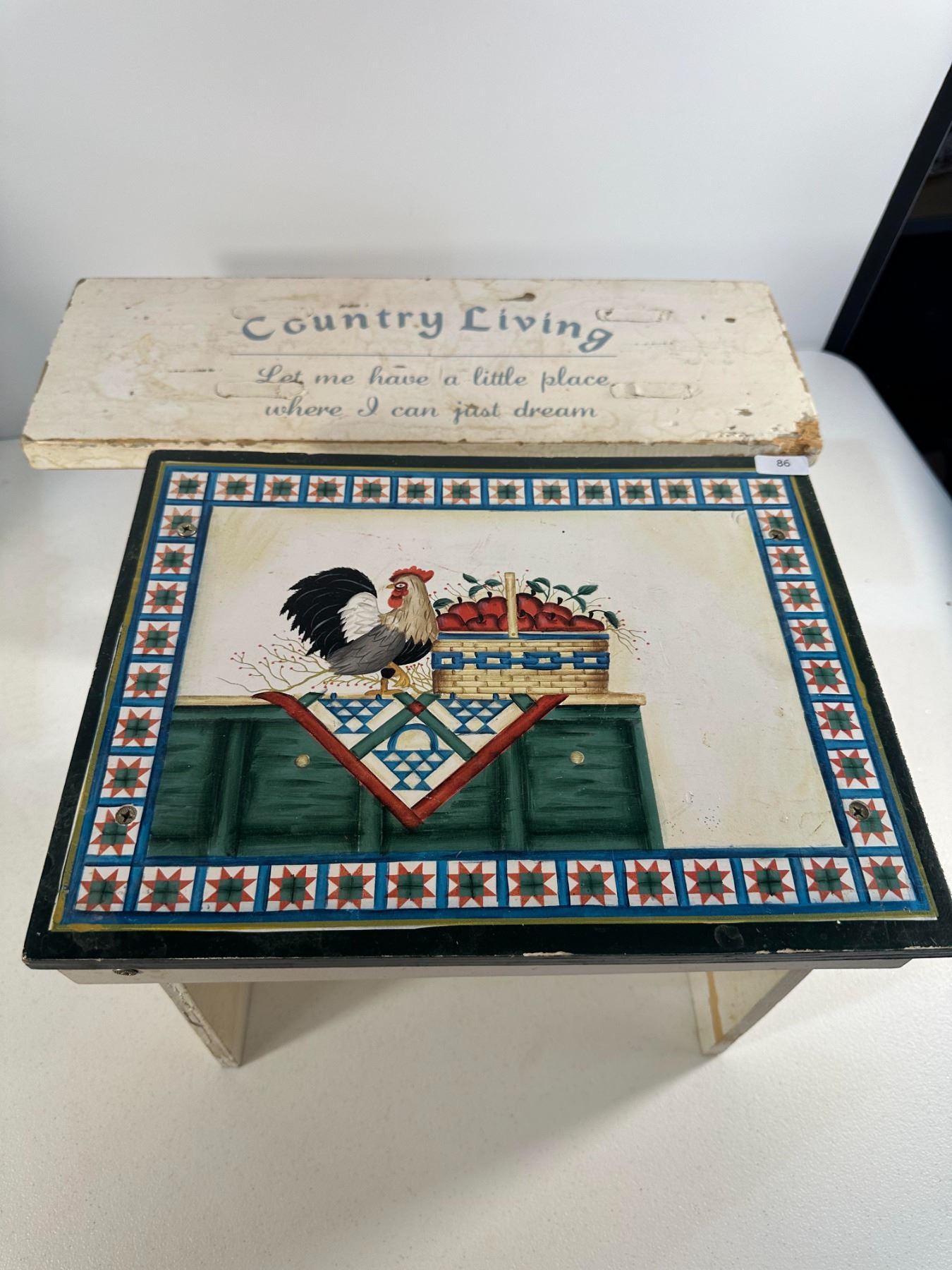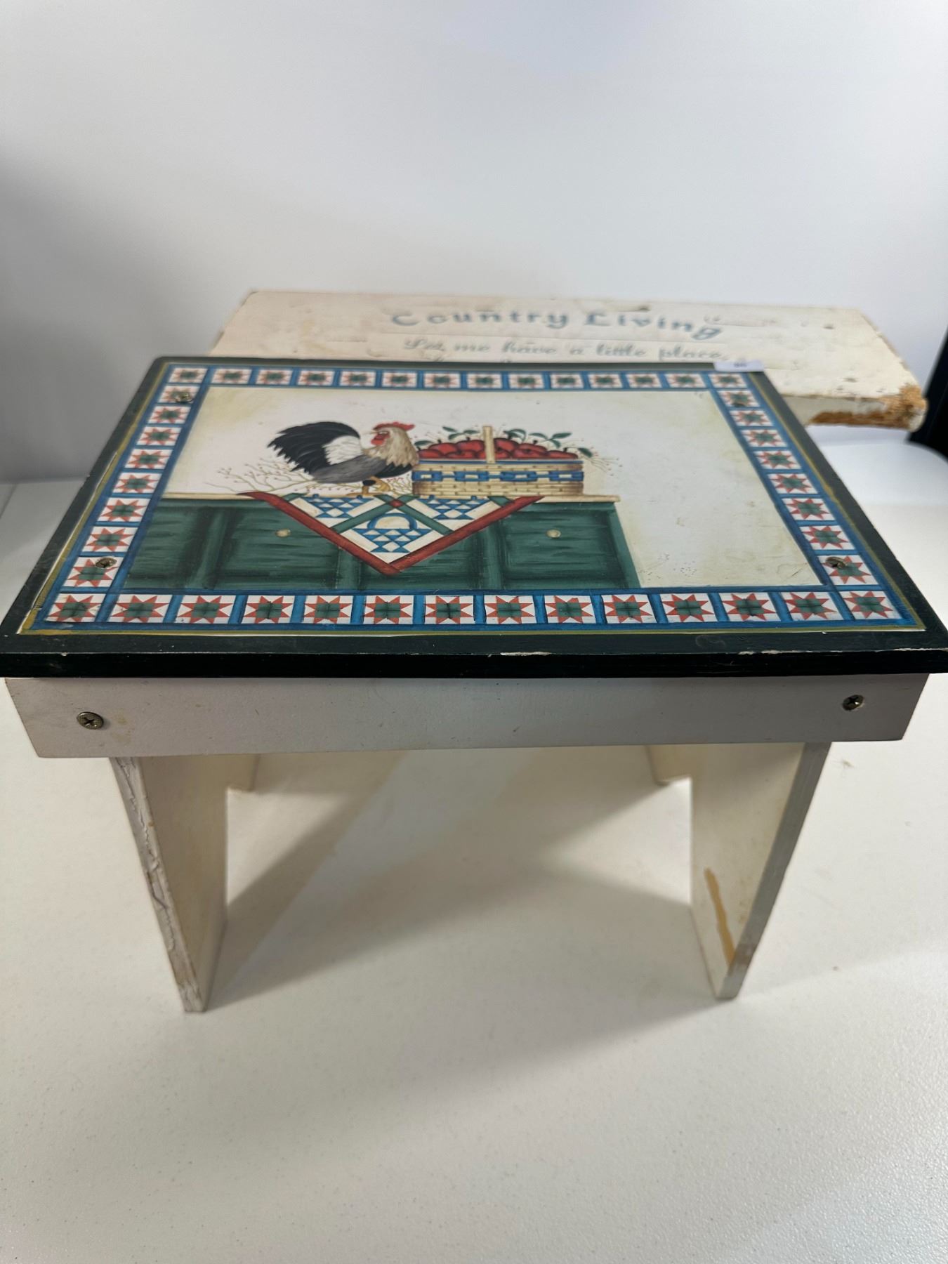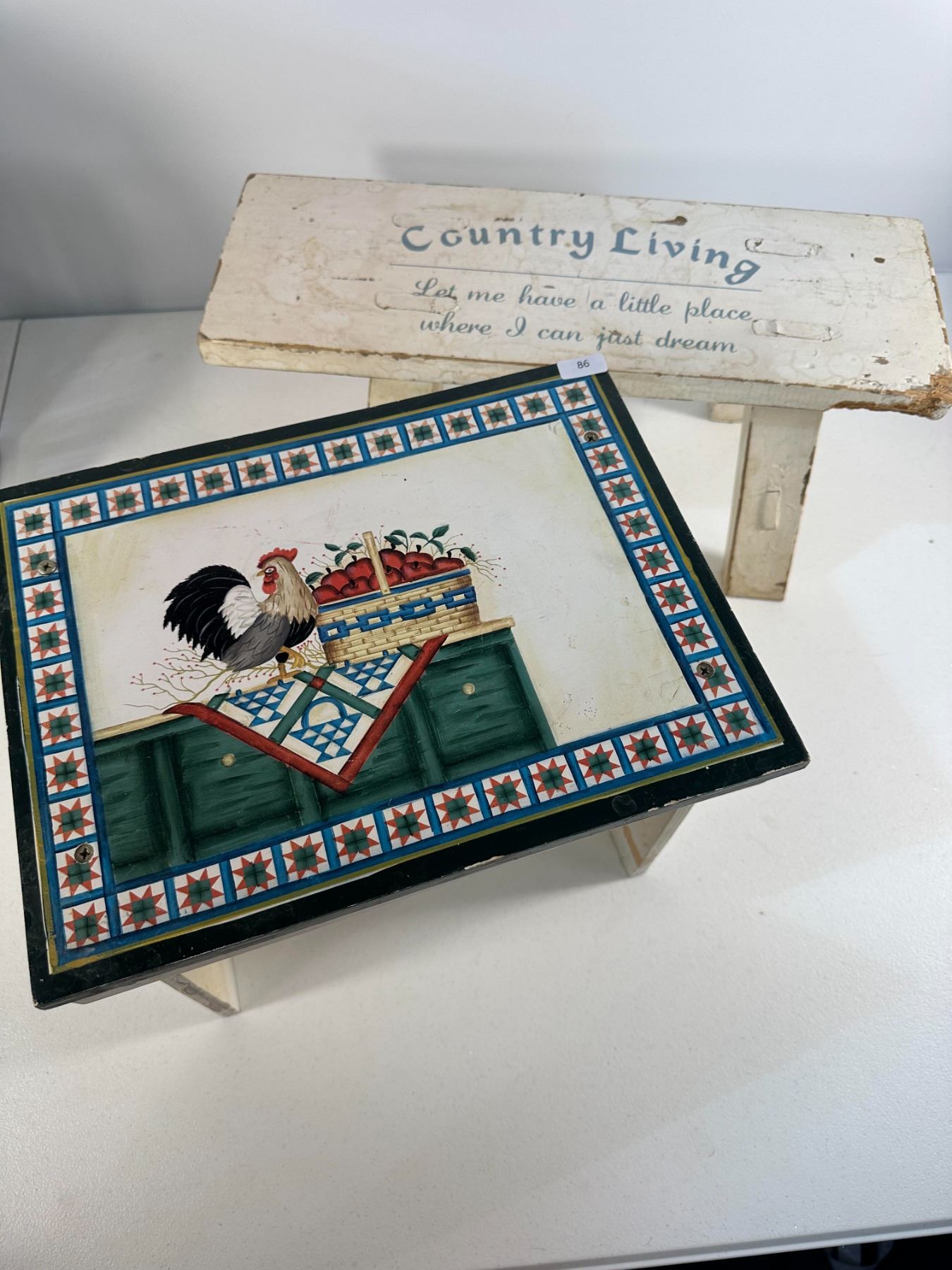 Set of two small wooden stools, including one hand-painted with a rooster and basket of apples in a quilt-pattern border, and another with a distressed 'Country Living' design. Perfect for rustic farmhouse or kitchen décor. Late 20th century. Some wear and paint chipping consistent with age and use.