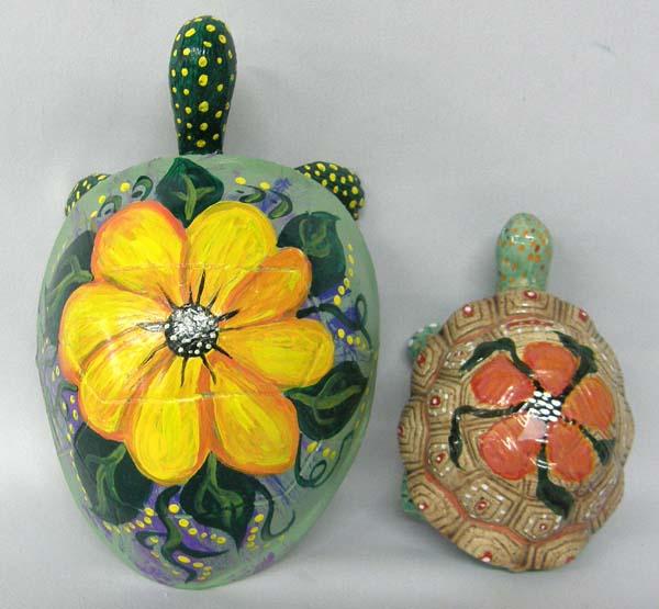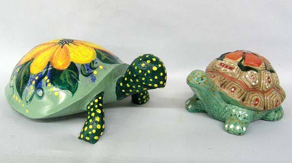 Pair of Decorative Hand Painted Turtles. One is wood and one pottery. The largest turtle measures approx. 3.5''Hx9''Lx6''W. Buyers Pay Actual Shipping and Handling Charges(see terms and conditions for more information).