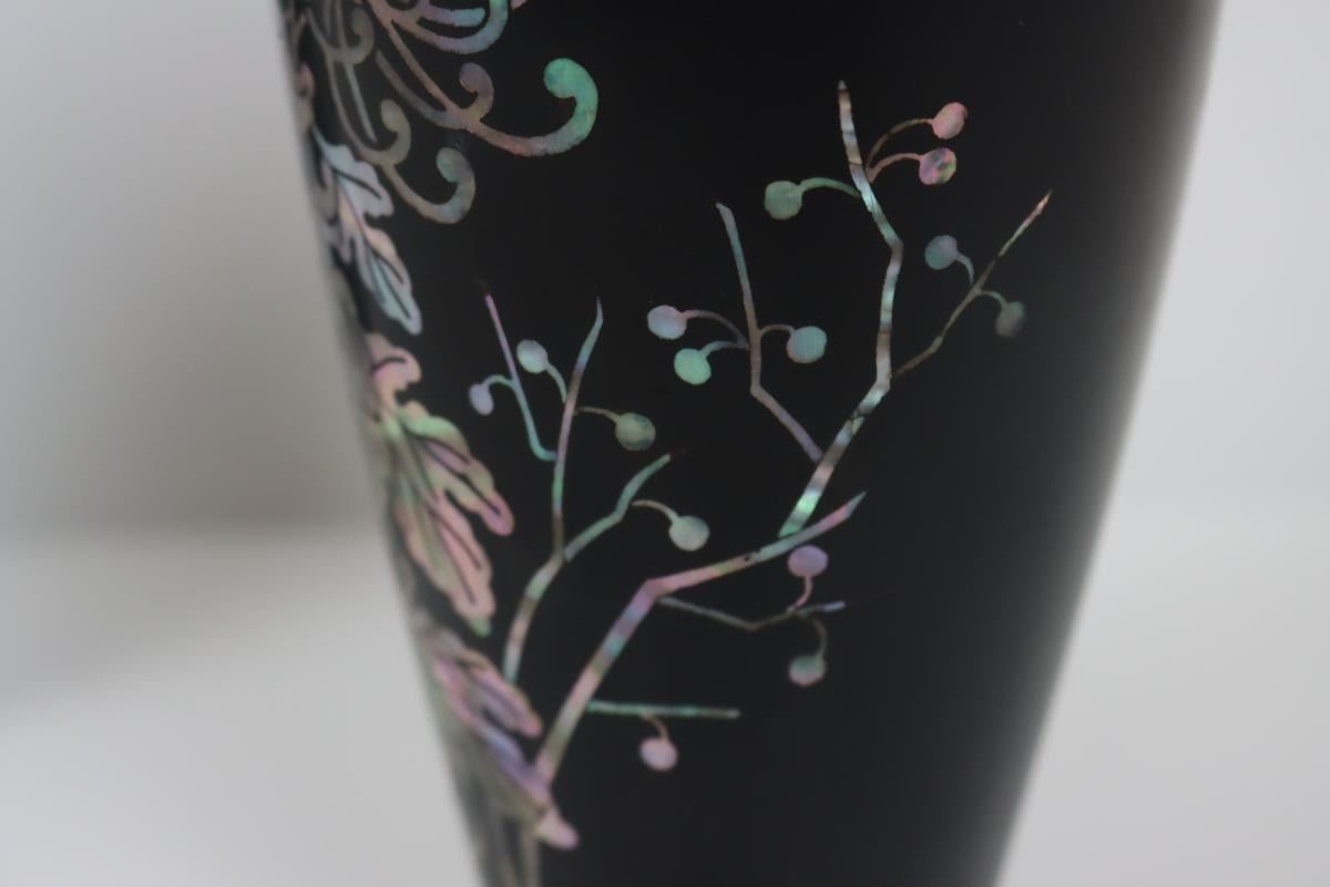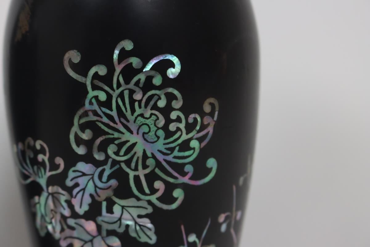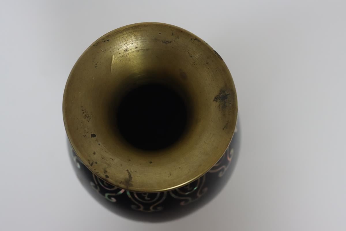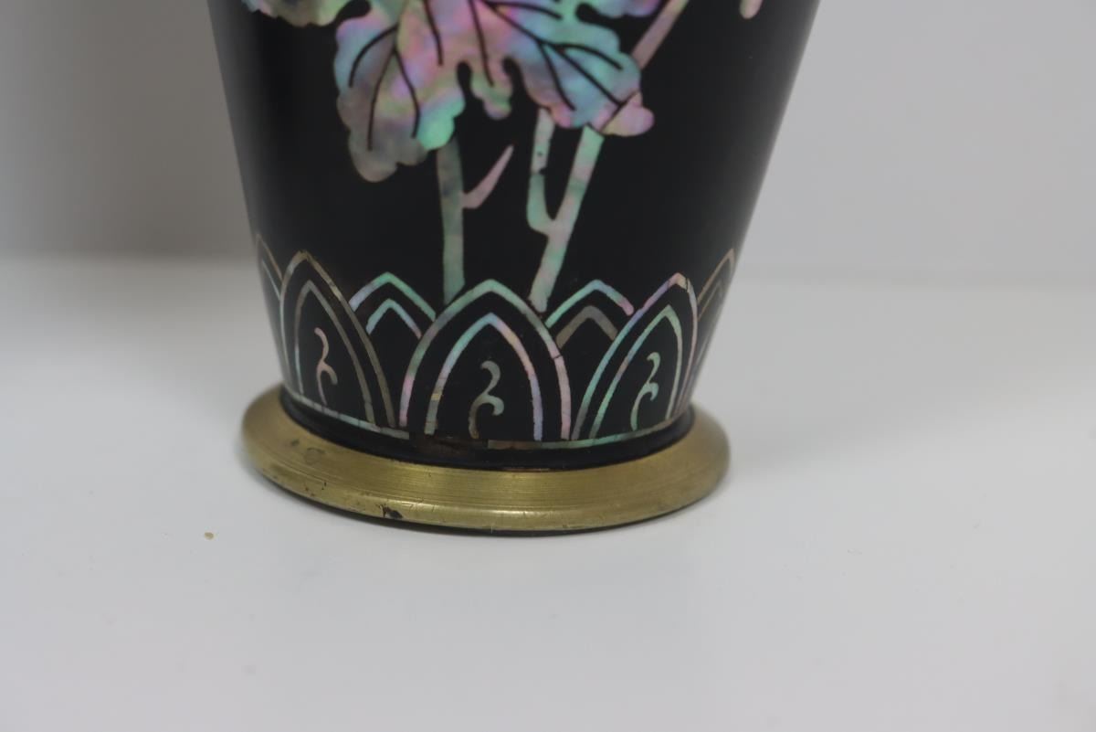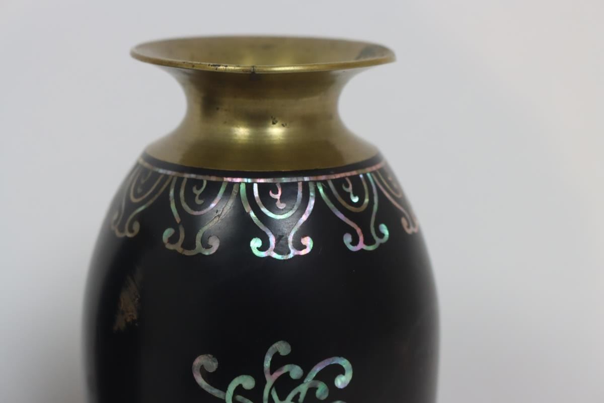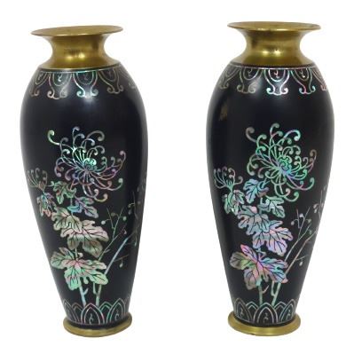 Two small brass/bronze vases, appearing to be lacquered and with floral mother of pearl inset design.
