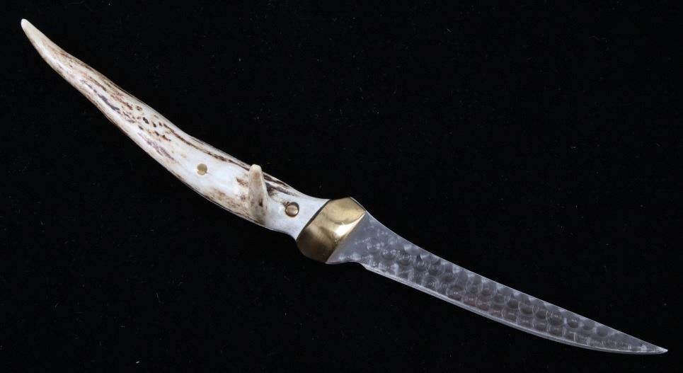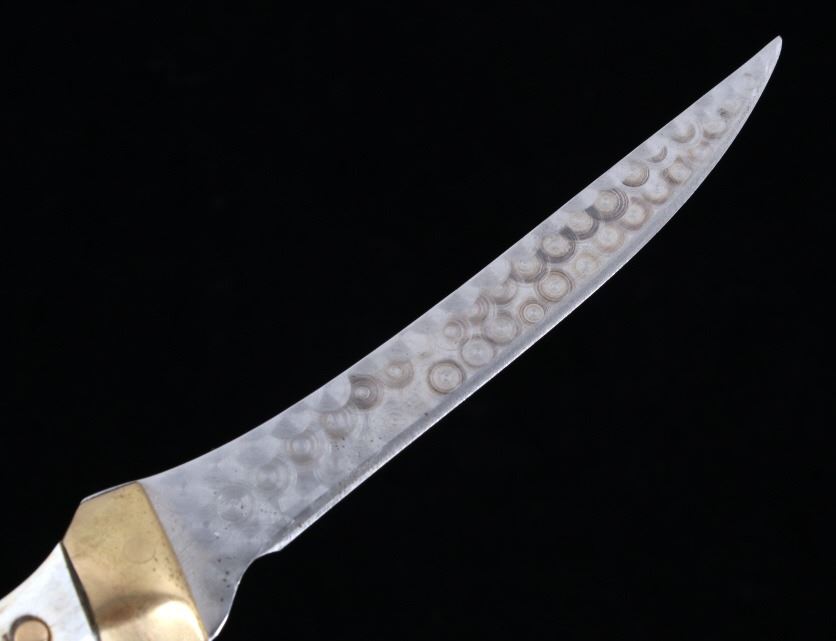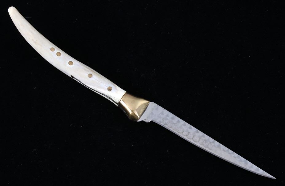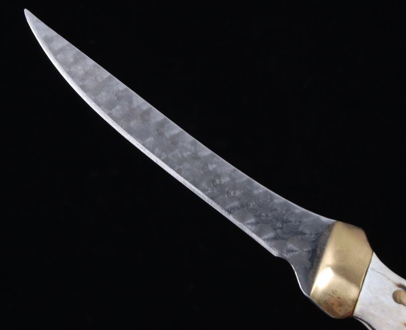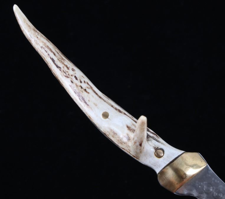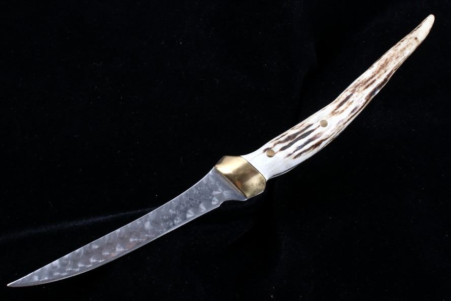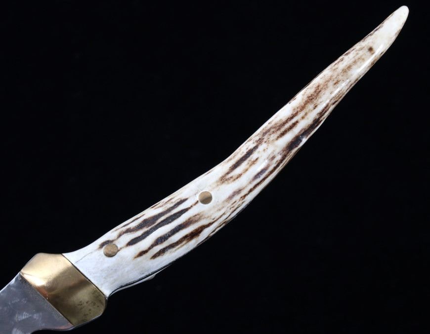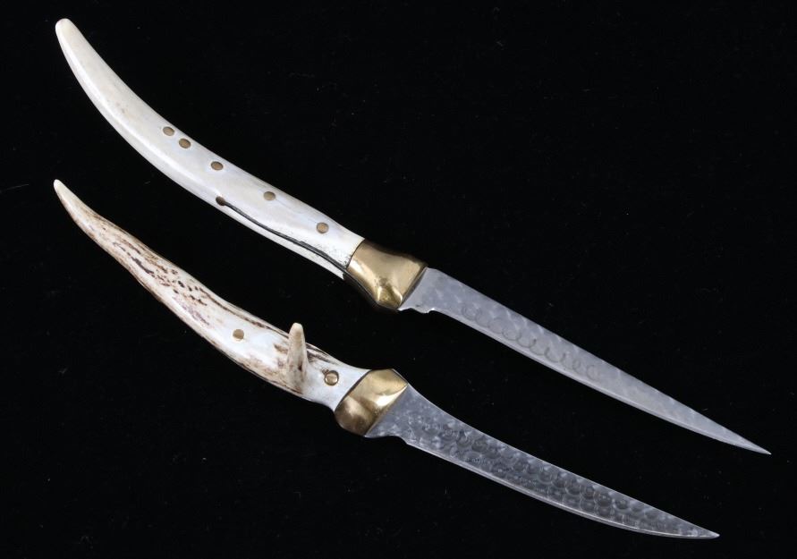 Included in this lot we have a set of stainless steel and deer antler handle fillet knives. The knives display stainless steel construction with long and thin fillet style single edged blades. The handles show deer antler tines set with brass pins and bolsters. The knives show a distinct circular pattern across the blades. The pieces show good condition overall with some light wear due to use. The first knife measures 9 1/2" long with a 4 1/2" long blade and the second knife measures 8 1/2" long with a 3 3/4" long blade.