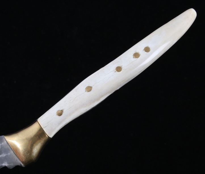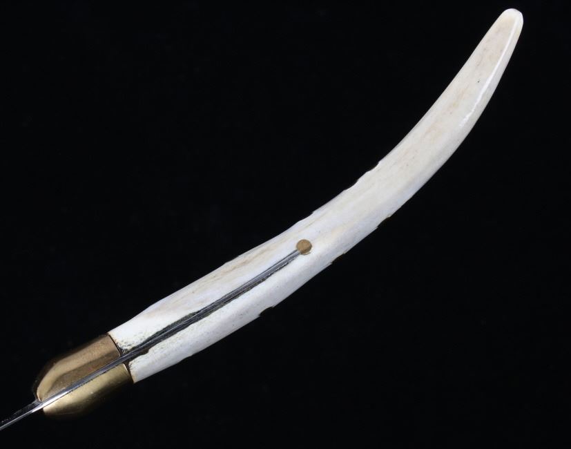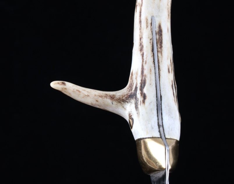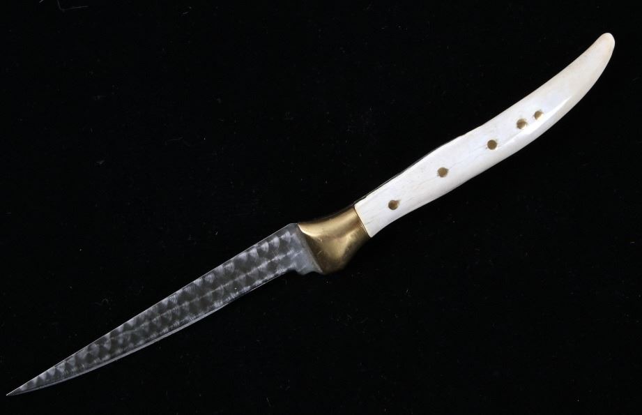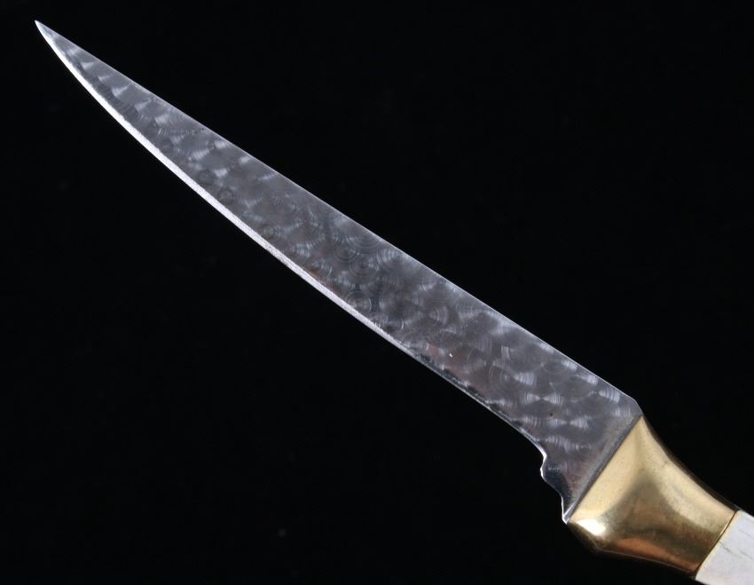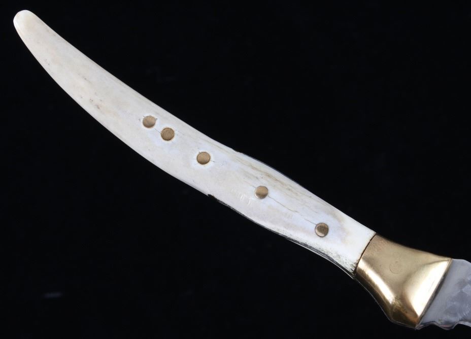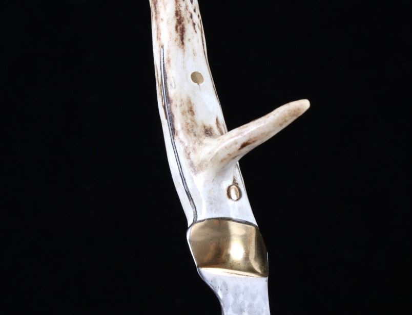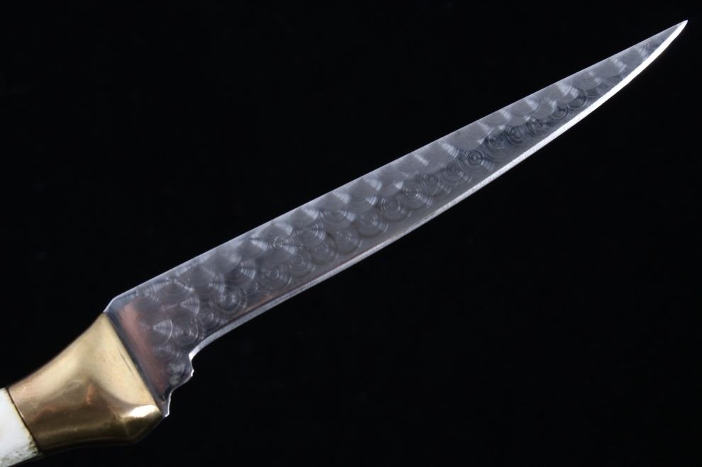 Included in this lot we have a set of stainless steel and deer antler handle fillet knives. The knives display stainless steel construction with long and thin fillet style single edged blades. The handles show deer antler tines set with brass pins and bolsters. The knives show a distinct circular pattern across the blades. The pieces show good condition overall with some light wear due to use. The first knife measures 9 1/2" long with a 4 1/2" long blade and the second knife measures 8 1/2" long with a 3 3/4" long blade.