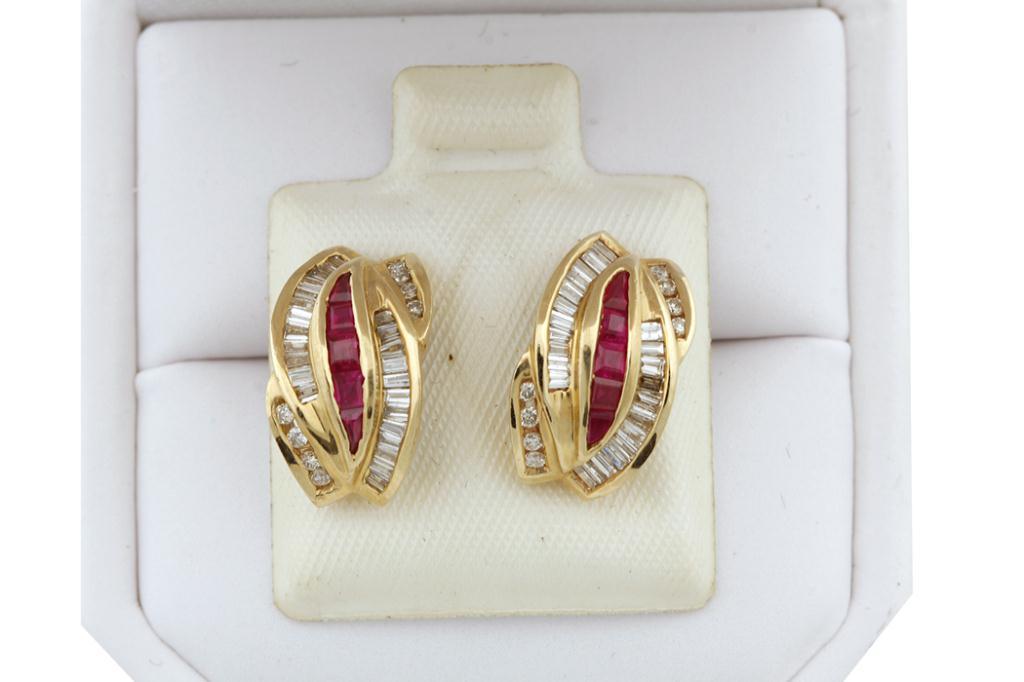 Pair of Diamond & Ruby Earrings 1.20Ct Diamonds T/W and .71Ct Ruby's set in 14K YG.1.20Ct Diamonds T/W and .71Ct Ruby's set in 14K YG.