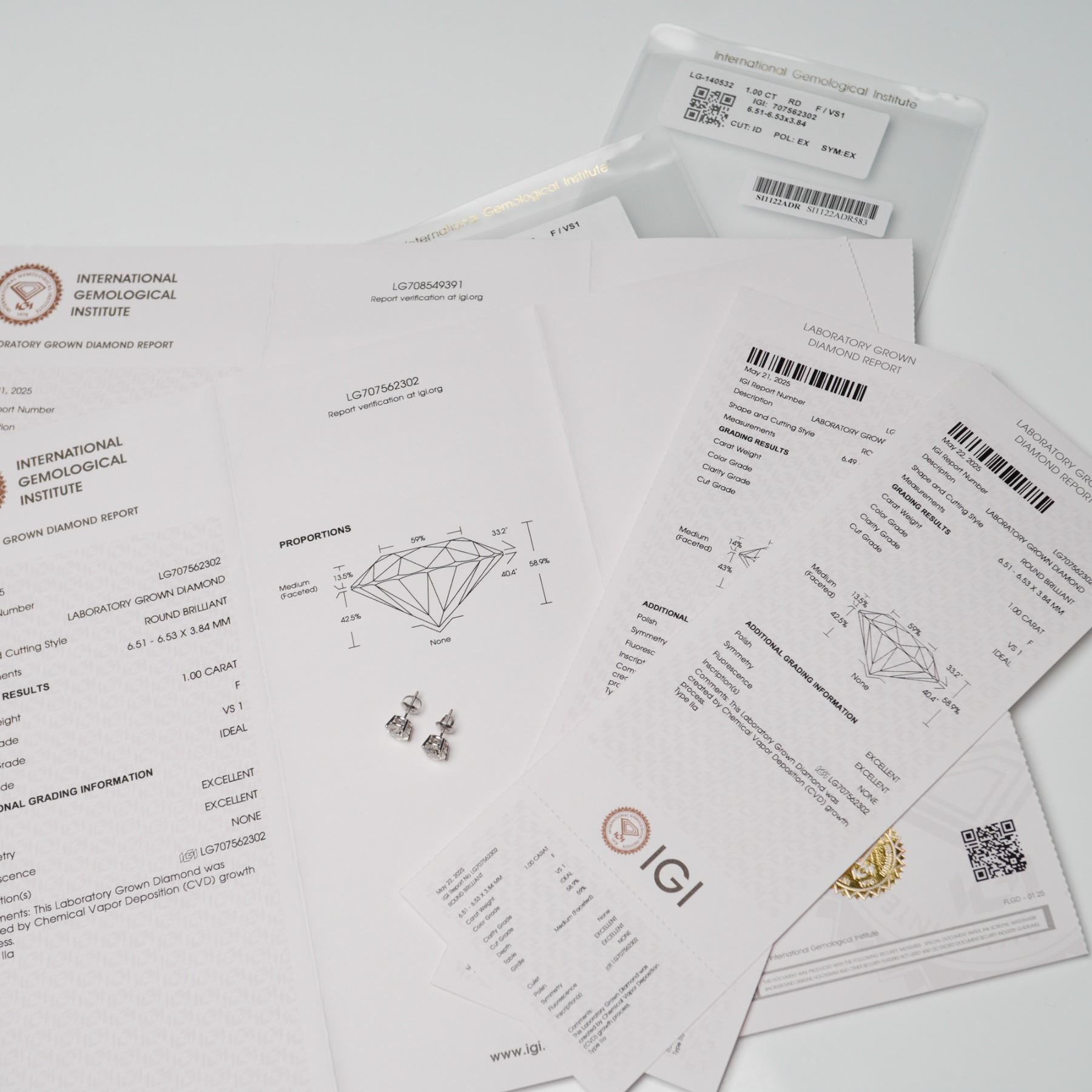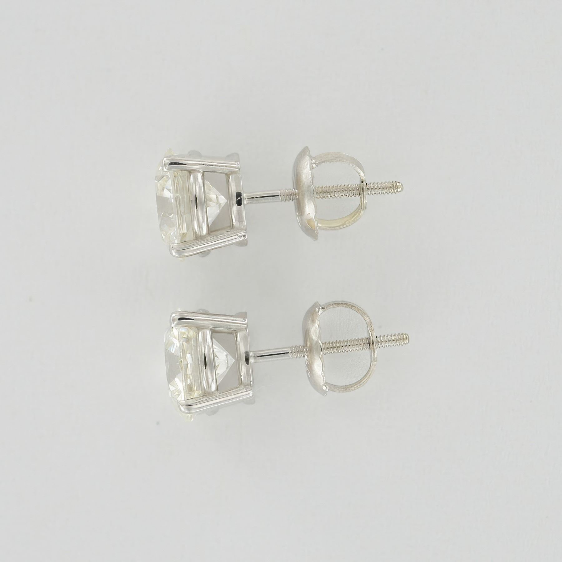 Pair of laboratory-grown round brilliant-cut diamond stud earrings, each set in a four-prong white gold basket mounting with threaded posts and screw-back closures. The diamonds are IGI-certified and have a combined total weight of 2.02 carats. One diamond weighs 1.02 carats, while the other weighs 1.00 carat. Both stones are graded F color and VS1 clarity, with excellent polish and symmetry, and are cut to Ideal proportions. Each diamond was created via Chemical Vapor Deposition (CVD) growth process, Type IIa. The earrings are stamped 14K on the backings.