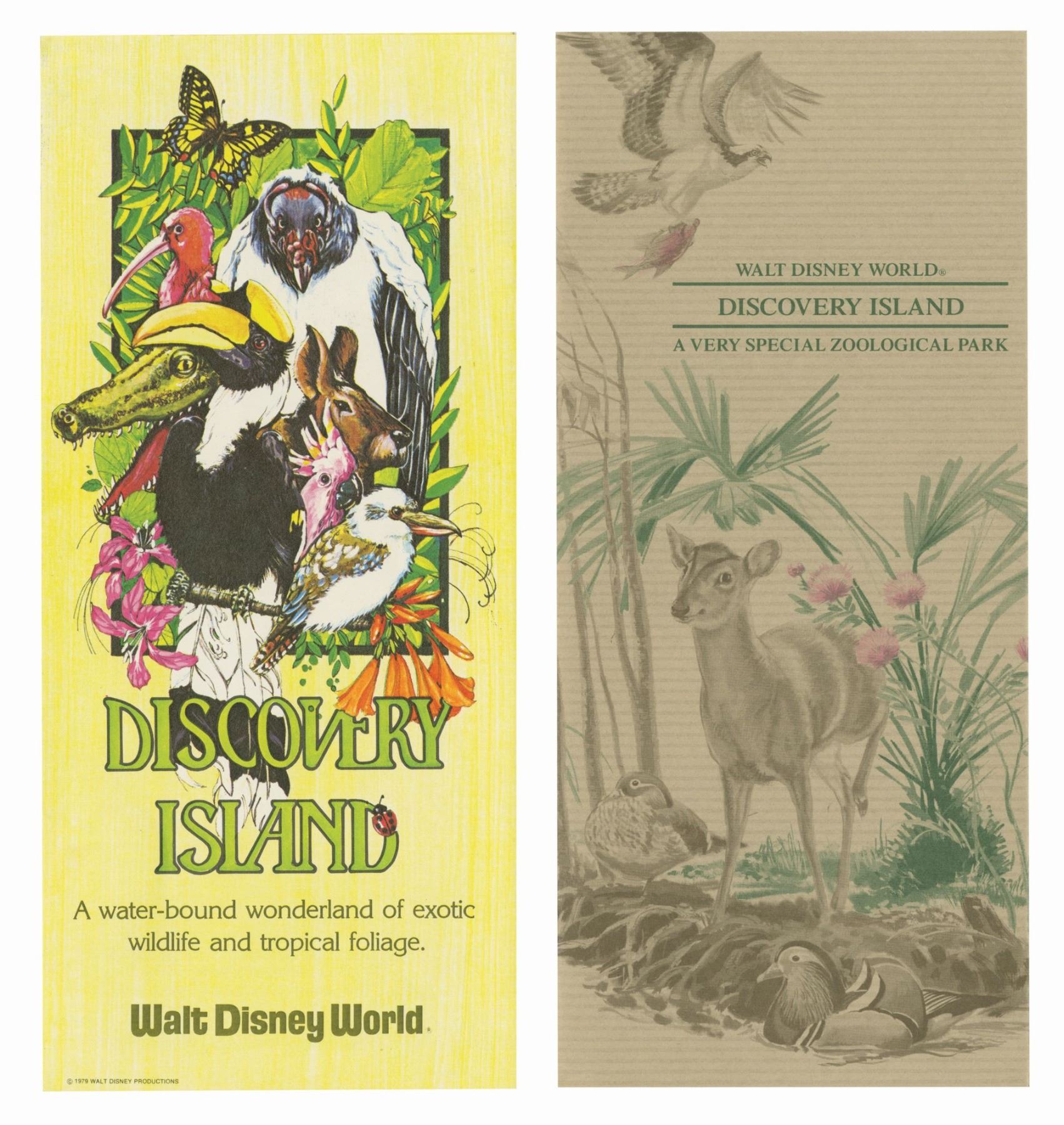 (Discovery Island, 1979/88) A pair of beautiful Discovery Island brochures from 1979 and 1988. Before its closure in 1999, Discovery Island was home to both endangered and disabled animals, and approximately 250 species of plants from all over the world. The brochures feature gorgeous illustrations of exotic wildlife, a map of Discovery Island, as well as descriptions of various attractions on the island. Each brochure measures 9"x4" folded and both are in fine condition with minor wear.