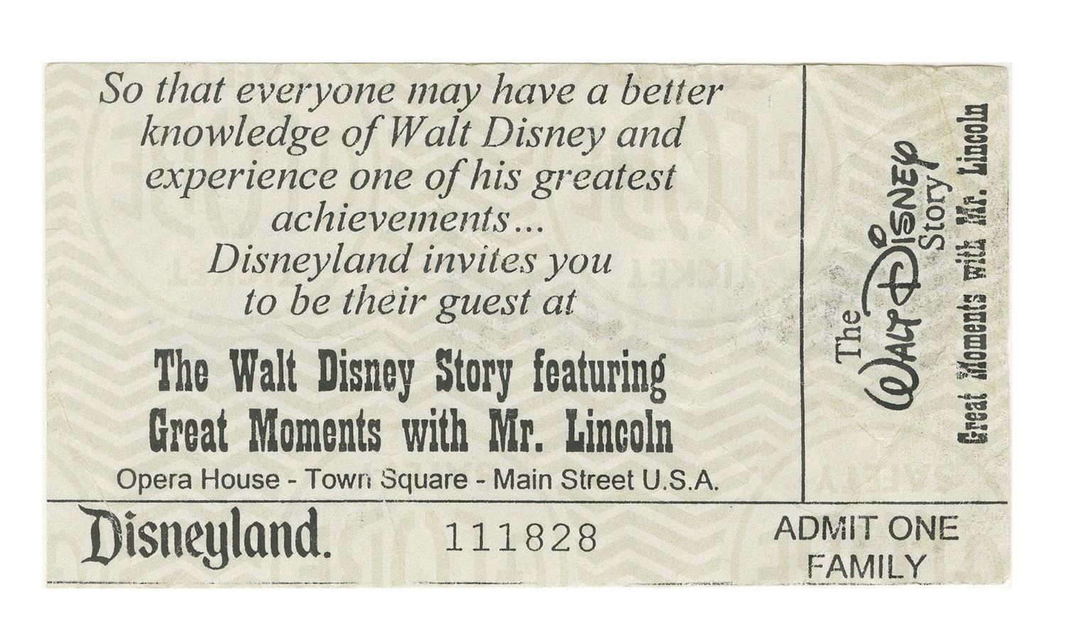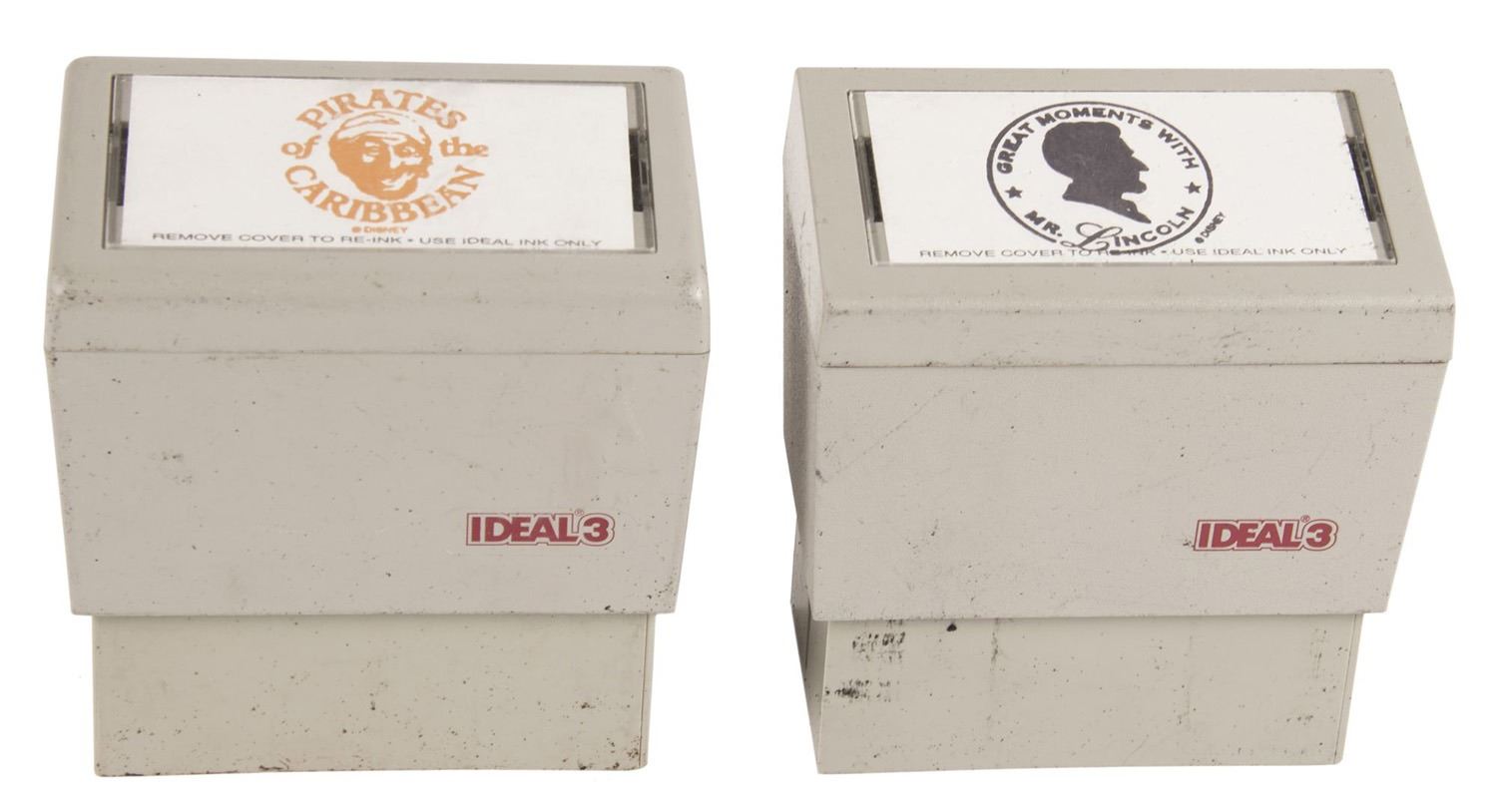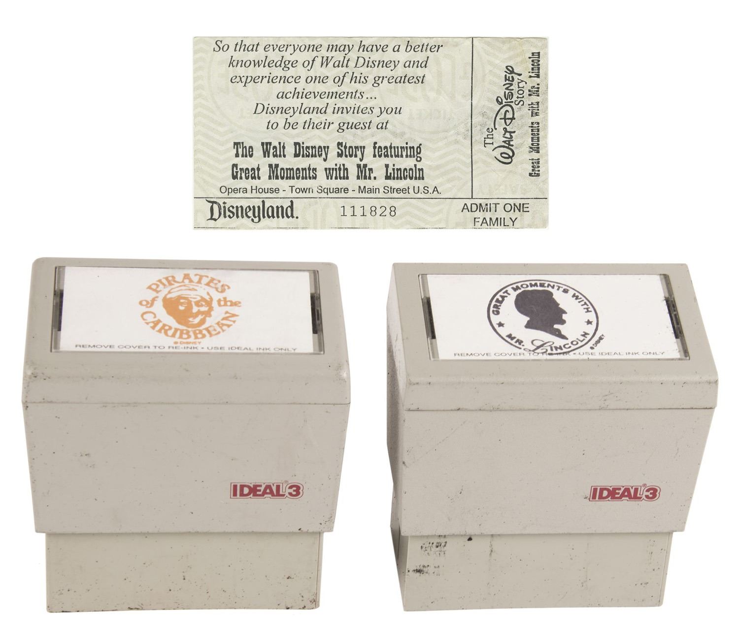 (Disneyland, c.1980) A pair of passport stamps from the Pirates of the Caribbean and Great Moments with Mr. Lincoln attractions at Disneyland. A ticket for The Walt Disney Story featuring Great Moments with Mr. Lincoln is included that has been stamped on the reverse by the Lincoln stamp. Measuring 4"x4" and 2.25" thick, the stamps are in good condition with minor wear from use. The ticket measures 2.5"x4.75" and is in fair condition with some creasing and surface wear.
