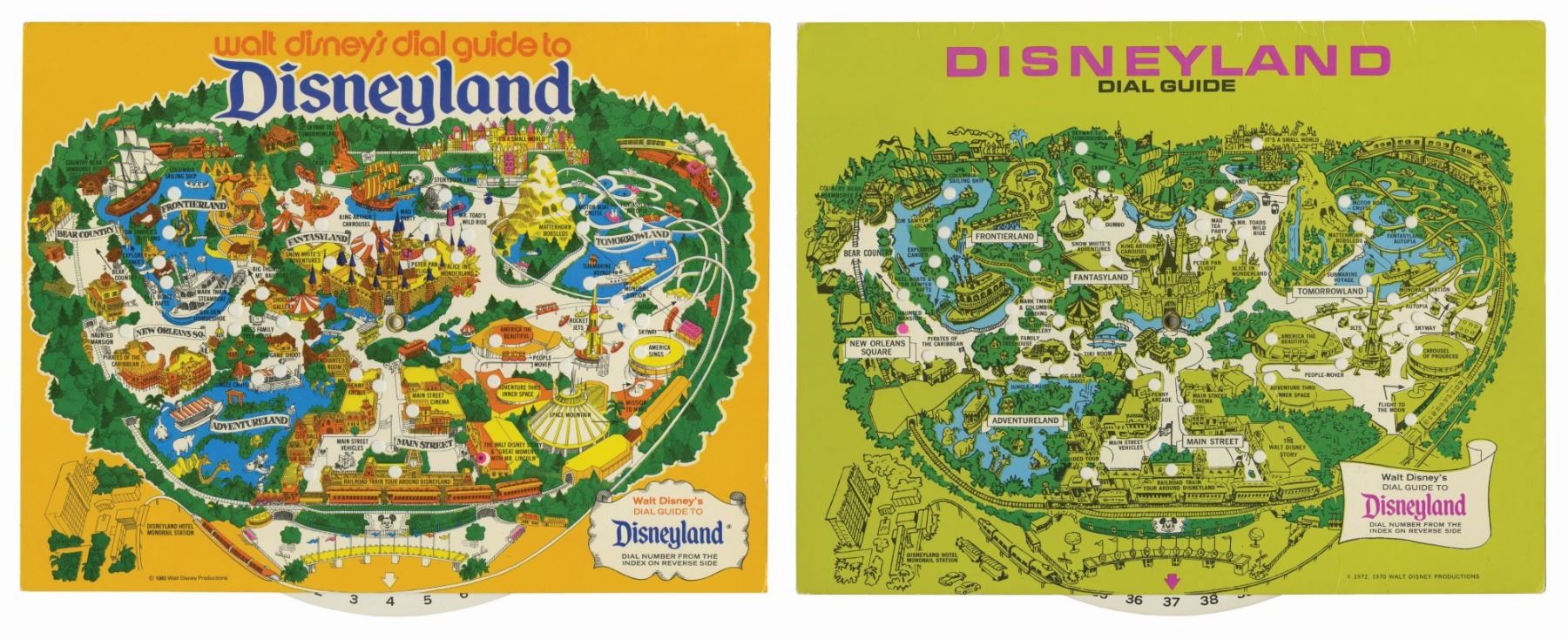 (Disneyland, 1972/80) A pair of Disneyland dial guide souvenir maps from 1972 and 1980. The maps feature a rotating dial along the bottom that highlights specific locations within the park when turned. Interestingly, the 1972 guide lists the newly opened Haunted Mansion as part of Frontierland. The dial guides measure 8.5"x11" and are in very good condition.