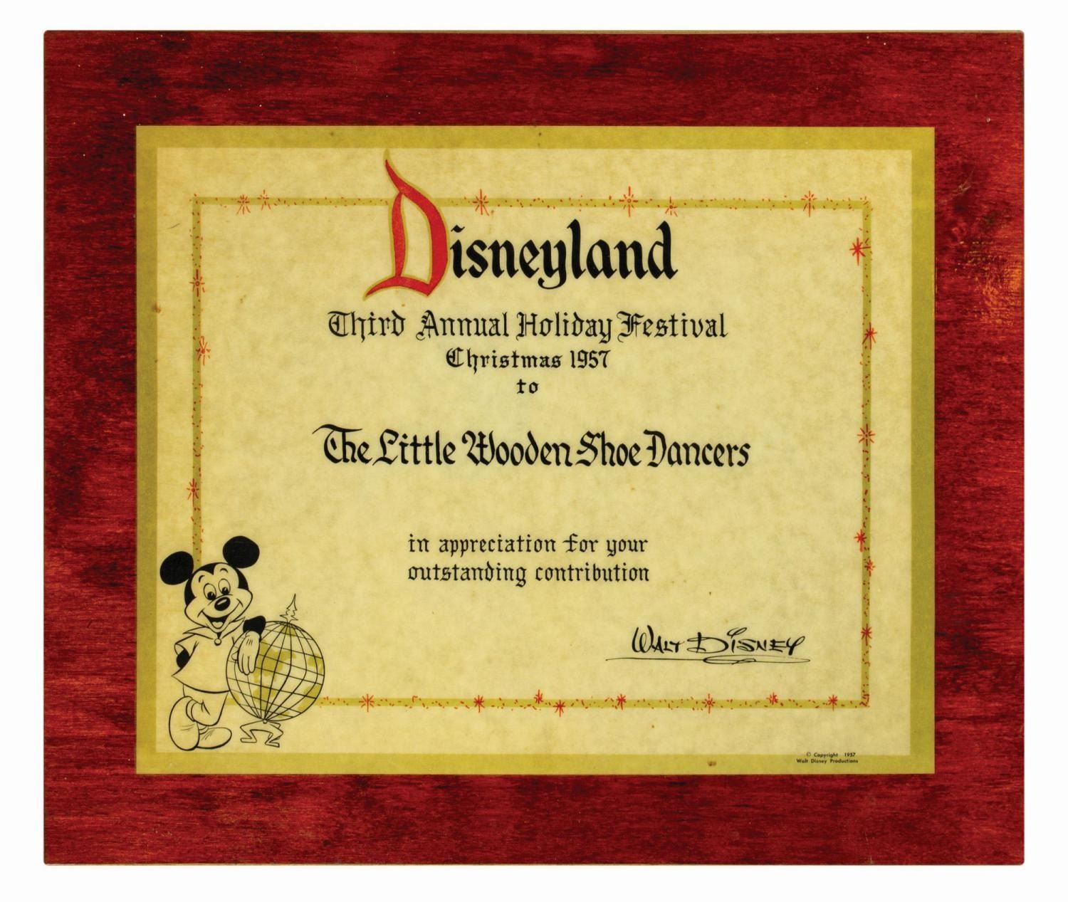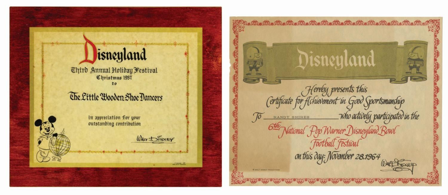(Disneyland, 1957/1964) A pair of vintage certificates from special events held at Disneyland during its first decade of operation. The pair includes a Christmas 1957 Third Annual Holiday Festival certificate of appreciation presented on a laminated wooden PermaPlaque and an "Achievement in Good Sportsmanship" certificate from the 6th National Pop Warner Disneyland Bowl Football Festival. Measuring 10.5"x12.5", the Holiday Festival plaque is in very good condition with only minimal wear. The 8"x10" Pop Warner certificate is in good condition, with uneven browning to the left side and chipping to the extreme left edge.