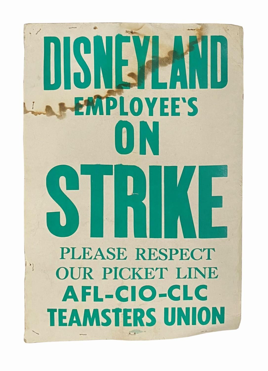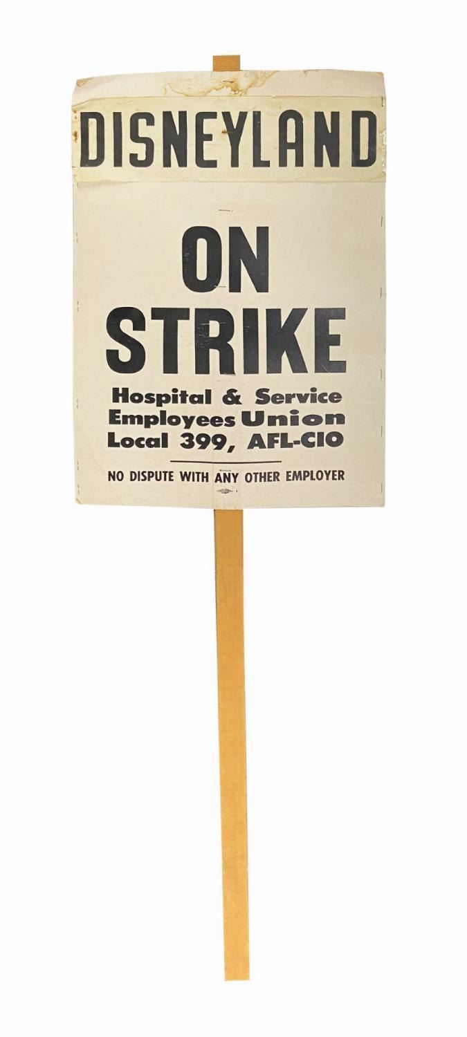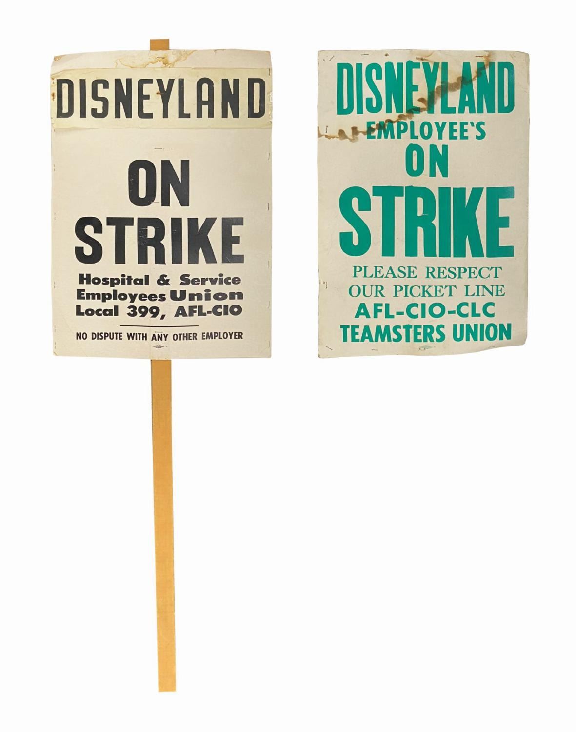 (Disneyland, 1984) A pair of vintage picket signs from the historic 1984 Disneyland cast member strike. Workers walked off the job on September 24, 1984, after park management attempted to enact a two-year wage freeze and eliminate health benefits for part-time park employees. The strike finally ended after 22 days, when growing unrest compelled Disneyland management to agree to preserve part-time benefits, while the unions compromised on the wage freeze. This pair of signs includes one for the Teamsters Union, and one for the Hospital & Service Employees Union. Both are double-sided, but only the latter still has the wooden handle attached. "Disneyland" is printed on a separate sheet of paper and attached to both sides of the Hospital & Service sign. Both cardboard signs measure 22"x14", with the handle bringing the total height of the sign to 48". Both are in good condition, with some edge-wear and tearing on both from age and use. Although both show some moisture discoloration along the top edge, it is more significant on the Teamsters sign. The attached "Disneyland" has torn on one side and is heavily creased.