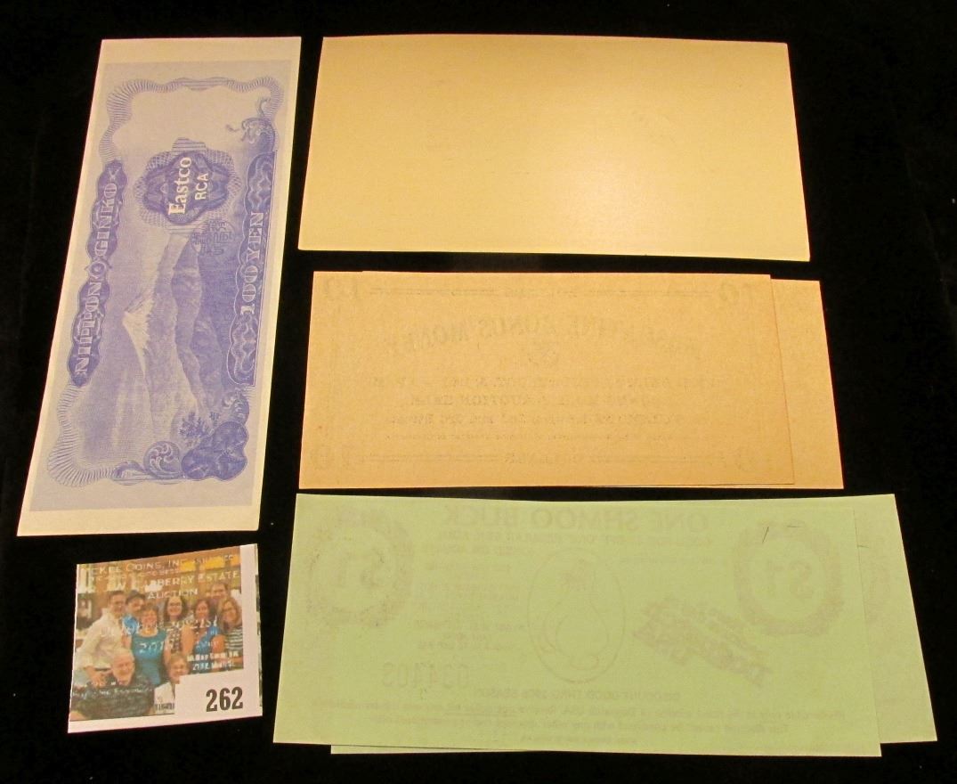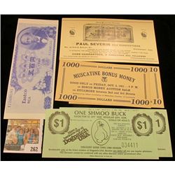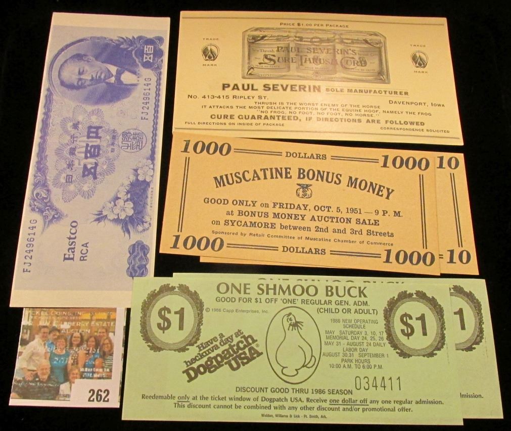 Pair of "Dogpatch USA" $1 admission tickets "One Shmoo Buck" (Dogpatch is now a Ghost town, which was apparently put out of business when Silver Dollar City moved into the area, a lot of sweet childhood memories of the Trout Pond); "Eastco RCA" advertising Japanese 100 Yen note; $10 & $100 1951 "Muscatine Bonus Money" scrip; Quack doctor label for "Paul Severin's Sure Thrush Cure", Mint condition.
