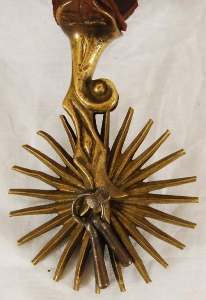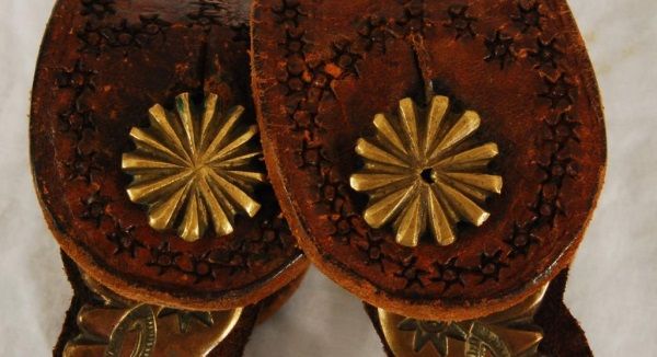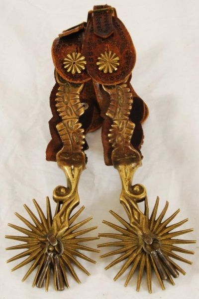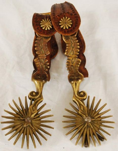 Brass/bronze, unique double mount with custom leather liners. 3-1/2" rowels, 20 points, period correct jingle bobs, vintage straps with brass buckle.