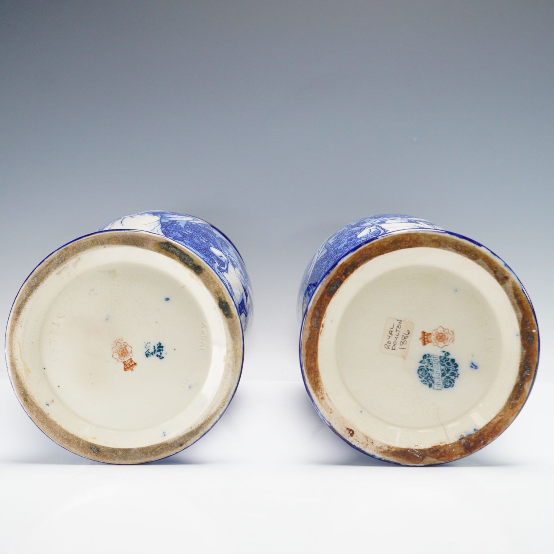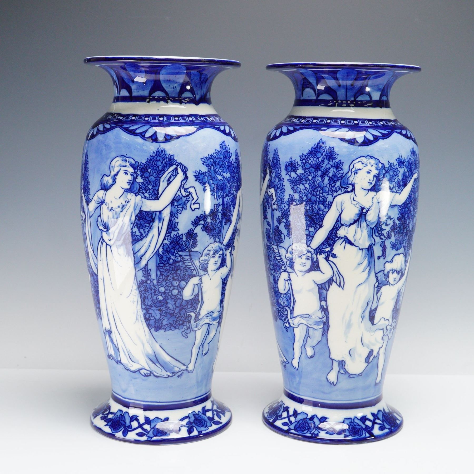 Magnificent pair of Morrisian Ware vases, each decorated in cobalt blue against a pale ground with classical maiden figures accompanied by putti within wooded landscapes. The scenes framed by stylized foliate borders and garlanded rims. Morrisian stamped. Doulton Burslem backstamp.