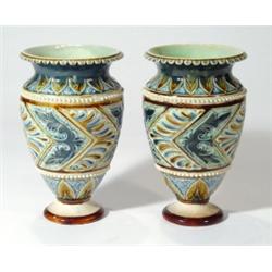 Pair of Doulton Lambeth Stoneware vases by Margaret Aitken, incised with chevrons and stylised leaves onto a blue and green ground, impressed marks and initials to base, 20cm high