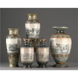 Pair of Doulton Lambeth vases with decoration of horses in landscape by Hannah Barlow, 21cms high - see illustration inside catalogue back cover