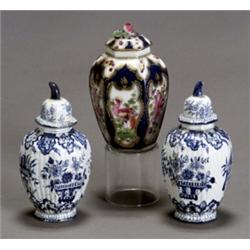 Pair of Dutch Delft Blue and White Miniature Covered Urns and a Worcester Covered Urn
