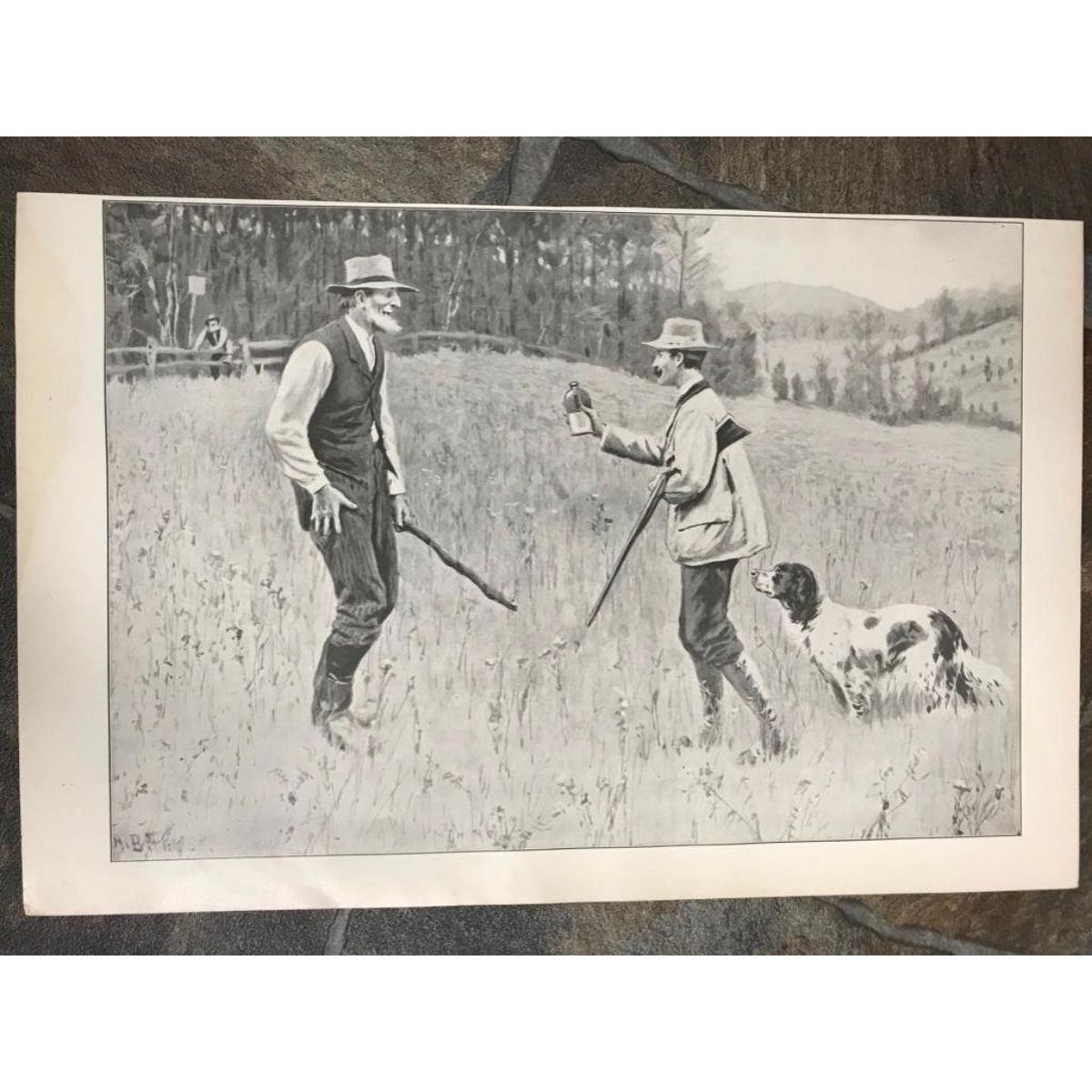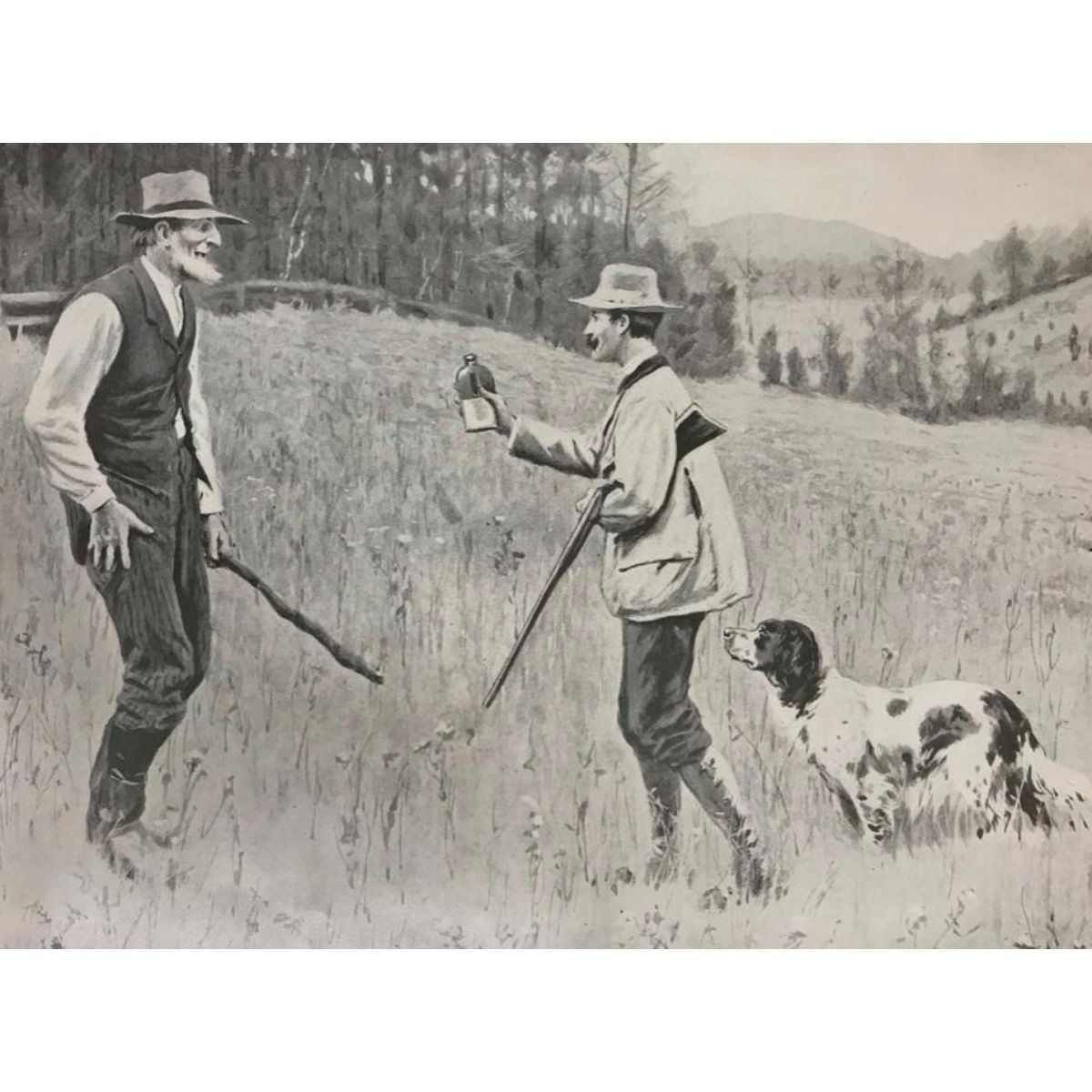 Pair of c.1904 half-tone prints by A. B. Frost, "Going 'Round The Old Man" hunting scene - 10" X 15" & "The Conciliator", two hunters in a field, one offering the other a drink from his flask. 10" X 15".Â