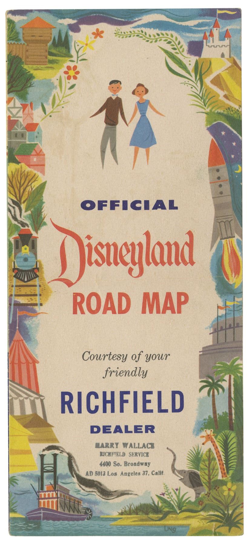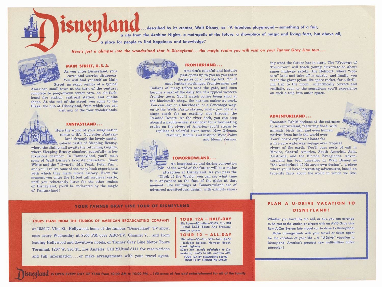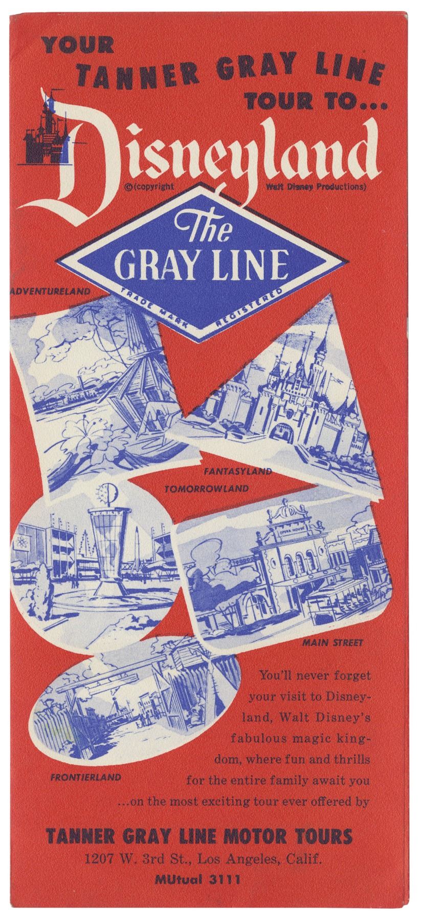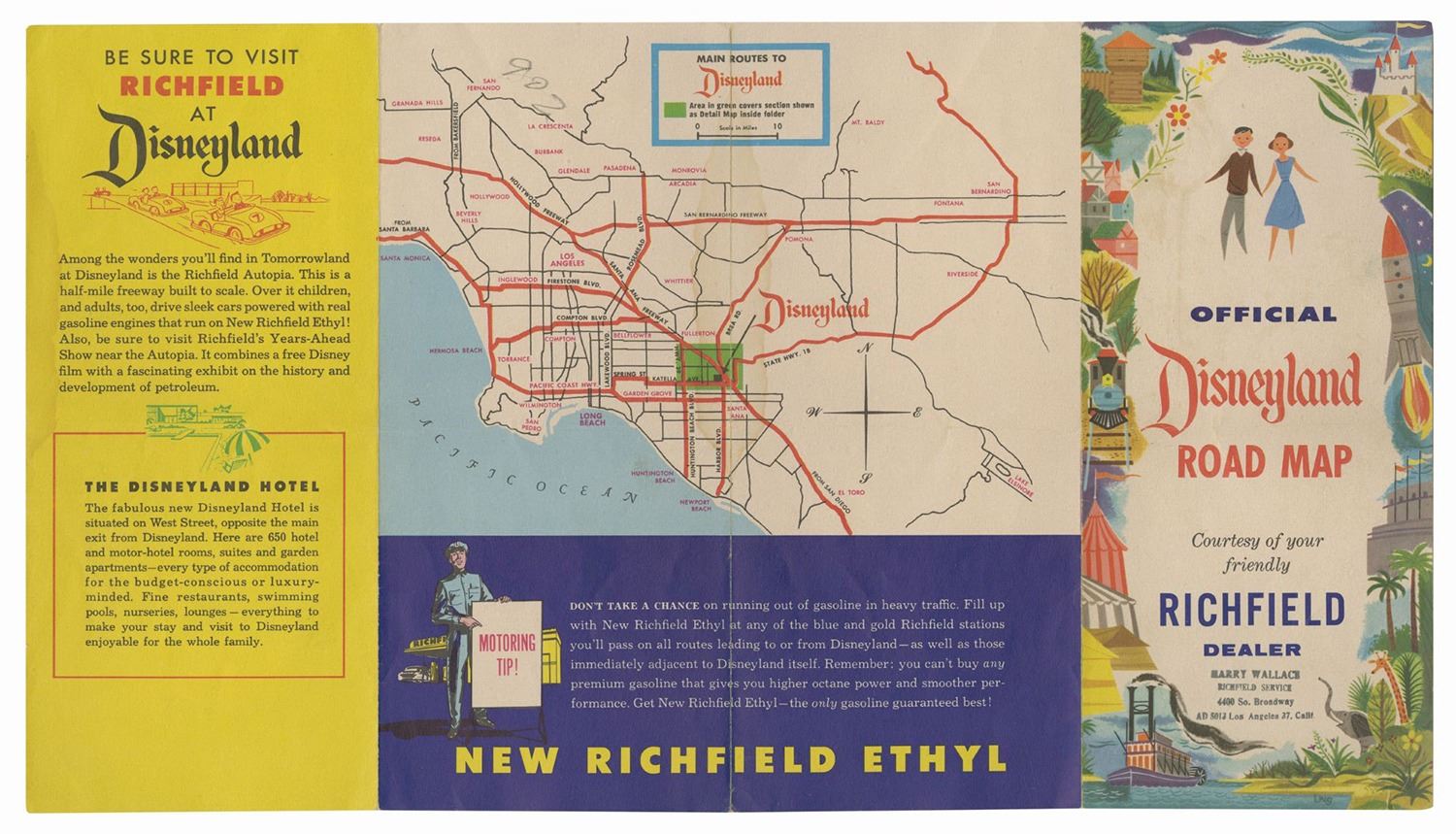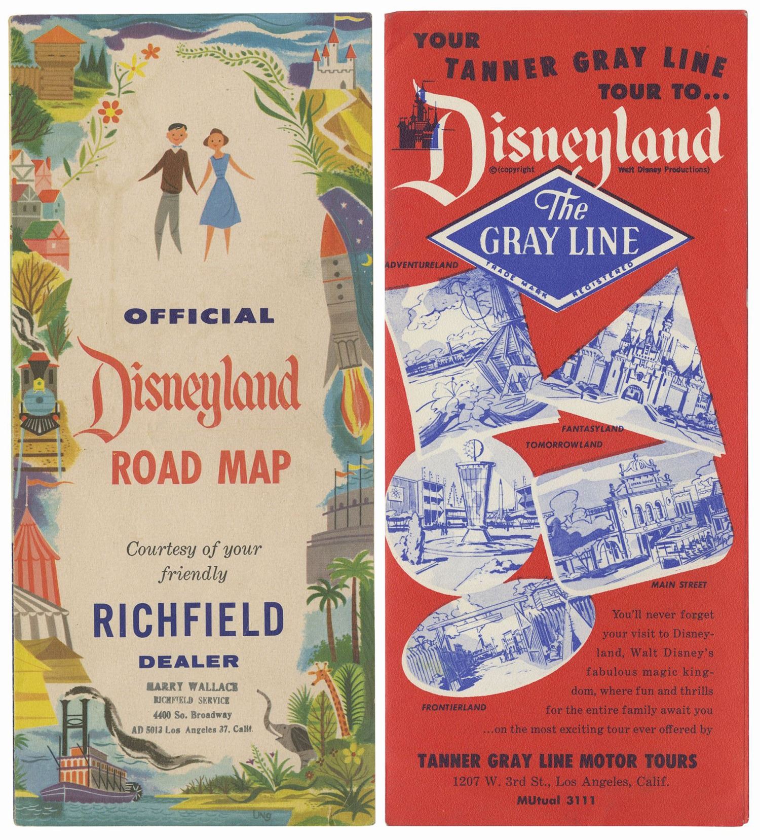 (Disneyland, c.1955) A pair of tri-fold Disneyland travel brochures from the early days of the park. The Richfield Oil Official Disneyland Road Map opens to reveal a California map with several routes to Disneyland. The Tanner Gray Line Tour to Disneyland pamphlet highlights the park's five themed lands on the cover and describes each of them within. Both measure 9"x4" folded and the pair is in good condition. There is a horizontal crease on the Richfield brochure, as well as a service dealer stamp on the cover.
