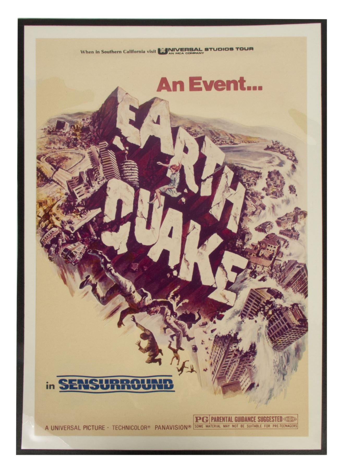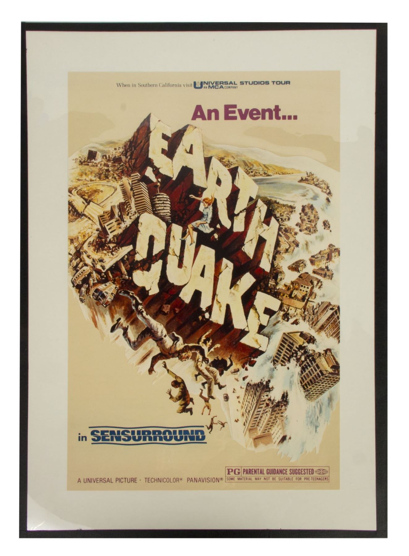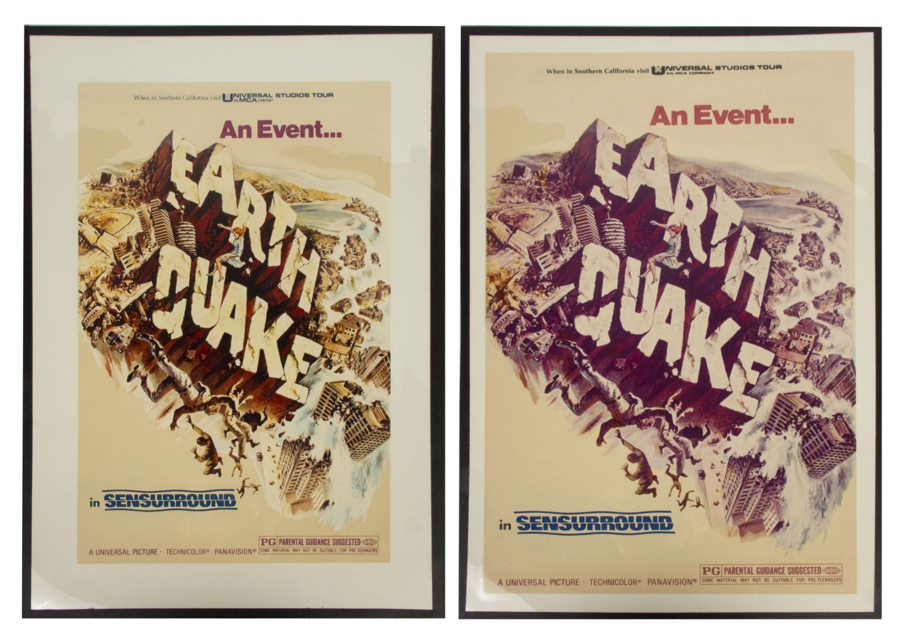 (Universal, 1974) A pair of developmental art concepts featuring the poster imagery for "Earthquake". The pair includes (2) variant designs with similar imagery; one as a lighter color scheme, and the other a bit darker. Both concepts have hand-trimmed photo imagery that is applied to art board with silkscreened text elements applied on a clear sheet over the trimmed printed images. Both designs measures 21.5" tall with widths of 14.25" and 15.75", and are taped along the edges for their preservation. The condition is very good with minor wear from use.