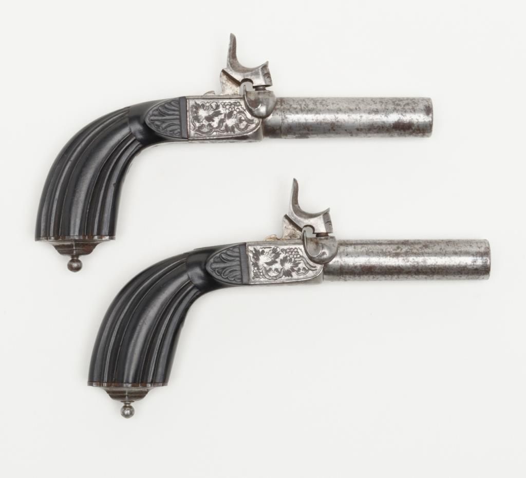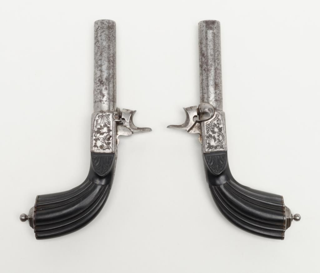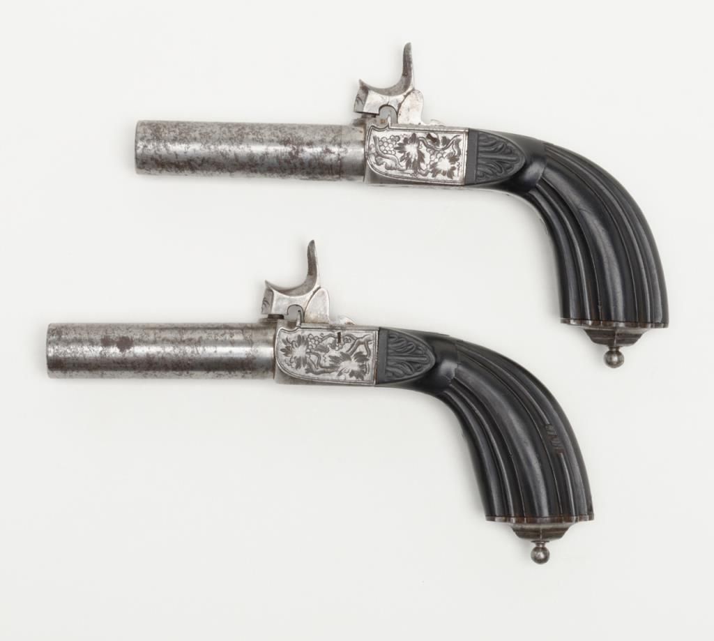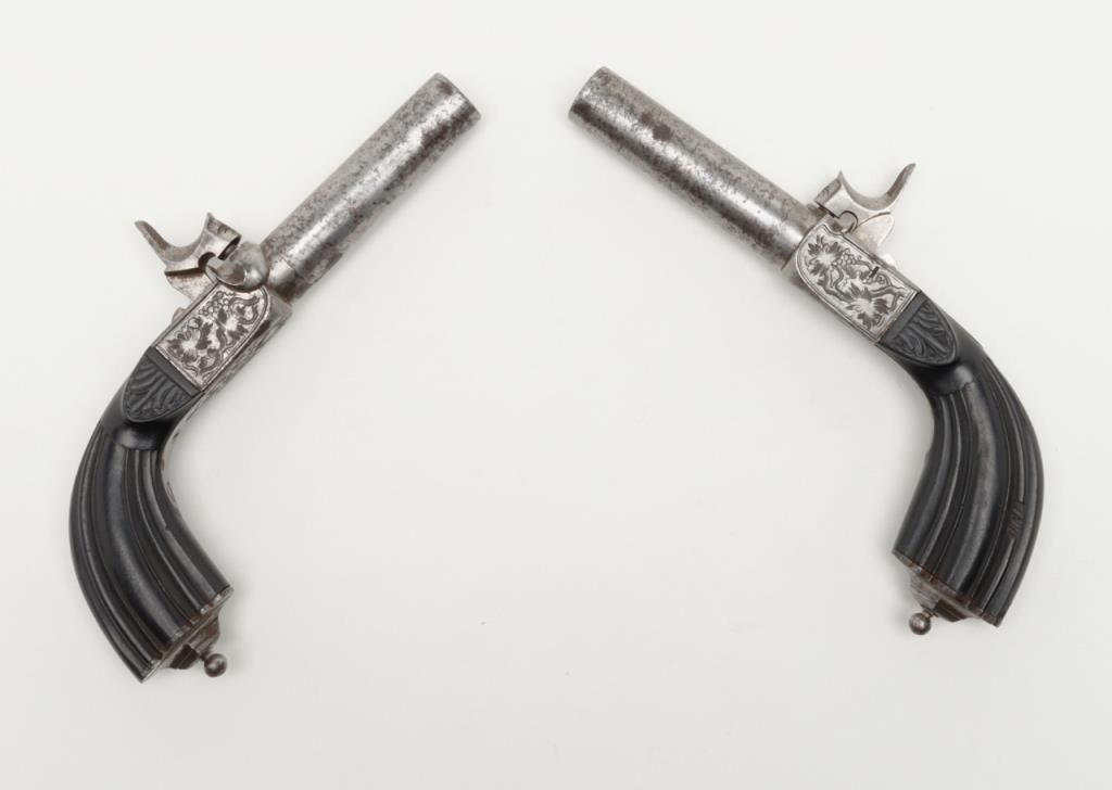 Pair of Ebony stocked percussion muff pistols, .54 cal., 3” round barrels, engraved frames, folding triggers, each approx. 7-1/2” overall and both in very good+ condition showing scattered spots of erosion on barrels, crisp actions, good bores,fine ebony grips; a beautiful mid-1800’s pair of muff pistols. (Antique). Est.: $1,250-$2,500.