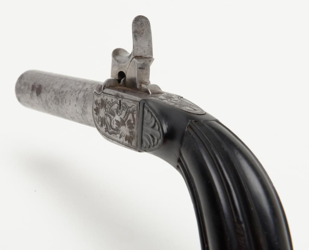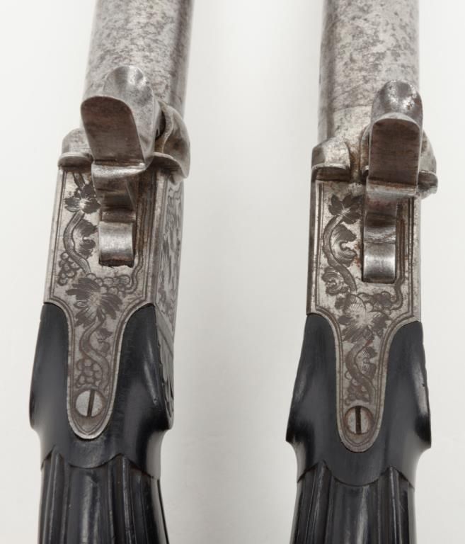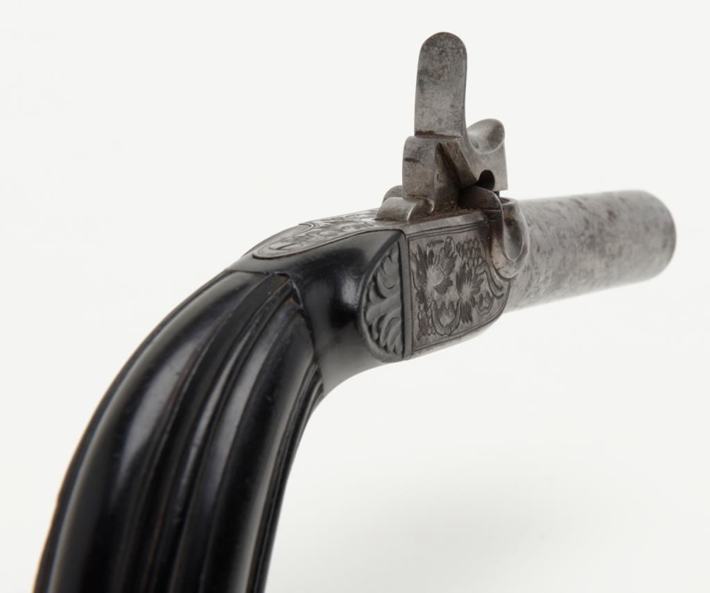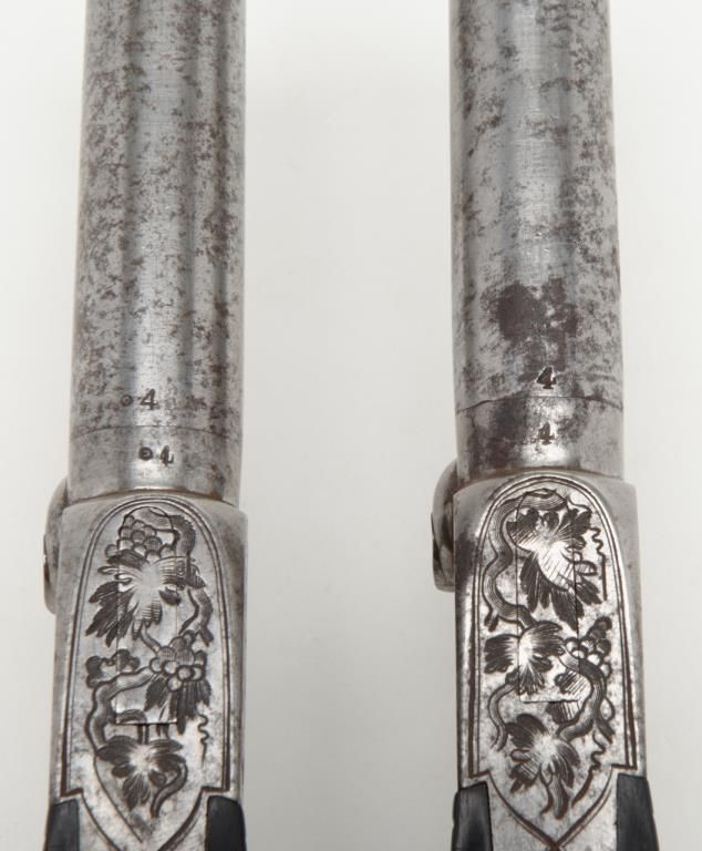 Pair of Ebony stocked percussion muff pistols, .54 cal., 3” round barrels, engraved frames, folding triggers, each approx. 7-1/2” overall and both in very good+ condition showing scattered spots of erosion on barrels, crisp actions, good bores,fine ebony grips; a beautiful mid-1800’s pair of muff pistols. (Antique). Est.: $1,250-$2,500.