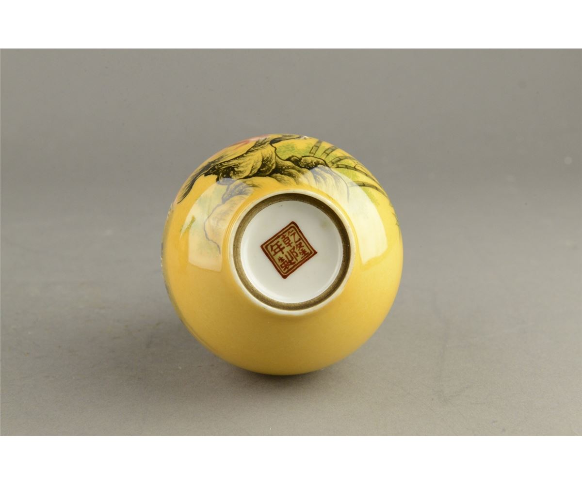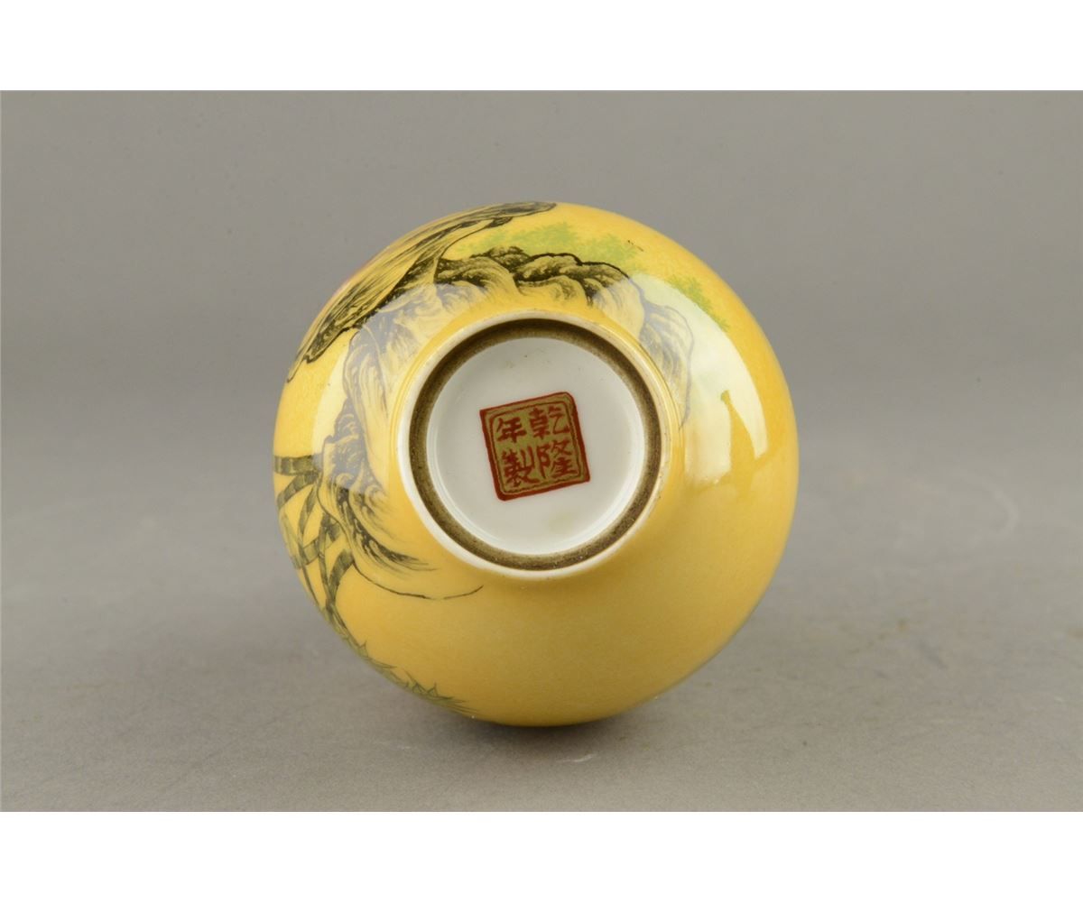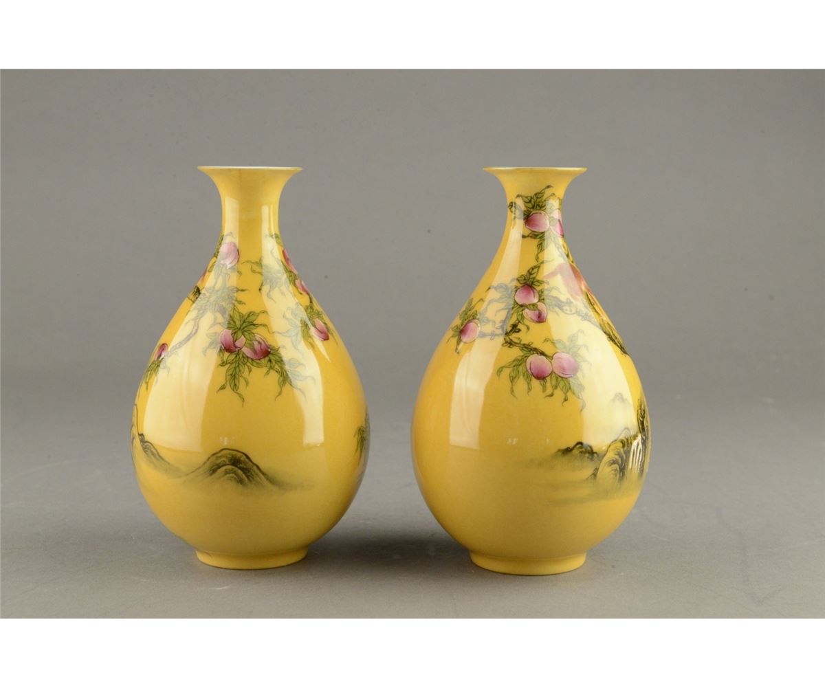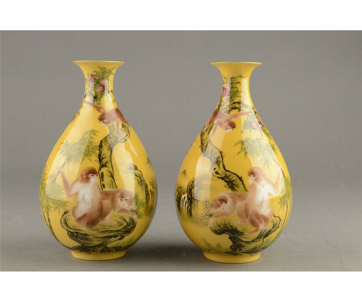 Pair of Chinese eggshell porcelain vase, thinly potted vases featuring mirrored images of auspicious monkeys on tree branch with peaches against yellow ground. Bottom with four-characters Qianlong mark. H: 14 cm, D: 8.5 cm, each 137 grams. Provenance: T. Ng Collection Toronto.