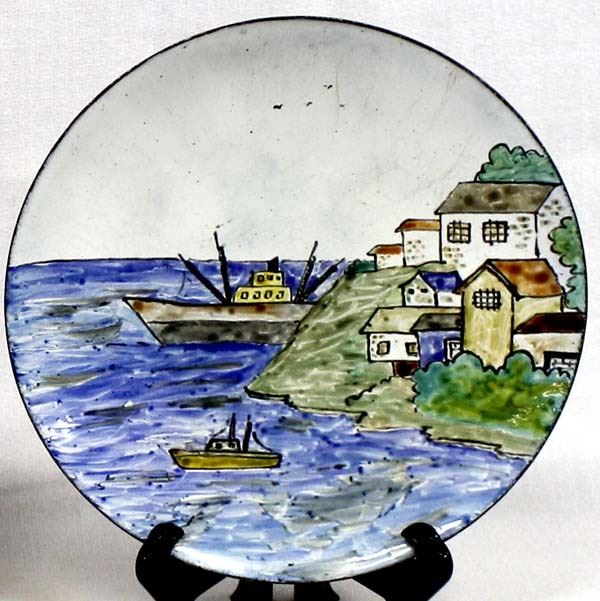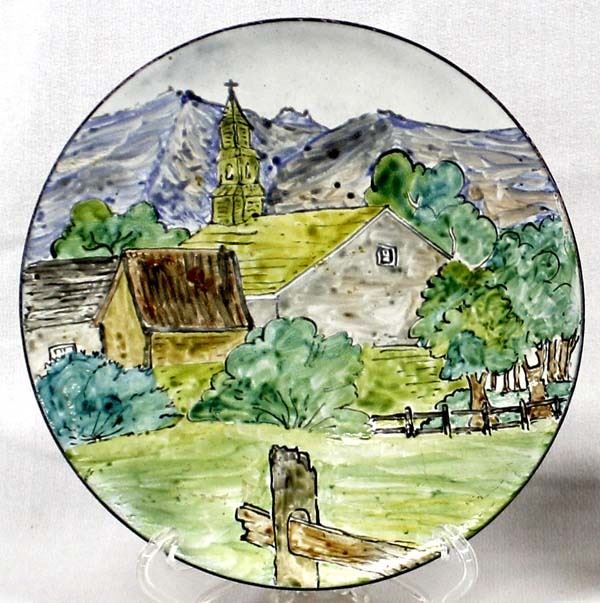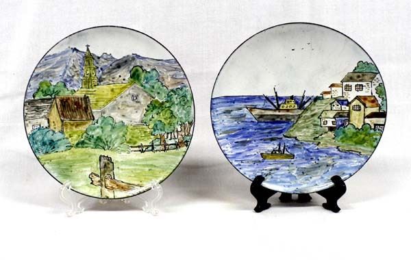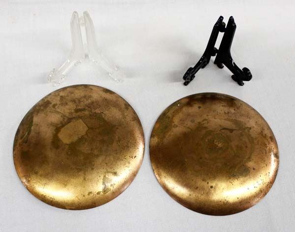 Pair of Vintage Enamelware on Copper Plates, measure 6''D, includes 2 small plate stands