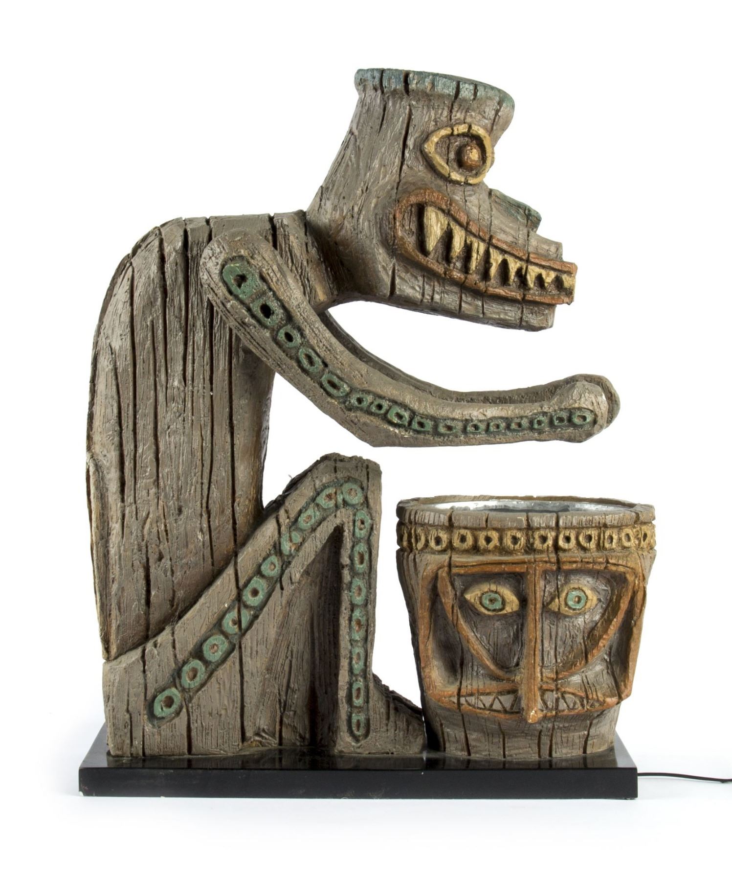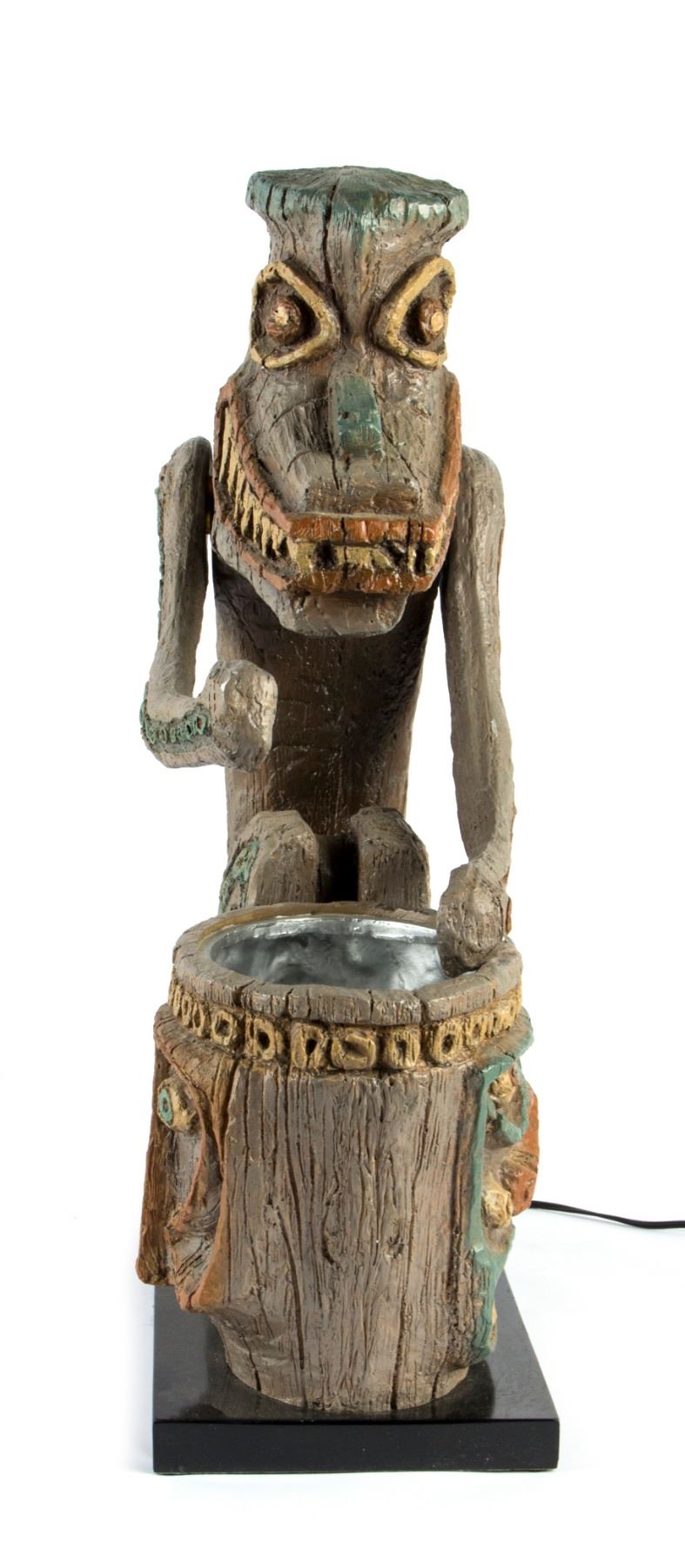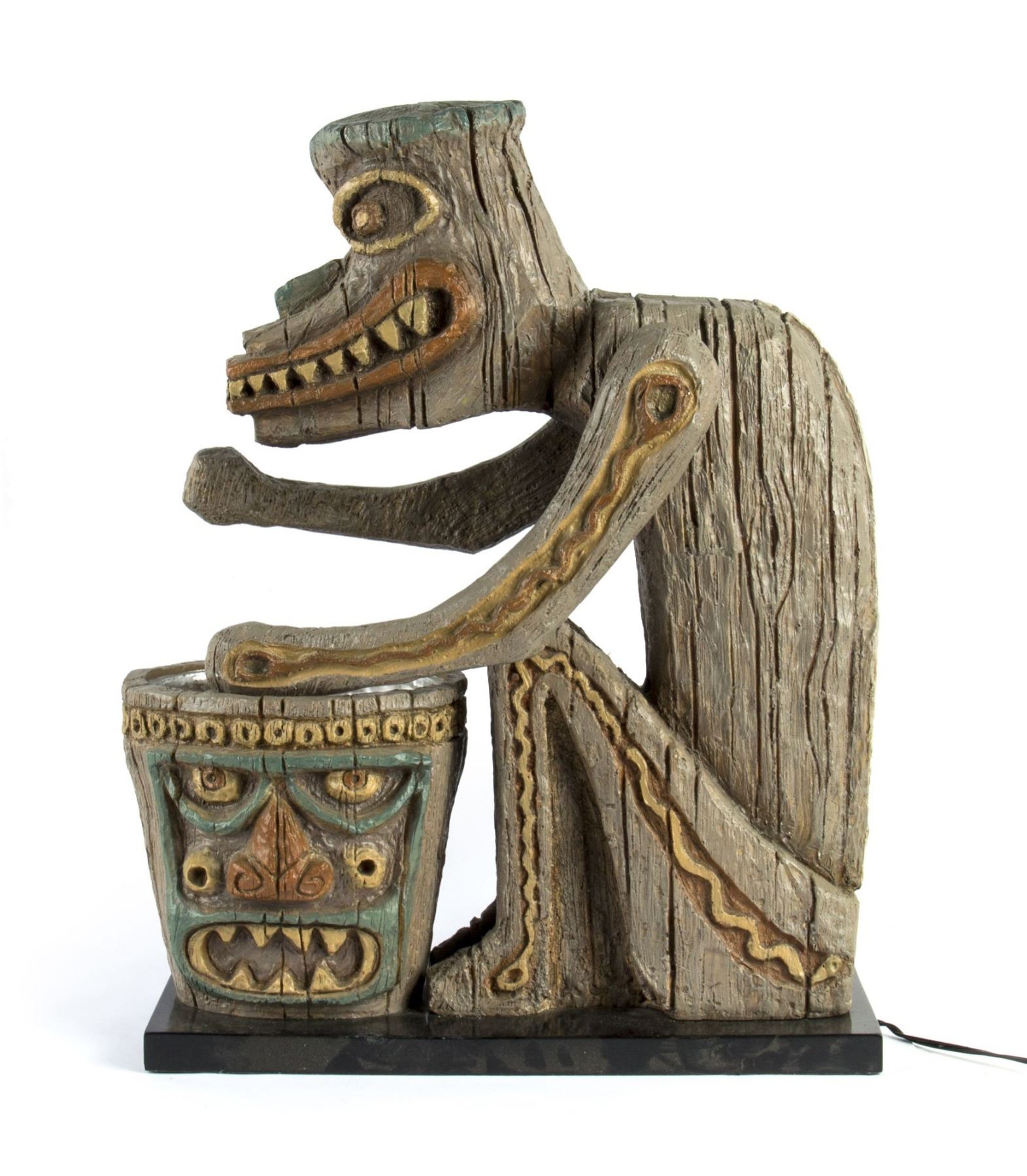 (Disneyland, 2006) An incredible pair of replica of the tiki drummers from the "Enchanted Tiki Room" at Disneyland. Created for Disneyland's 50th Anniversary by Kevin Kidney and Jody Daily, these full-size drummers were cast directly from the original 1963 sculpt by Imagineer Rolly Crump. Accomplished in resin and metal, these drummers were released in an edition of only 1000 and feature posable arms and a lighted drum. The drummers measure 24" tall and are in very good condition with some minor wear from use.
