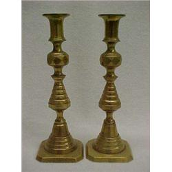 A pair of brass beehive candlesticks, push-up, 9 3/4" h., eight sided base impressed England Rd #223580