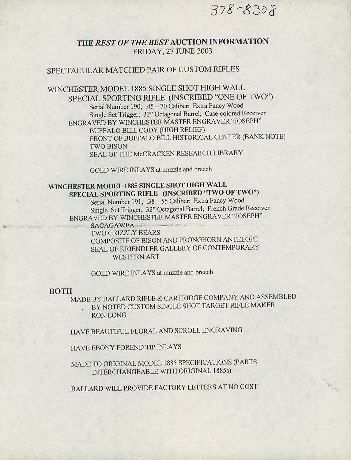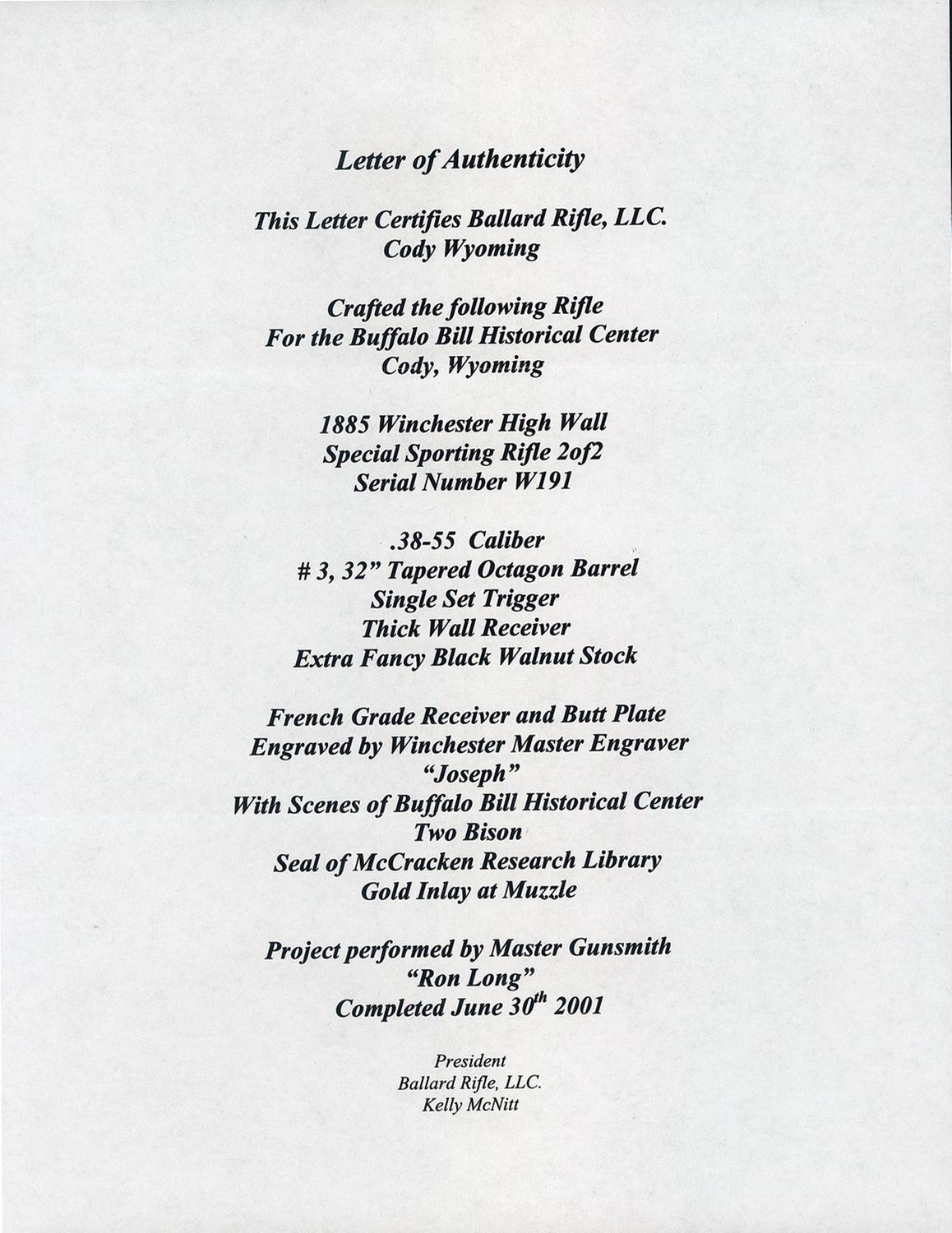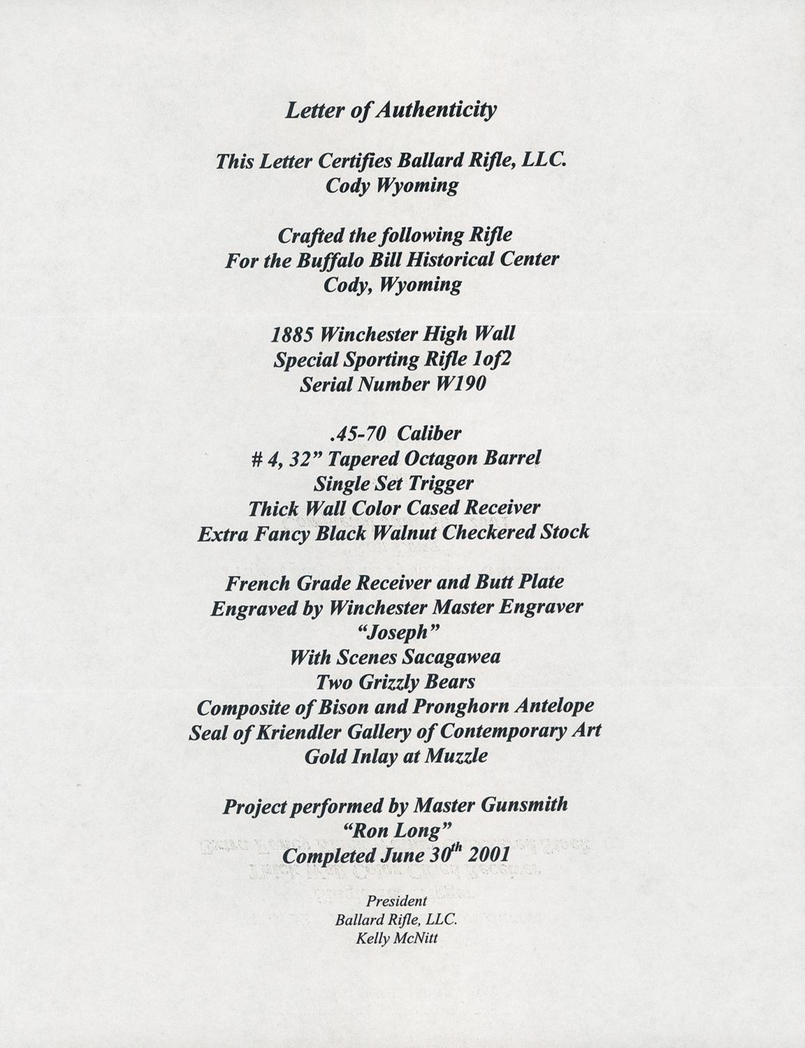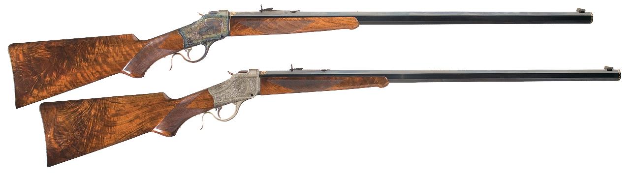 A) This beautiful, master engraved pair of Model 1885 rifles were manufactured by Ballard Rifle & Cartridge Company, assembled by noted custom single shot target rifle maker Ron Long, and engraved by Winchester Master Engraver "Joseph". Blue barrel and casehardened receiver, lever and buttplate. The rifle is beautifully engraved and features gold inlaid wire and vine patterns on the muzzle and breech ends of the barrel. The #4 barrel is tapered and is equipped with a blade front and buckhorn rear sporting sights. The thick action is masterfully engraved with finely detailed floral designs with scalloped borders. The left side of the action features a finely detailed image of the front of the Buffalo Bill Historical Center with mountains in the background and a banner border. The left side features high relief engraving of Buffalo Bill sitting on the ground, holding a rifle with mountains in the background with a scalloped border. Each side of the top of the receiver behind the hammer has a relief bison in an oval panel and the lever is engraved with the seal of the McCracken Research Library. The upper tang is engraved "One of Two" flanked by outwardly pointing arrows and the serial number "W190" is engraved on the bottom of the action. The lower tang is engraved with the signature of the engraver "Joseph / Cody, Wy.". The rifle is equipped with a single set trigger and is mounted with extra fancy black walnut checkered forearm with an ebony forend insert and pistol grip stock with a cheekpiece and checkered buttplate. These rifles were completed on June 30, 2001 and were made to the original Winchester Model 1885 specifications with parts interchangeable with original Model 1885s. The rifle is complete with a letter of authenticity from the President of Ballard Rifle, LLC. Consignor states he bought these rifles from the "Best of the West" at the Cody Museum, WY after they had been on display for some time.