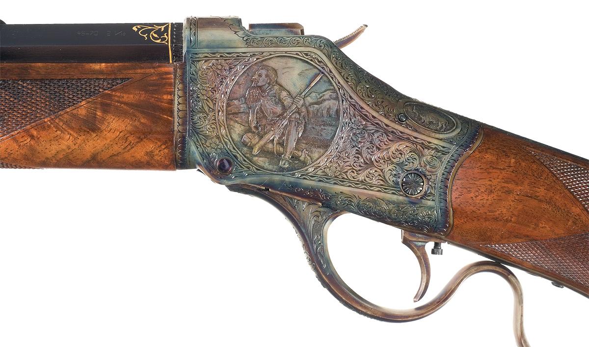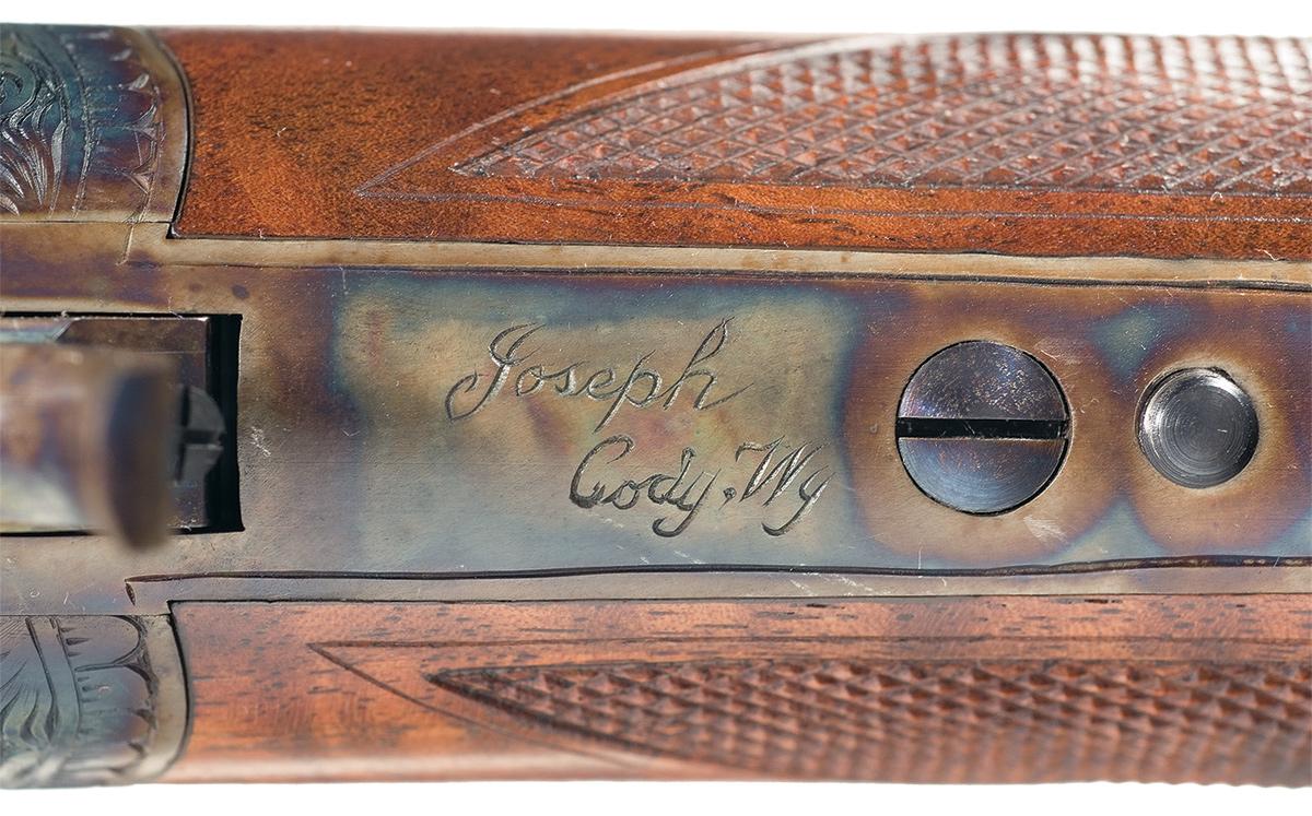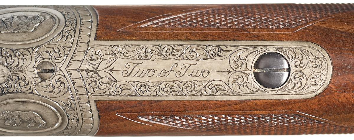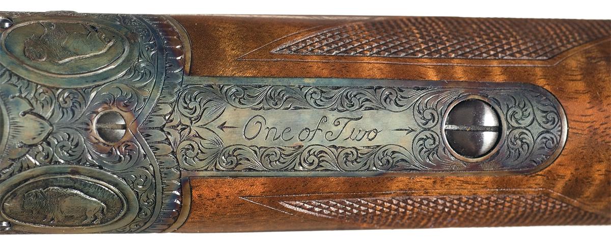 A) This beautiful, master engraved pair of Model 1885 rifles were manufactured by Ballard Rifle & Cartridge Company, assembled by noted custom single shot target rifle maker Ron Long, and engraved by Winchester Master Engraver "Joseph". Blue barrel and casehardened receiver, lever and buttplate. The rifle is beautifully engraved and features gold inlaid wire and vine patterns on the muzzle and breech ends of the barrel. The #4 barrel is tapered and is equipped with a blade front and buckhorn rear sporting sights. The thick action is masterfully engraved with finely detailed floral designs with scalloped borders. The left side of the action features a finely detailed image of the front of the Buffalo Bill Historical Center with mountains in the background and a banner border. The left side features high relief engraving of Buffalo Bill sitting on the ground, holding a rifle with mountains in the background with a scalloped border. Each side of the top of the receiver behind the hammer has a relief bison in an oval panel and the lever is engraved with the seal of the McCracken Research Library. The upper tang is engraved "One of Two" flanked by outwardly pointing arrows and the serial number "W190" is engraved on the bottom of the action. The lower tang is engraved with the signature of the engraver "Joseph / Cody, Wy.". The rifle is equipped with a single set trigger and is mounted with extra fancy black walnut checkered forearm with an ebony forend insert and pistol grip stock with a cheekpiece and checkered buttplate. These rifles were completed on June 30, 2001 and were made to the original Winchester Model 1885 specifications with parts interchangeable with original Model 1885s. The rifle is complete with a letter of authenticity from the President of Ballard Rifle, LLC. Consignor states he bought these rifles from the "Best of the West" at the Cody Museum, WY after they had been on display for some time.
