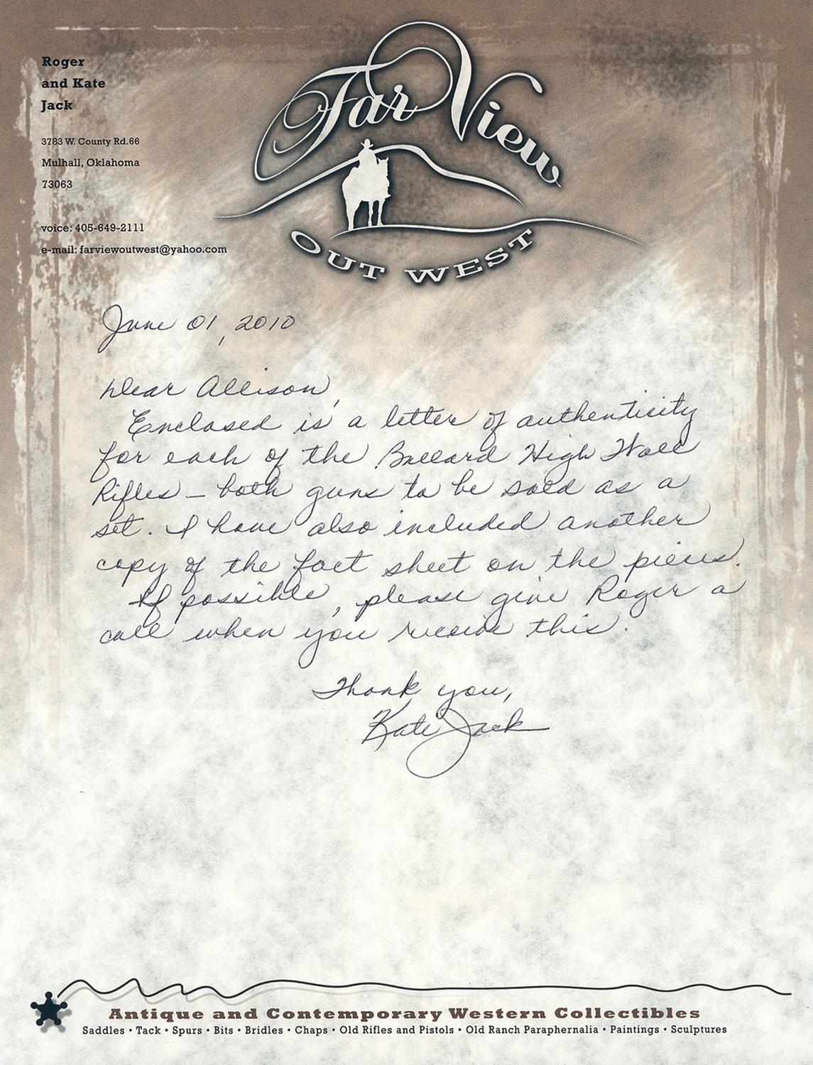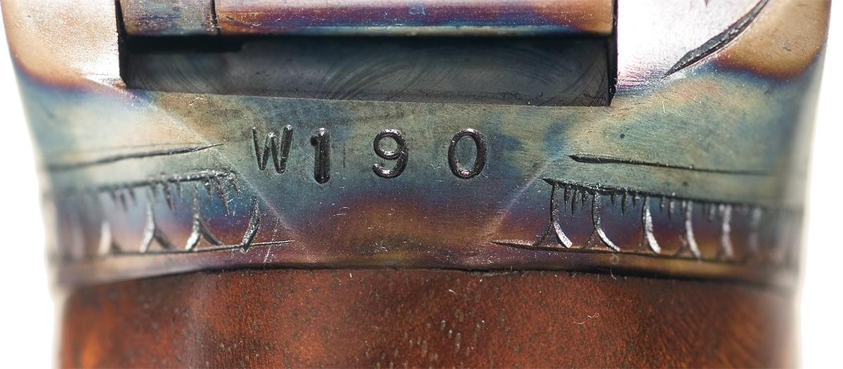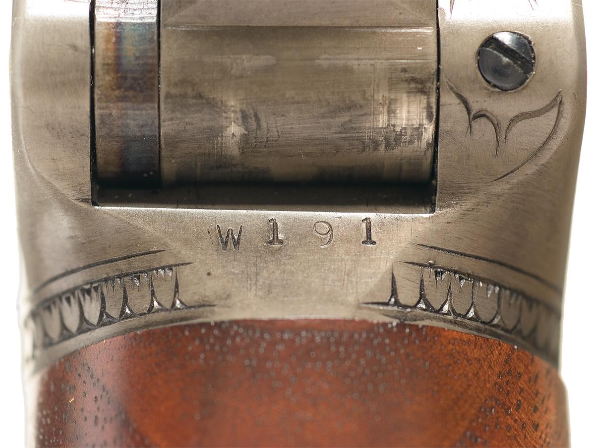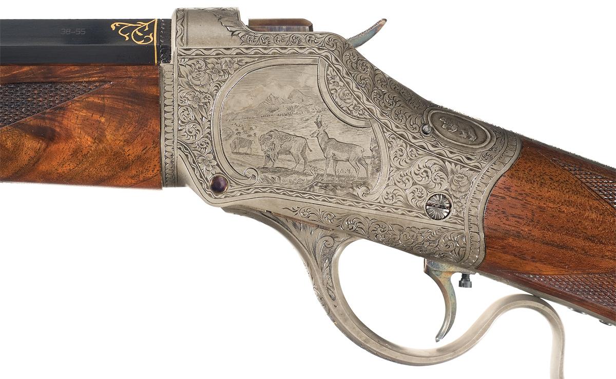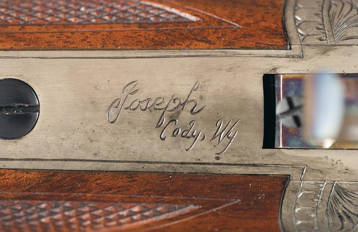 Consecutively serial numbered to A, this rifle was also the product of Ron Long and Master Engraver "Joseph". The rifle is fitted with a #3 octagon barrel with gold inlaid wire and vine patterns on the muzzle and breech ends, a blade front and adjustable sporting buckhorn rear sights. The barrel is blue, the trigger, breechblock, hammer and buttplate are casehardened and the action is gray. The action is nicely engraved with floral designs with scalloped border. The left side has a prairie scene of pronghorn antelope and bison with mountains in the background and a banner border. The right side has a relief image of Sacagawea with a scalloped border. At the bottom of Sacagawea's hair is "HARRY JACKSON". The upper rear of the action behind the hammer has a grizzly bear in an oval panel on each side and the upper tang is engraved "Two of Two". The lever has the Seal of Kriendler Gallery of Contemporary Western Art and the lower tang behind the trigger is signed "Joseph / Cody, Wy". The serial number "W191" is stamped on the bottom front of the action. The rifle has a single set trigger and is mounted with extra fancy checkered black walnut forearm with an ebony forend insert, cheekpiece and checkered buttplate. This rifle was made to original Winchester Model 1885 specifications and the parts are interchangeable with the original Model 1885s. Complete with a letter of authenticity from the President of Ballard Rifle, LLC.