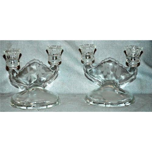 glass dual candlestick holders. This auction is for the pair. They have graceful lines and lovely etching. They are marked on the bottom inside the rim but I cannot decipher what these obscure markings could be. They could just be mold marks and not a manufacture signature. The marks are in the same place on both sets. <p> They measure 5 1/2" high and 6" across. The bases are 4 3/4" in diameter.<p> The condition is excellent on both.