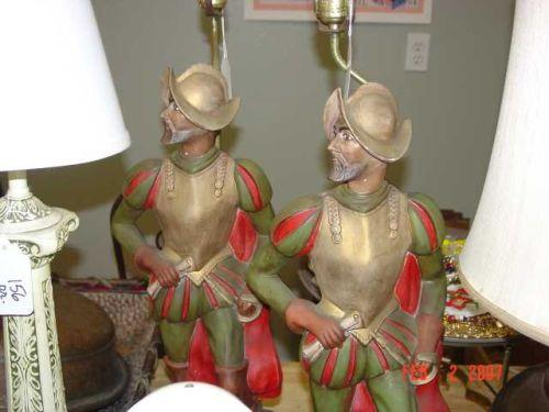 Pair of European plaster Conquistador table lamps, One (1) base with damage, 37"