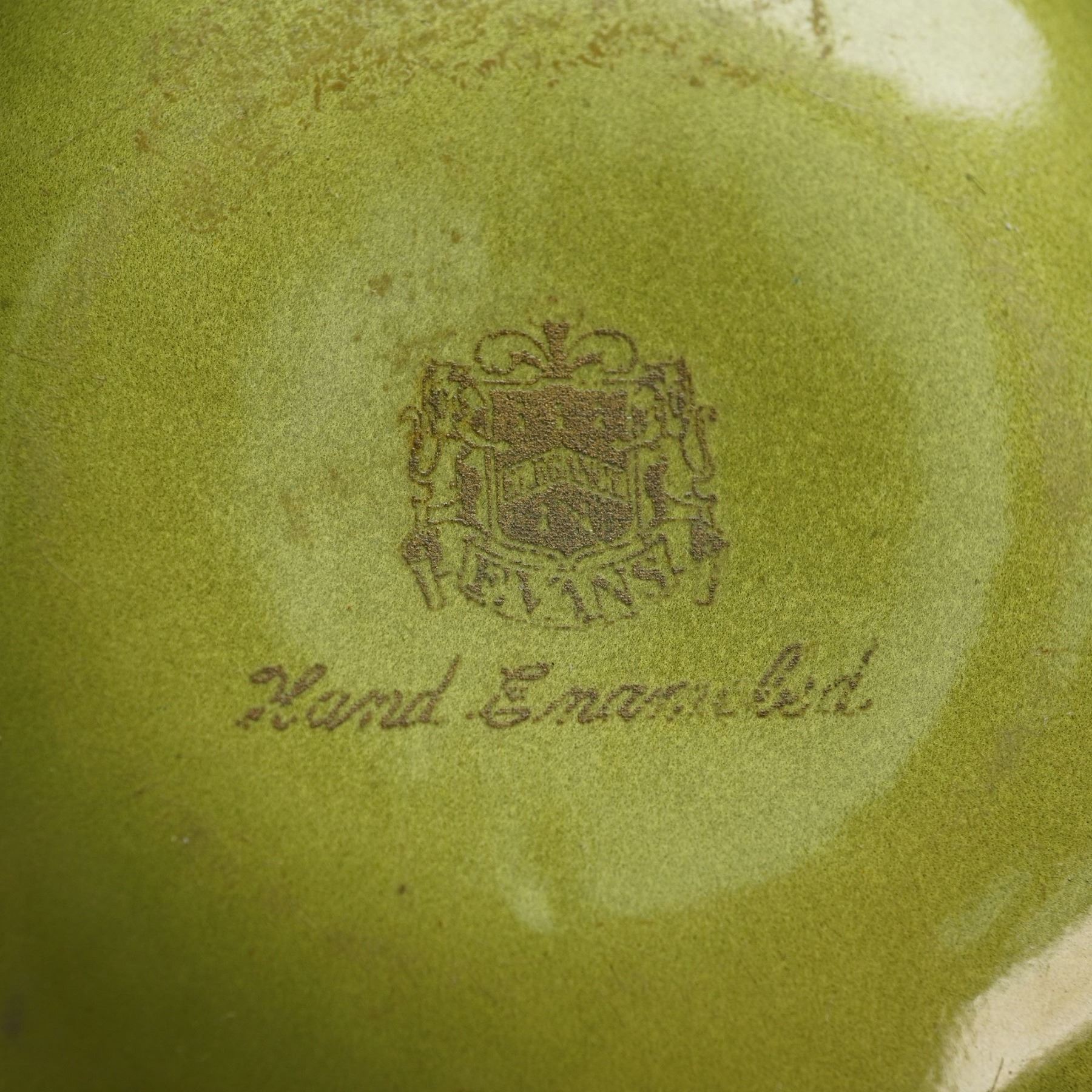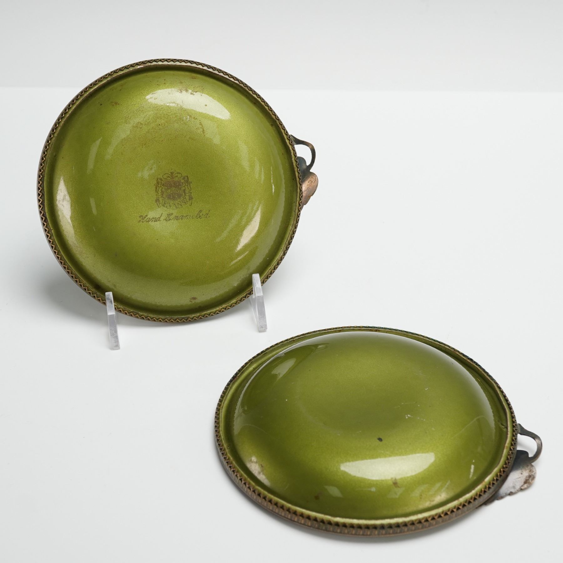 Each dish features a rich olive green enamel finish over metal with a braided rope edge and sculpted leaf accent. Marked on the underside with the Evans crest and Hand Enameled stamp. Likely mid 20th century, these elegant pieces blend Art Deco and transitional design elements, suitable for use as ring trays, coin dishes, or vanity accessories.