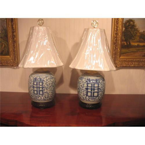 Pair of export Chinese vases converted to lamps, resting on carved wooden bases. These jars have the double happiness symbol typically granted to newly married couples to wish them continued happiness. Silk Shades