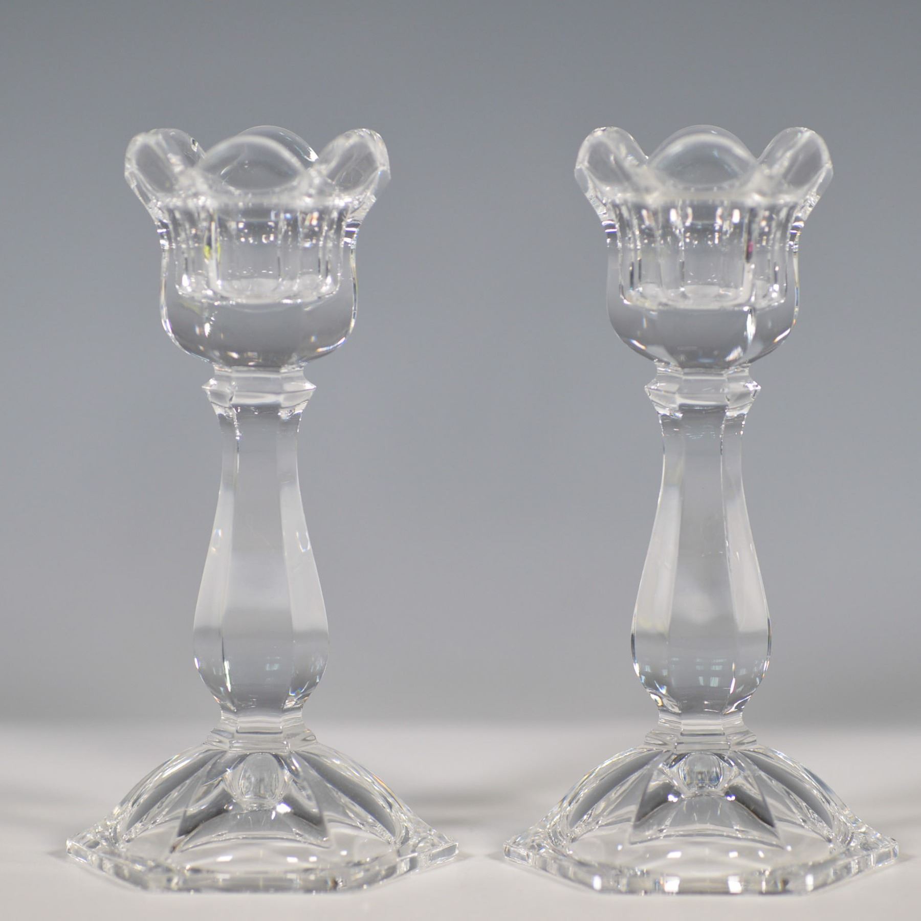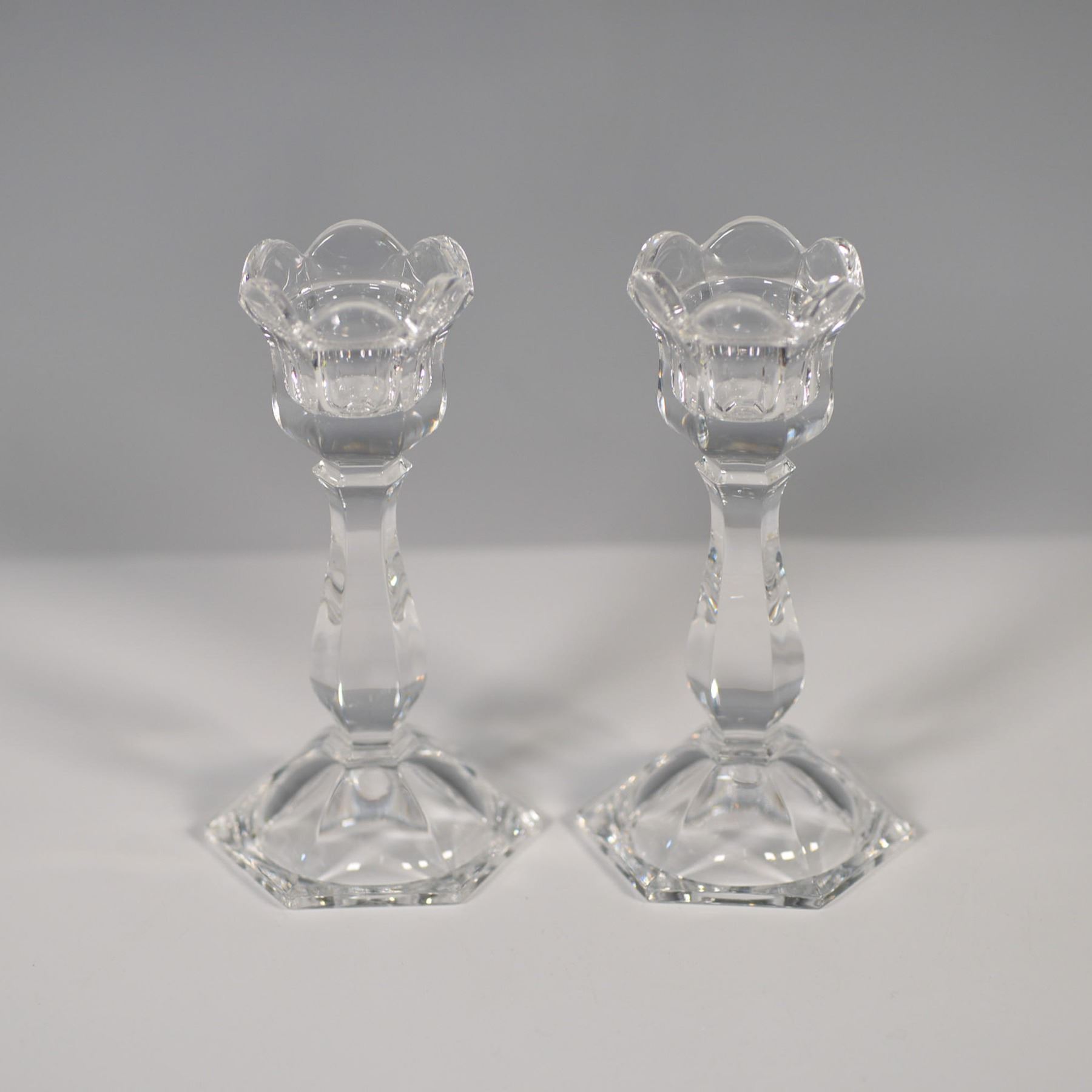 This elegant pair of faceted crystal candlesticks features a refined design with hexagonal bases, sculpted stems, and delicately flared crowns. The precision-cut detailing enhances the reflective brilliance of the crystal, creating a timeless and sophisticated aesthetic. Perfect for formal settings or as a decorative statement, these candlesticks showcase expert craftsmanship and enduring appeal. A stunning addition to any collection or home decor.
