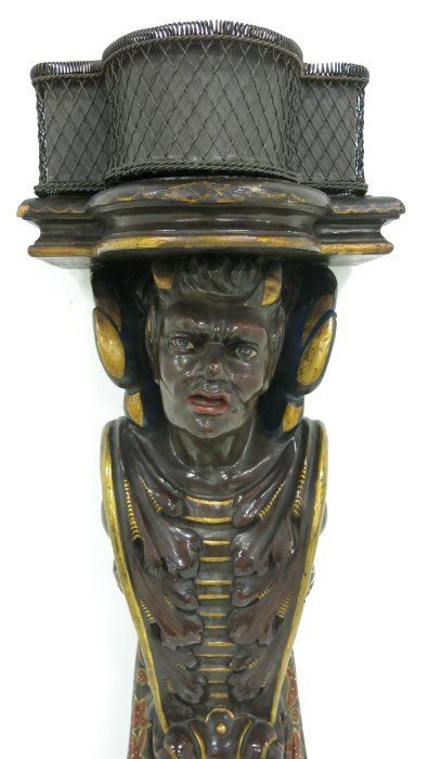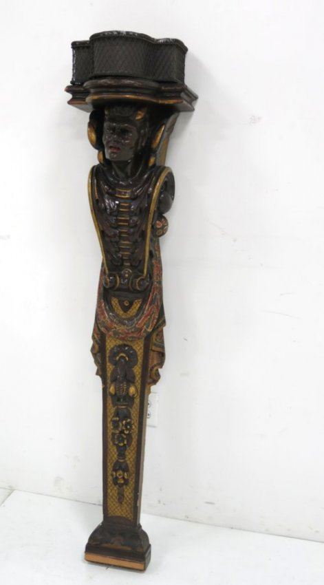 Magnificently carved with metal floral baskets on top. Approx. 59" H 13" W x 12" D.