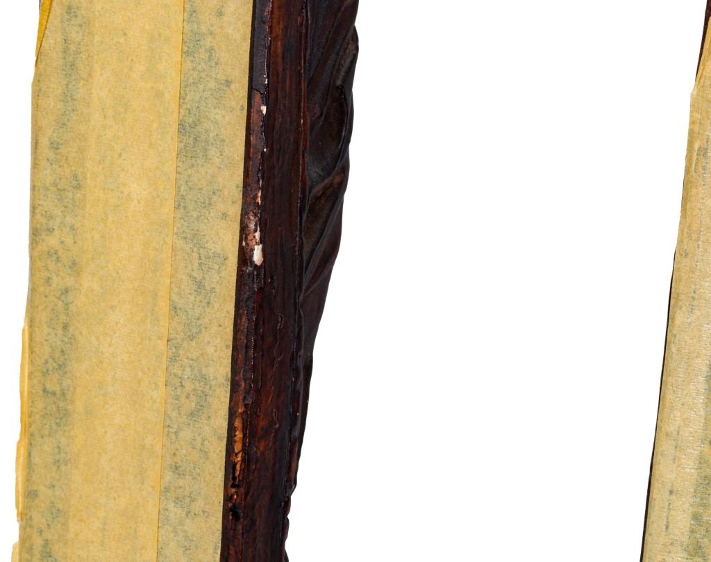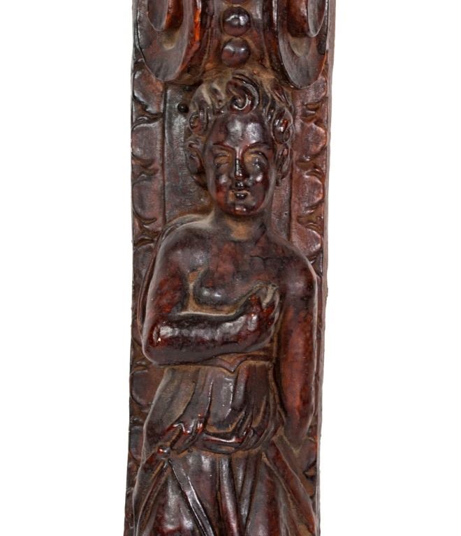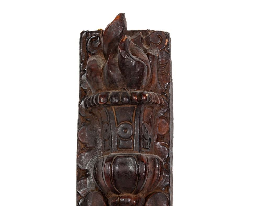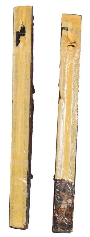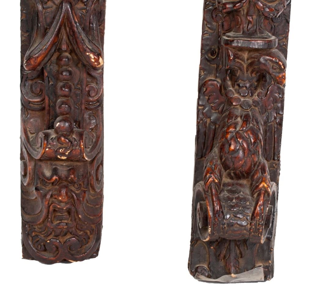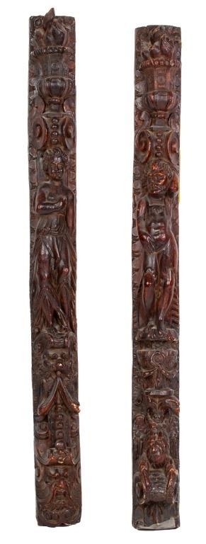 Item/Description: Painted or stained plaster architectural elements. One male figure and one female figure, both with torches atop the heads. Female element features green man face and bear or lion below her feet, Male is standing on a large (once) two-headed bird. No noticeable makers marks.