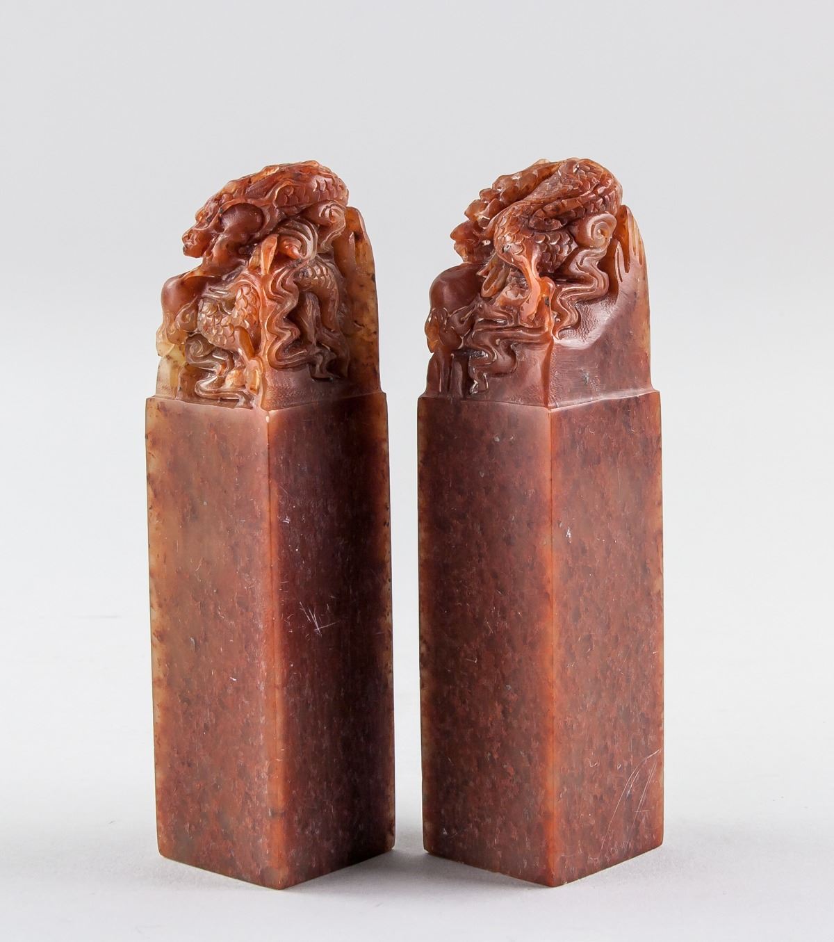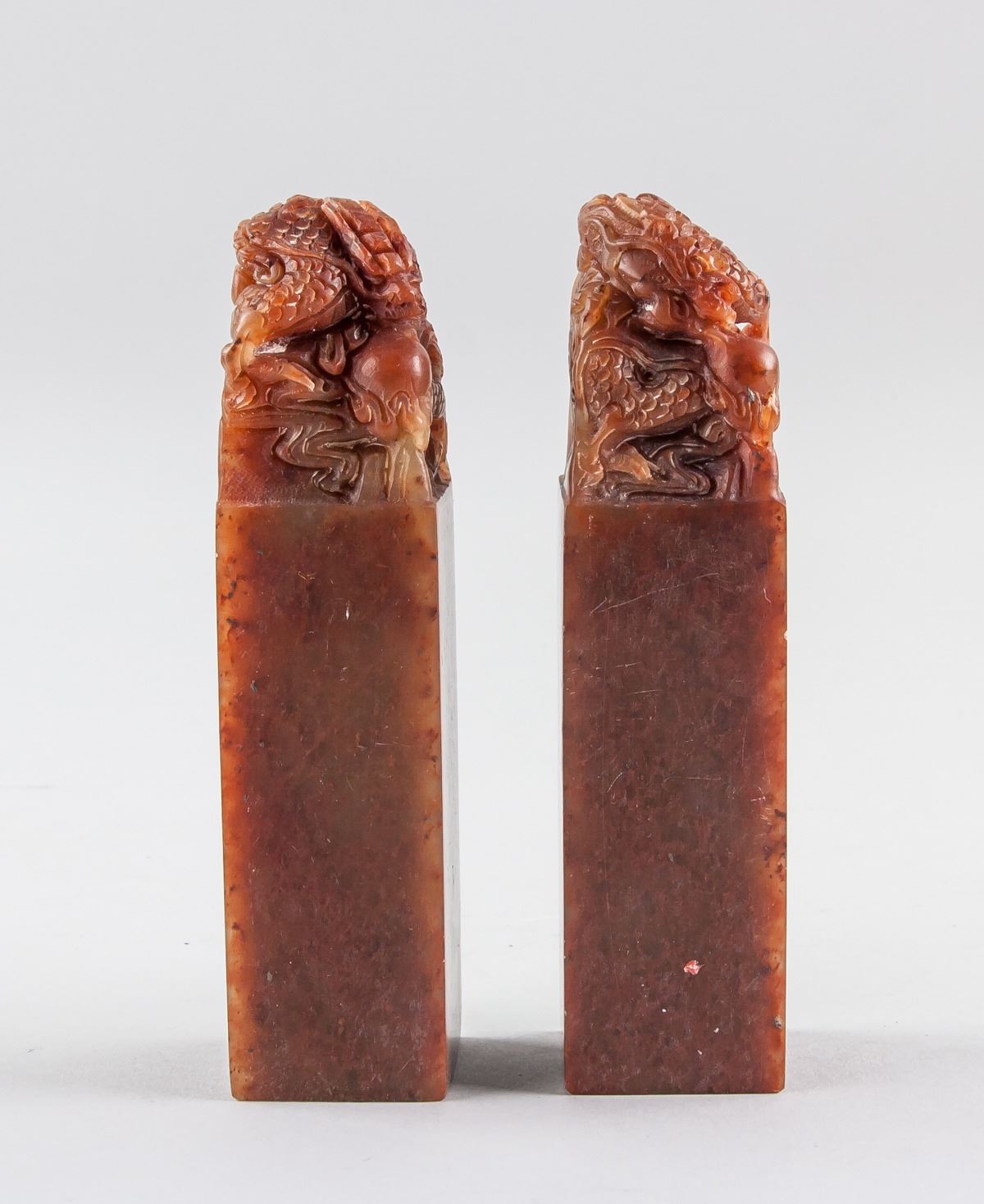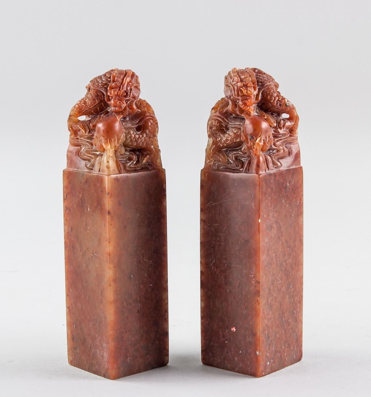 Pair of Chinese fine shoushan stone carved seal, of square seal section, surmounted by a couching dragon blowing the ball, empty seal face, 12.5 x 3 x 3 cm, 629 grams