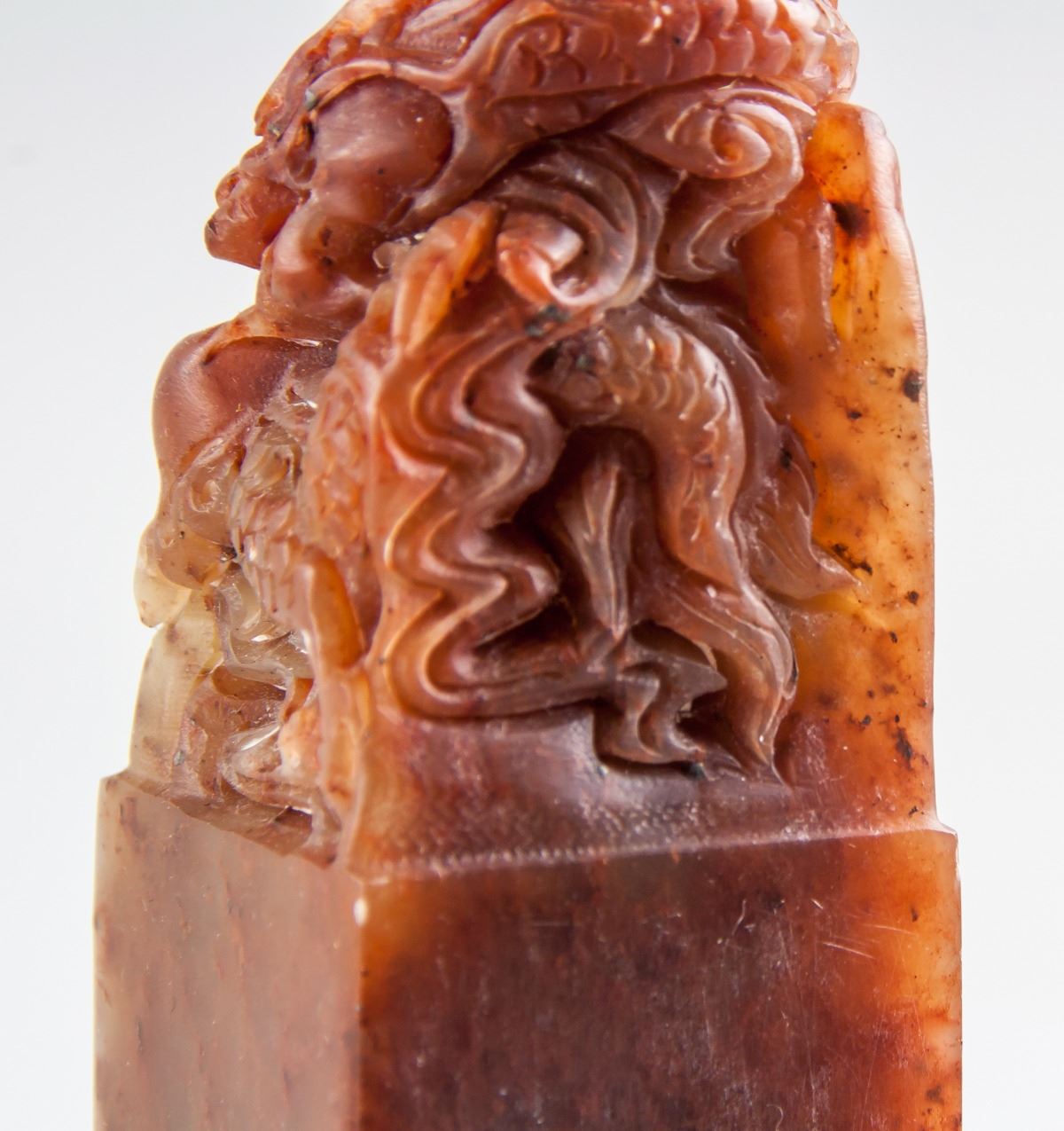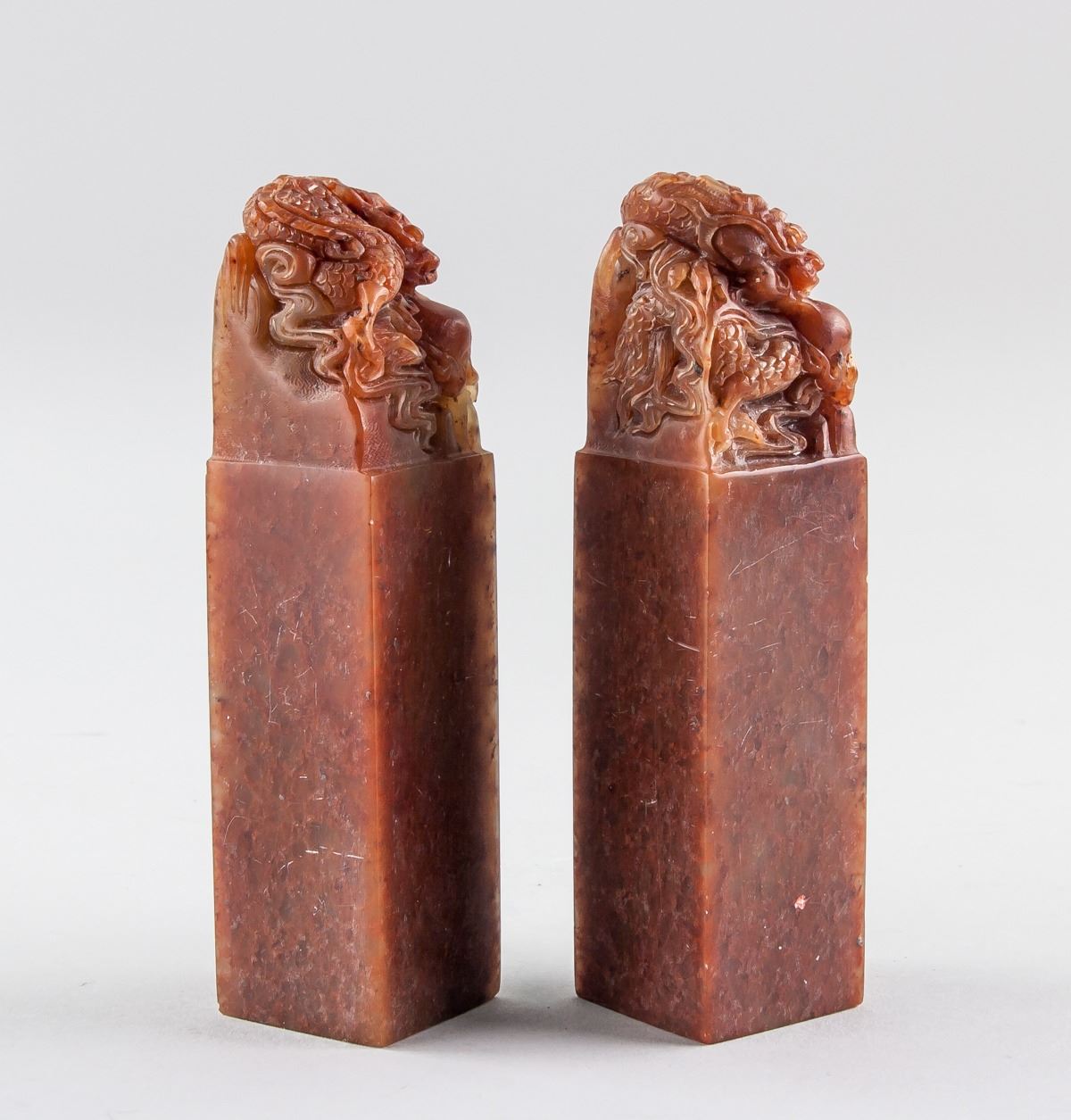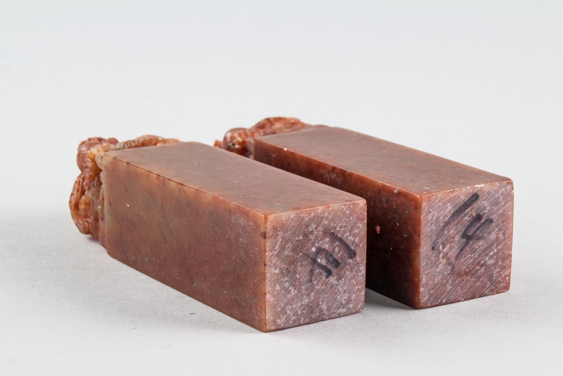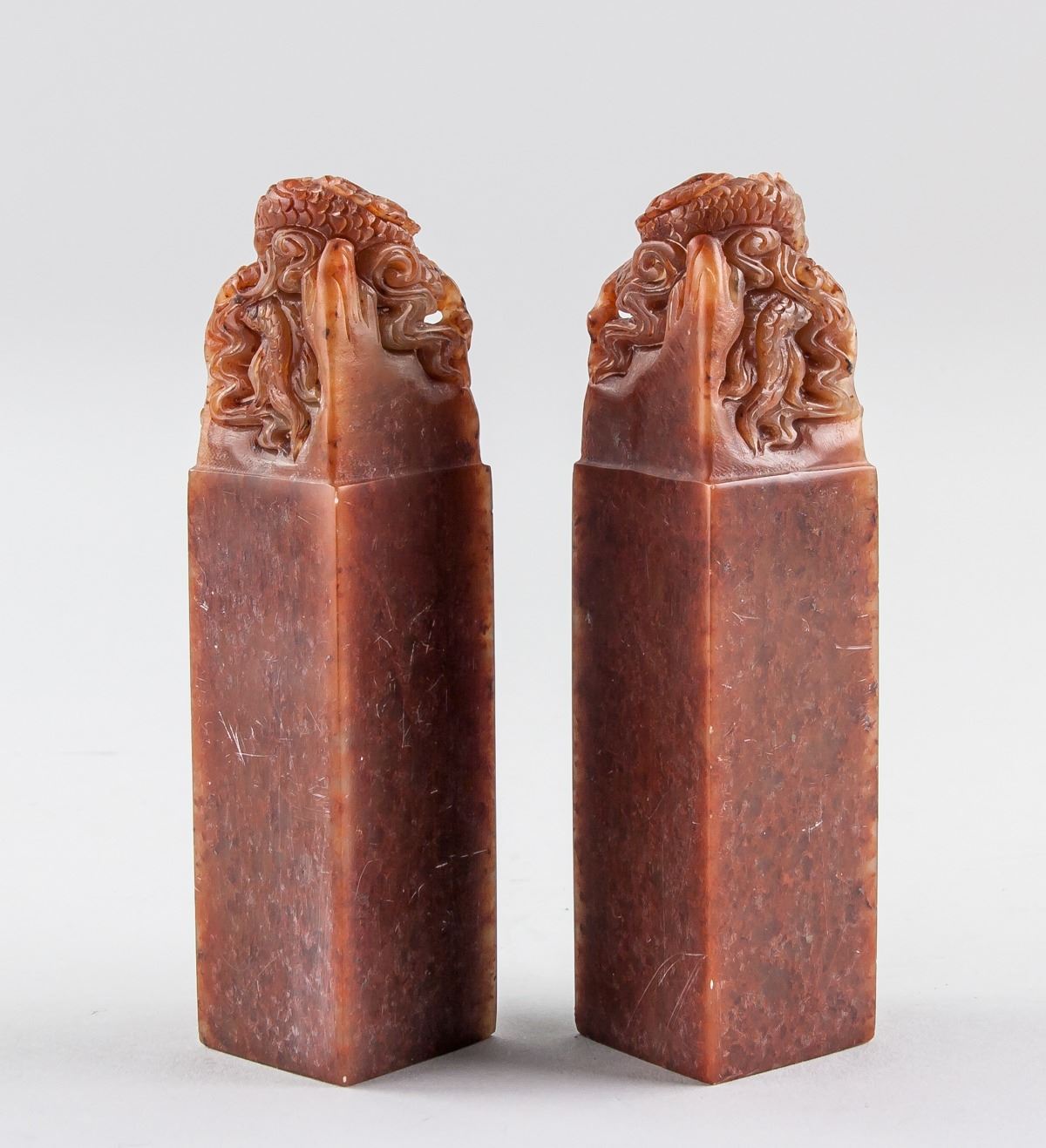 Pair of Chinese fine shoushan stone carved seal, of square seal section, surmounted by a couching dragon blowing the ball, empty seal face, 12.5 x 3 x 3 cm, 629 grams