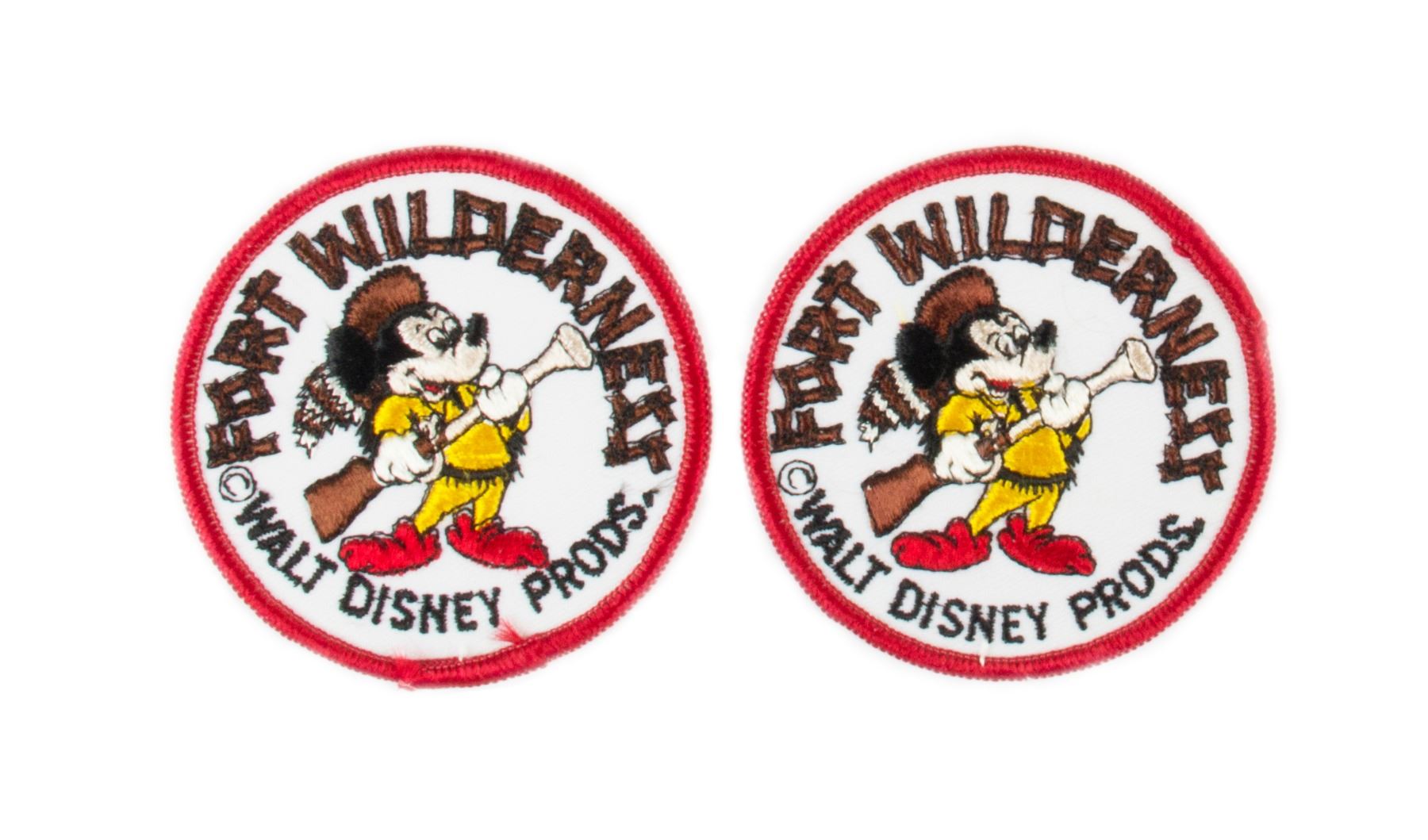 (Disneyland, c.1970s) A pair of souvenir patches from Disneyland's "Fort Wilderness" on "Tom Sawyer Island". The patches feature a Frontierland-inspired Mickey wearing a coonskin cap and holding a musket. Both patches measures 3" in diameter and the condition is very good.