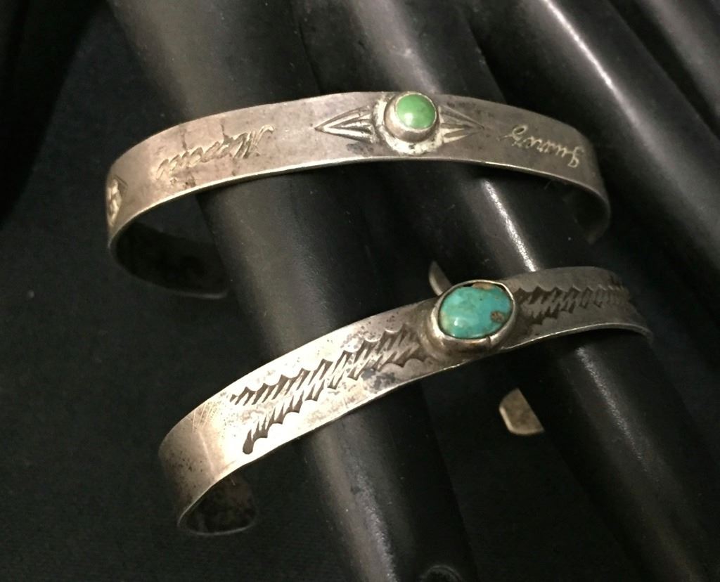 Maker: Unknown, one is probably Navajo, the other may be from Mexico or may be Navajo made. Approx. Age: Circa 1930s. Size: Smaller size bracelets for a small lady or children. Together they weigh 10.6g. Condition: Pretty good. Additional Info: Old natural turquoise settings, one has “whirling logs” designs and is stamped Juarez (probably sold to tourists in El Paso - Juarez area back in the day. Tested as sterling silver. Please look closely at the pictures - they are an important part of our description. Shipping: There will be a $5 handling / packaging fee for shipping this lot. The actual cost of postage will be added on top of that.