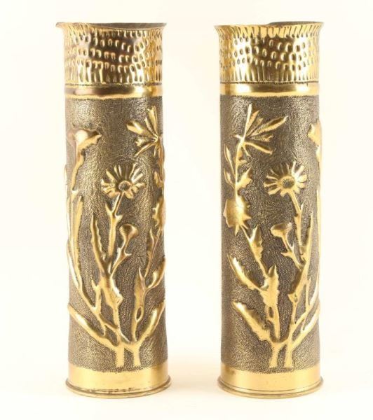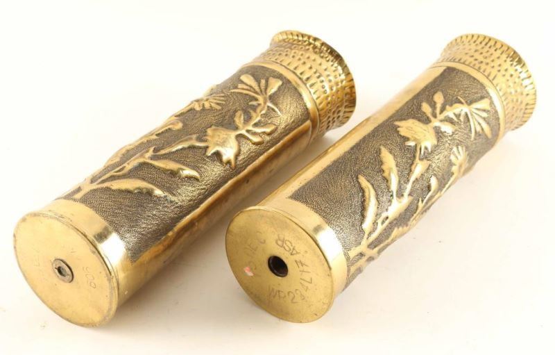 Decorated and formed for flower vases in post WWI trench art motifs. Polished