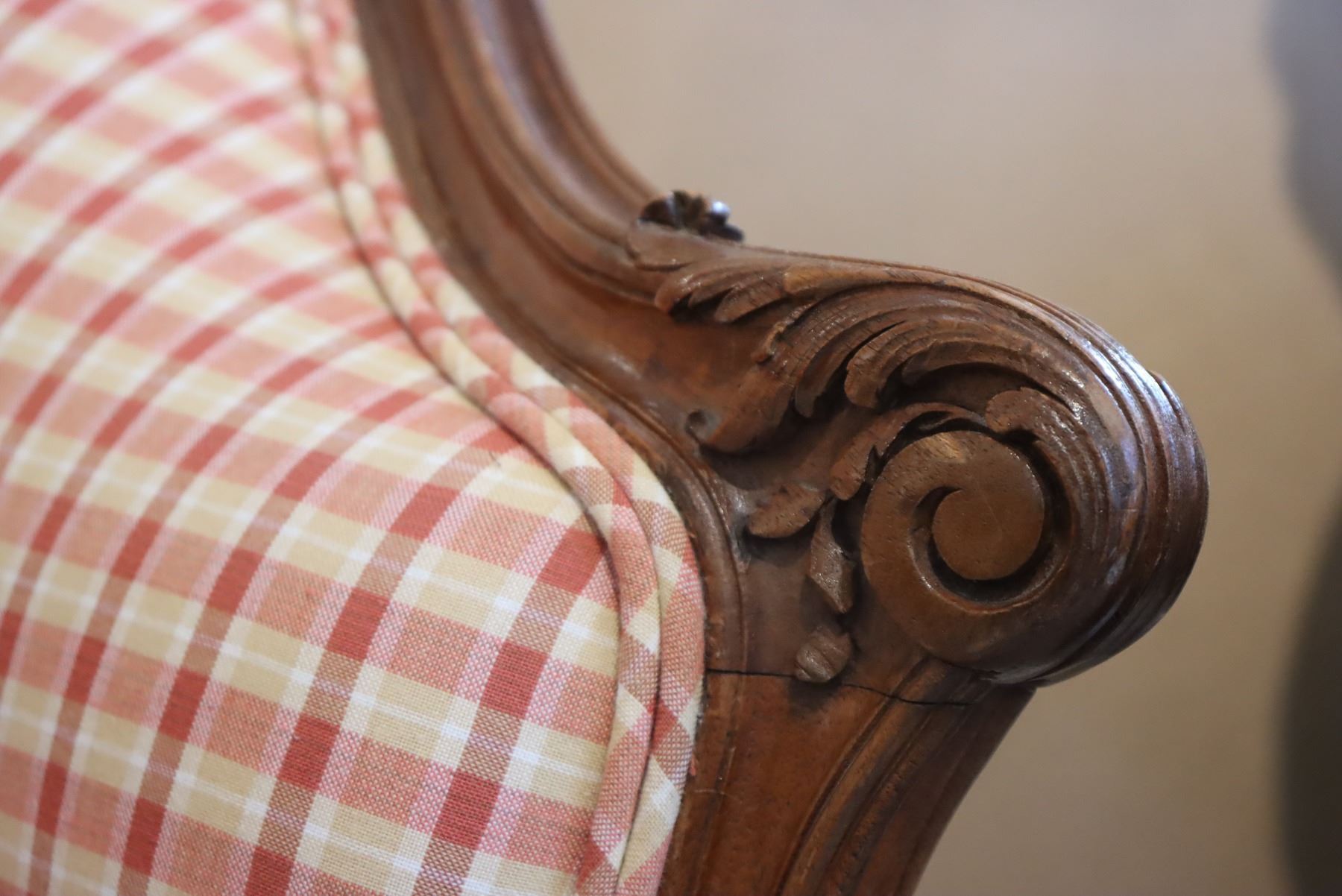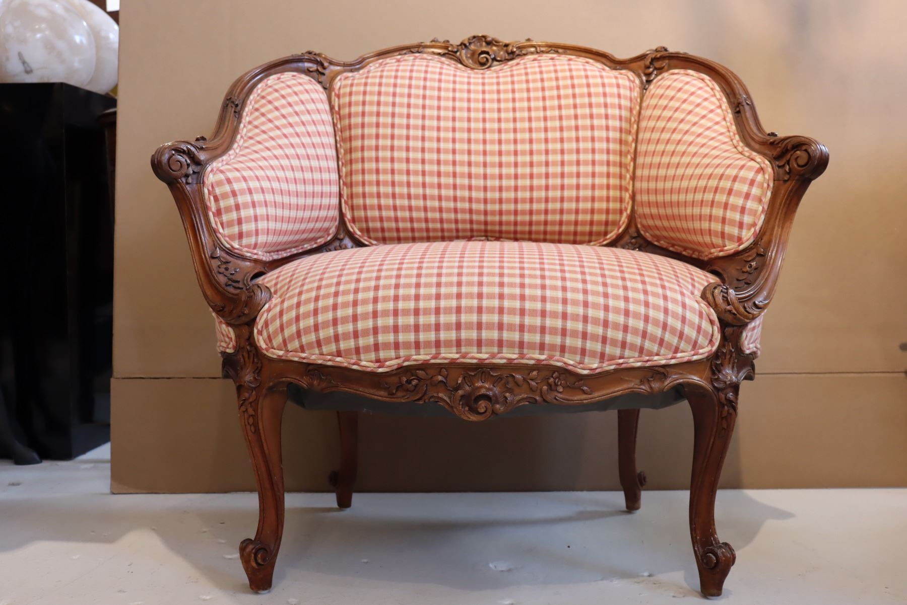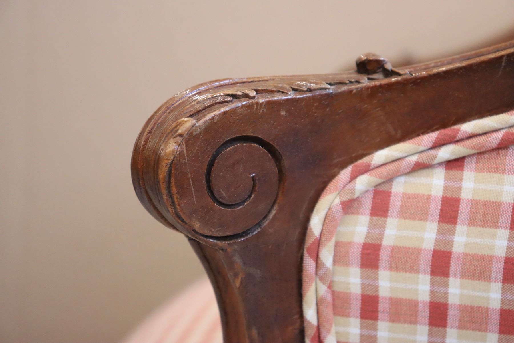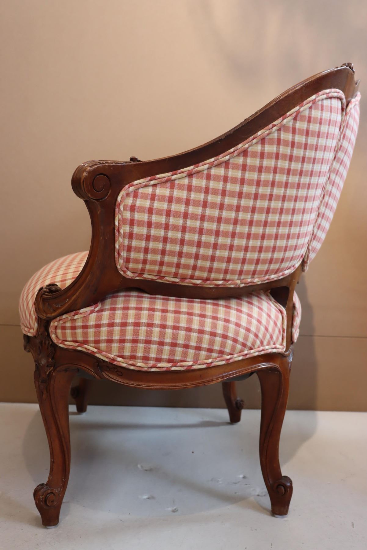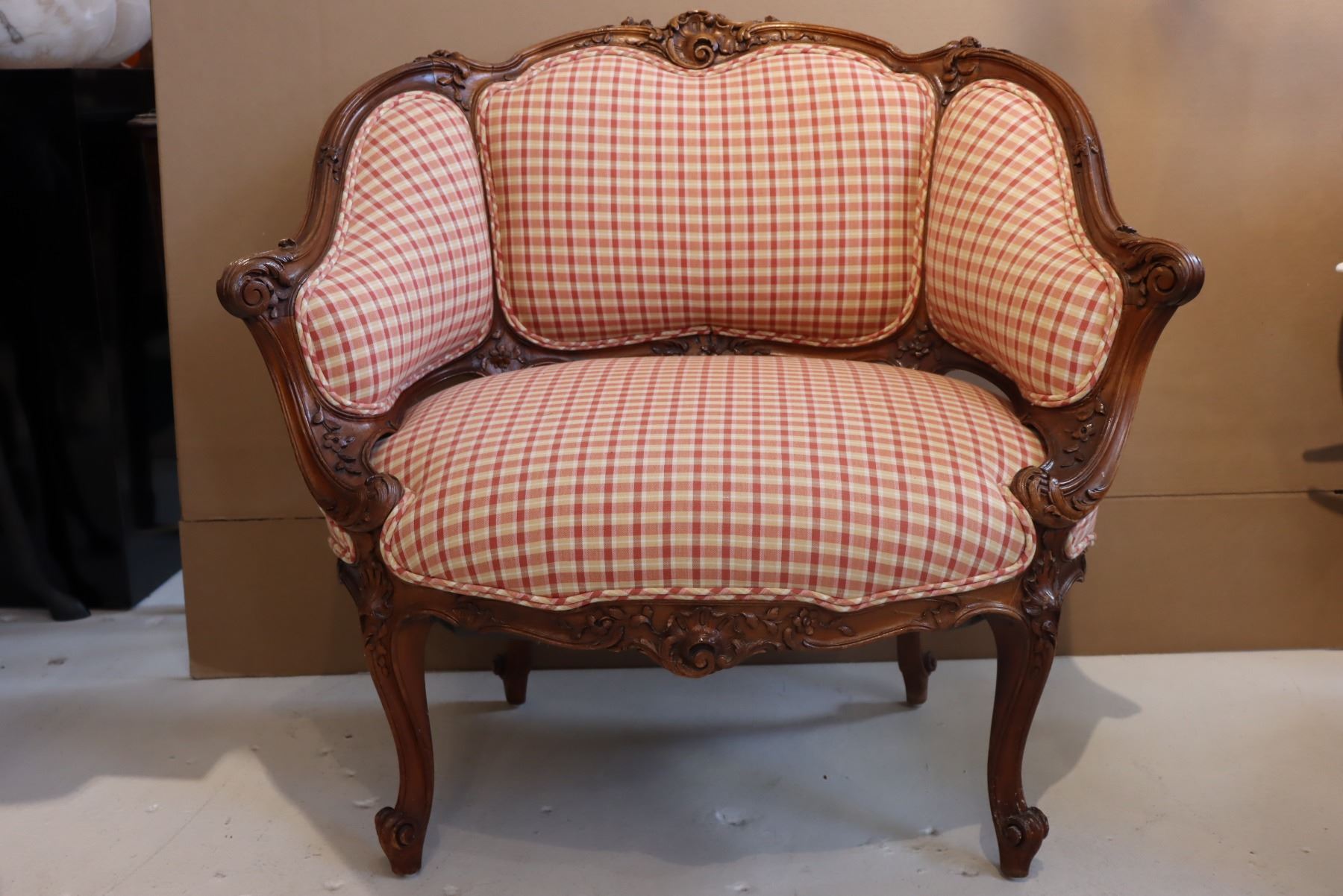 Exquisitely carved French Bergere, plaid upholstery, scroll foot, carved crest. Fantastic condition.