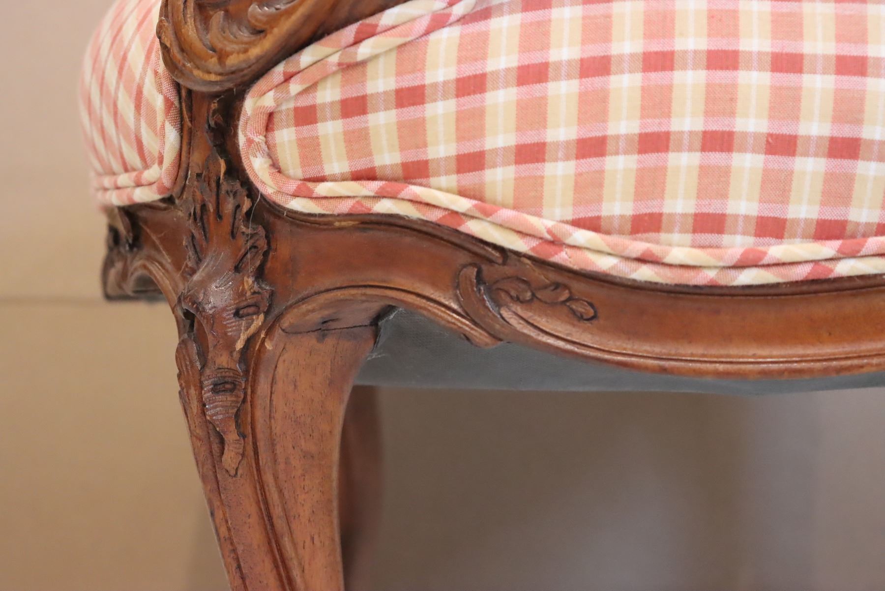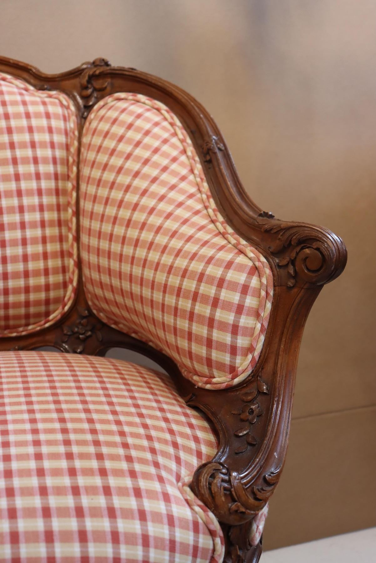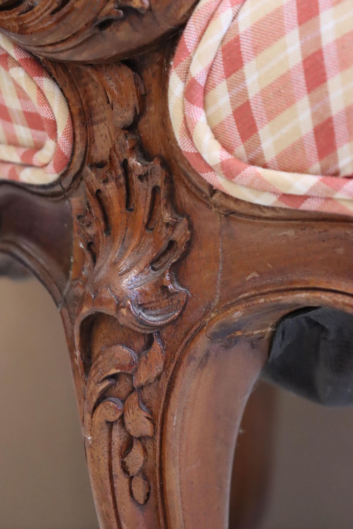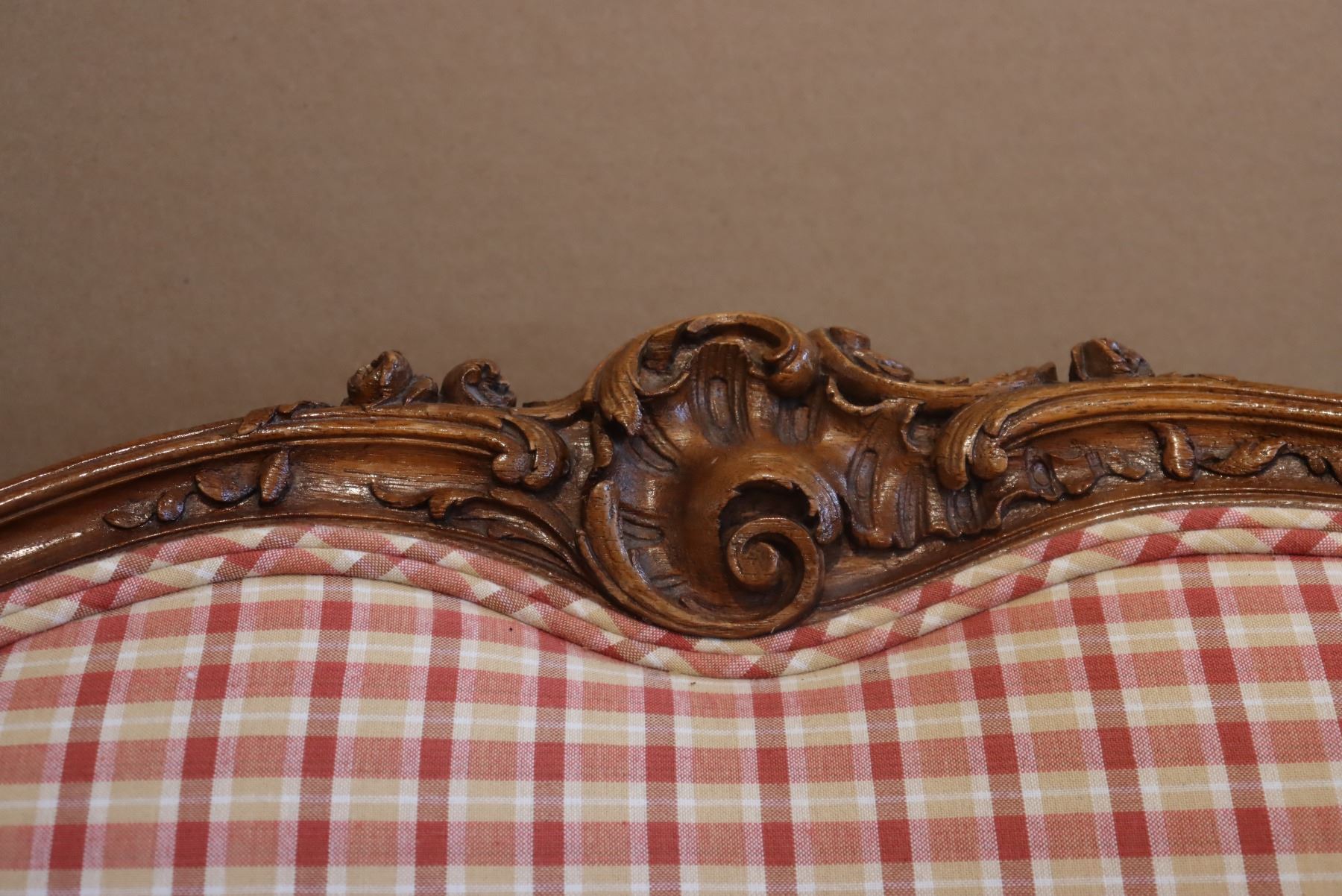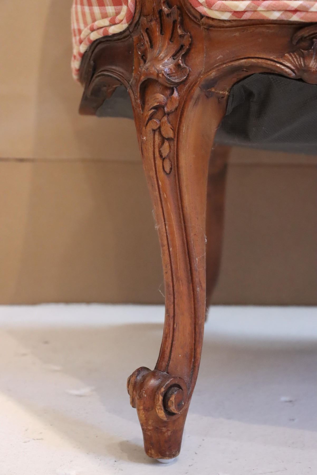 Exquisitely carved French Bergere, plaid upholstery, scroll foot, carved crest. Fantastic condition.