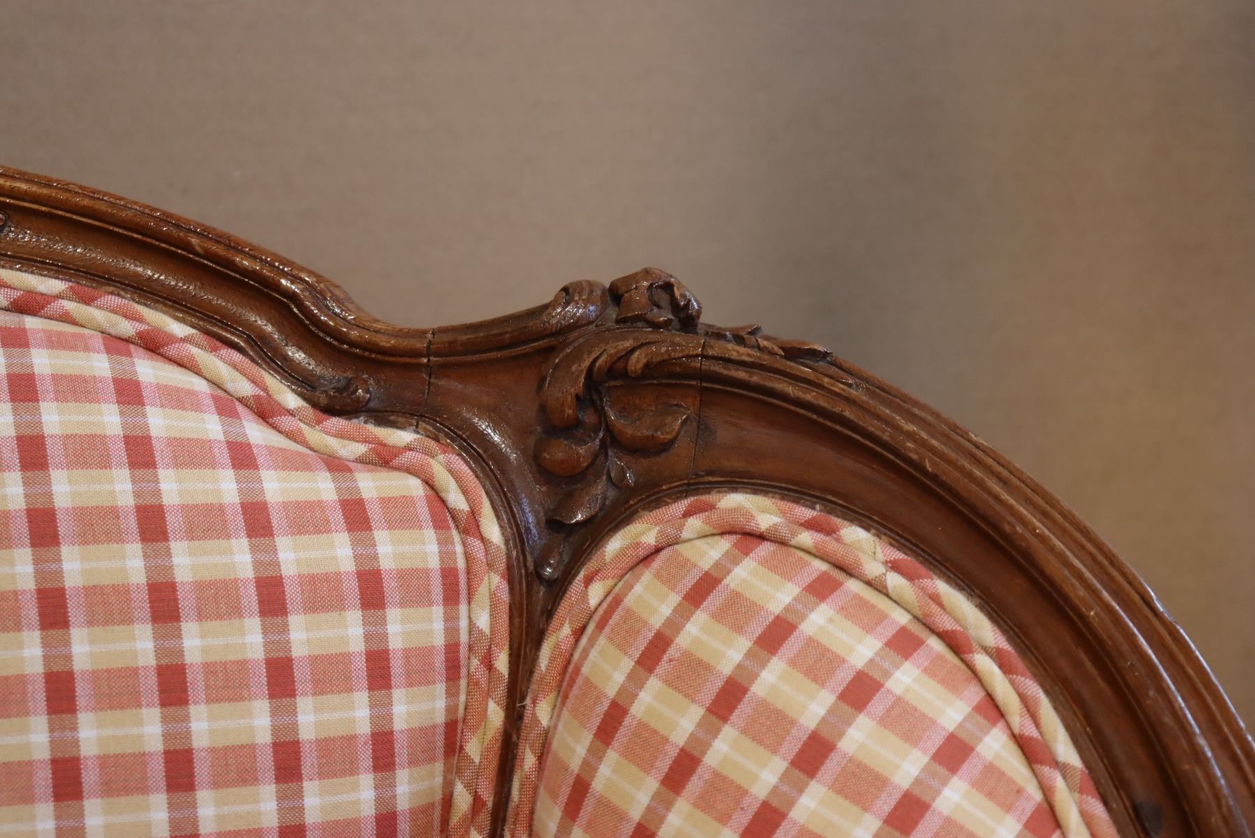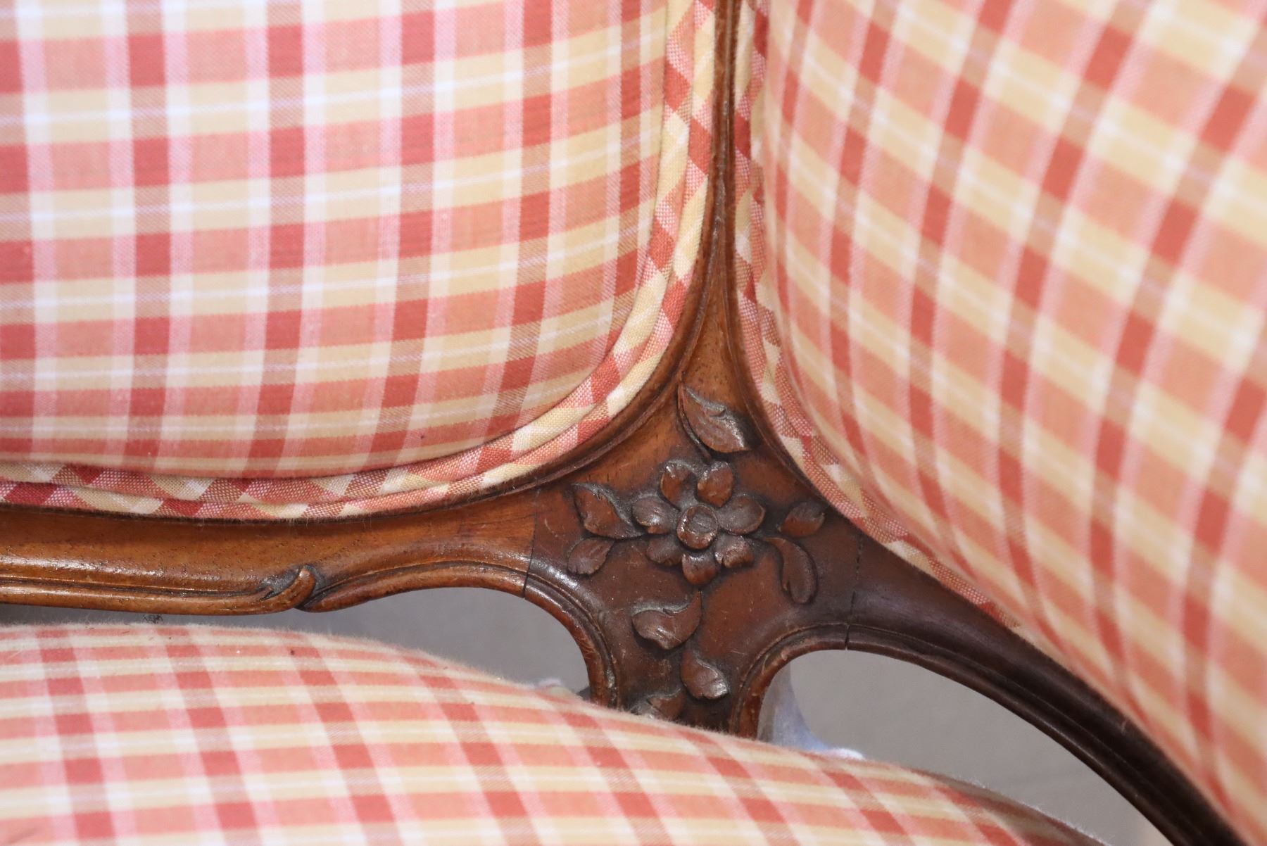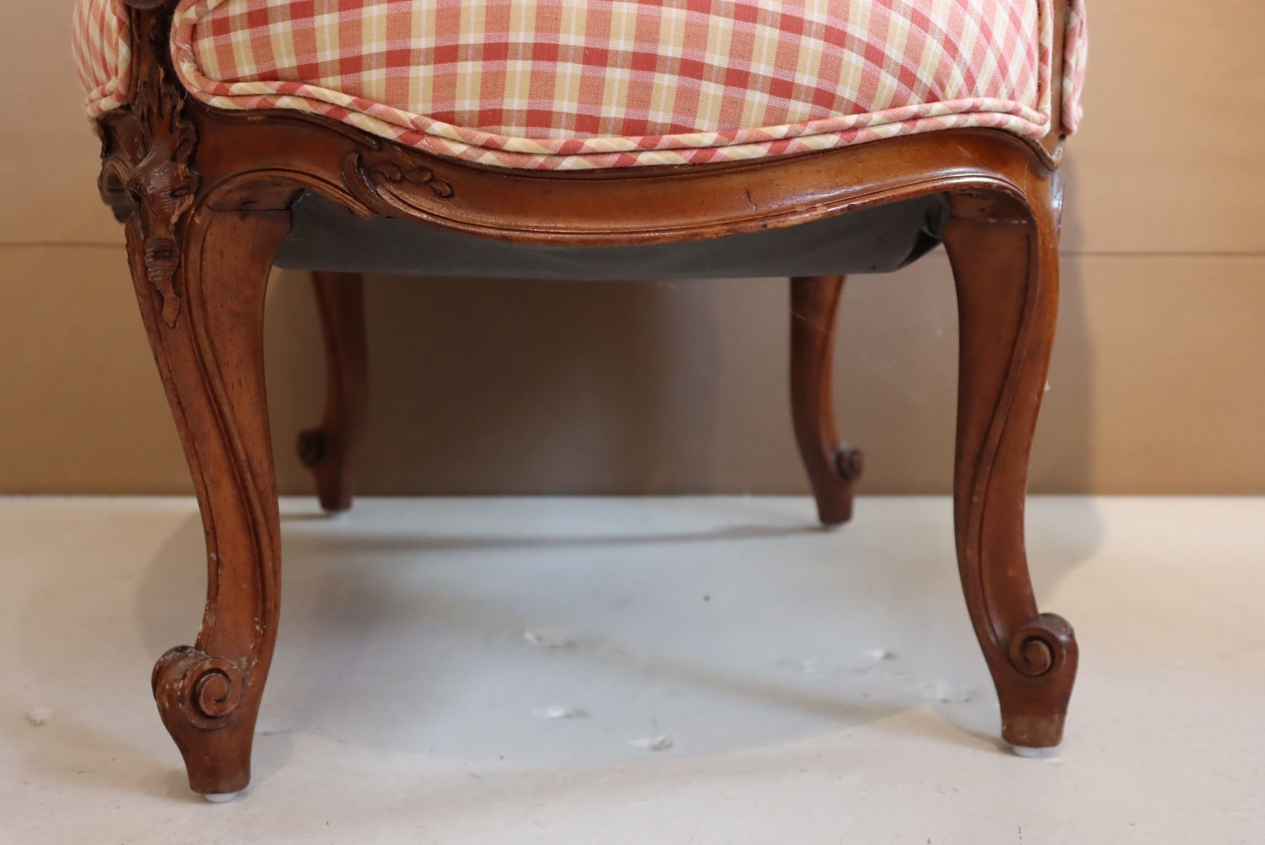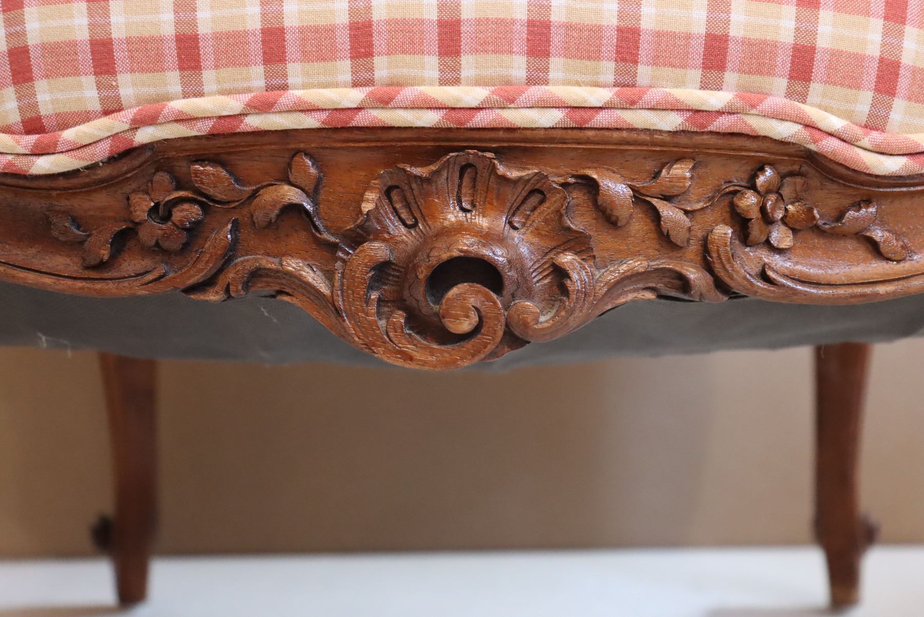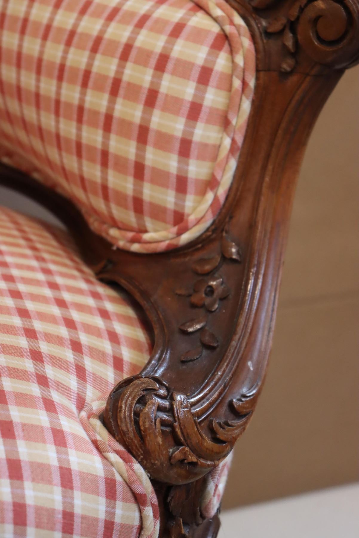 Exquisitely carved French Bergere, plaid upholstery, scroll foot, carved crest. Fantastic condition.