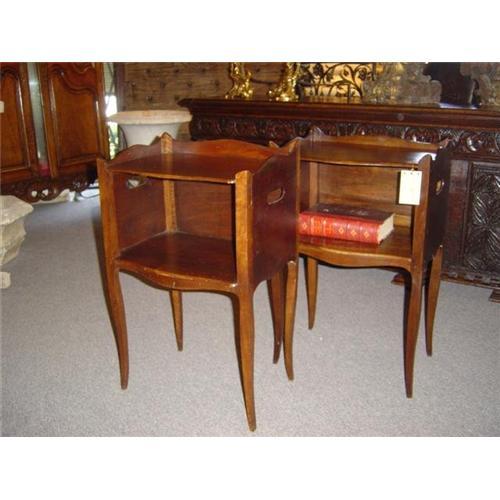 This is a pair of Louis XV style night tables from France. The wood used is Walnut, and the condition is excellent. The tables feature an open front and convenient side handles. Please contact for more pictures. Thank you--Le Louvre Antiques